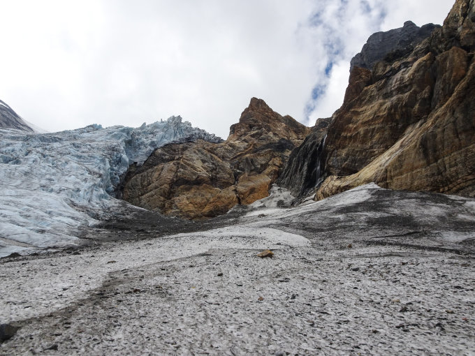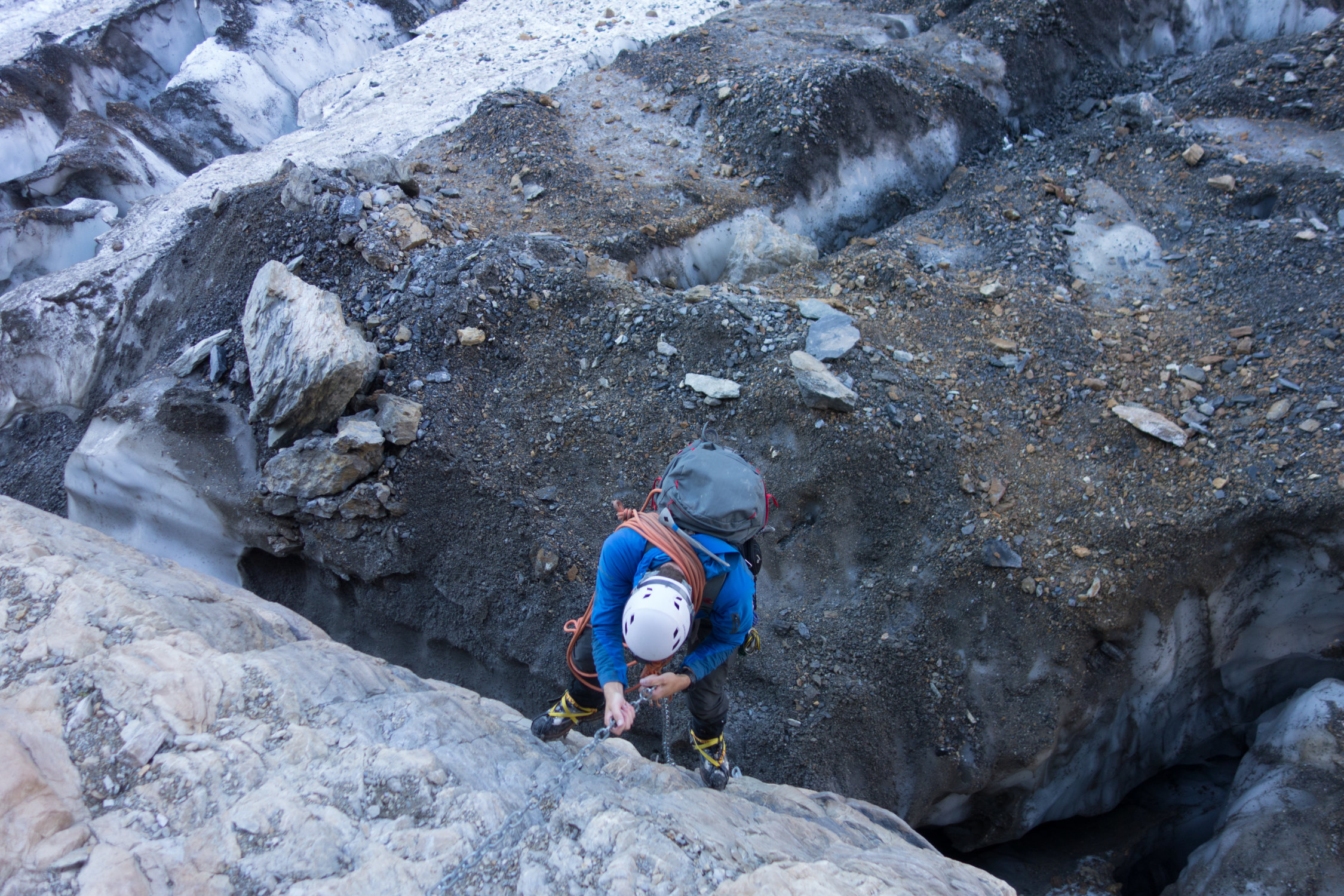 Übergang auf den Gletscher nach gelber Wand ist gut zu machen, jedoch ist die Randkluft weit offen. Abstand zwischen Fels und Gletscher knapp ein Meter, darunter geht es >10m ins Nichts. Kette und Eisenbügel reichen weit genug aber es kostet Überwindung.