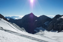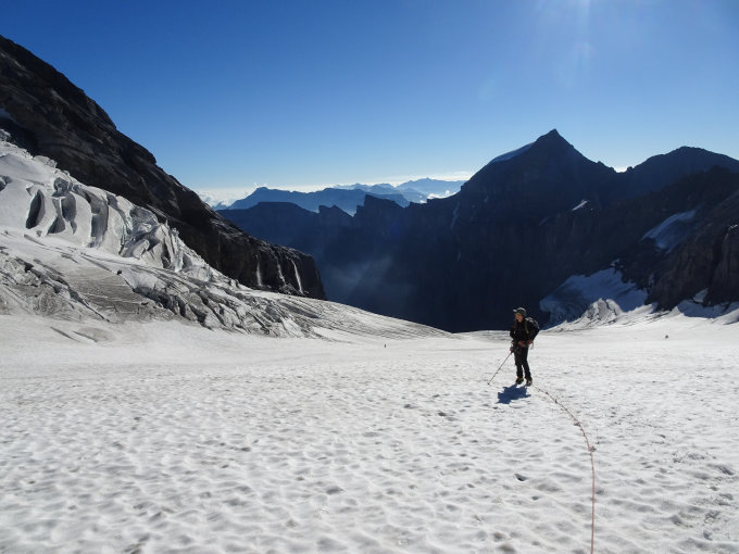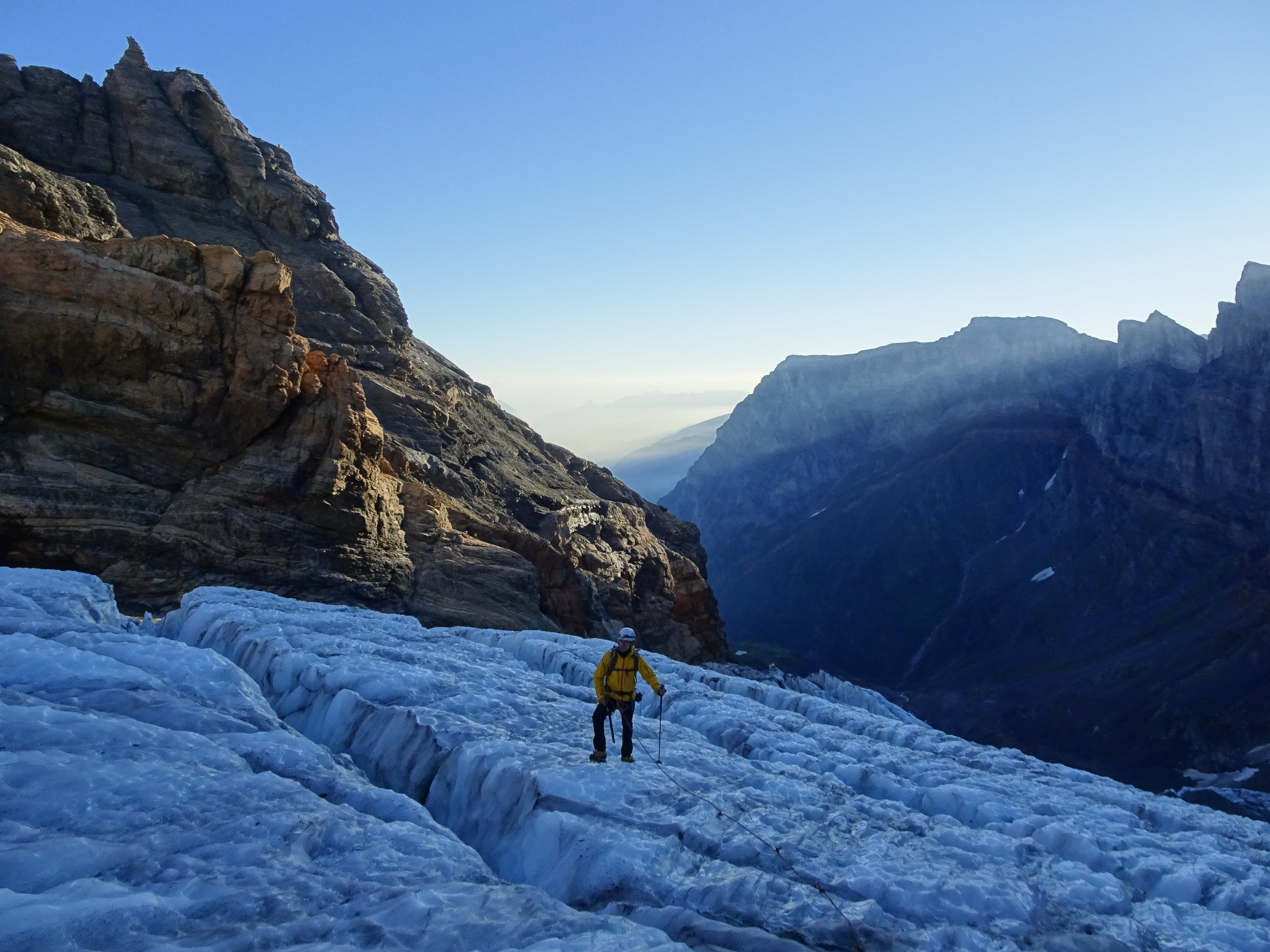 Start um 3:30 Uhr ab Fridolinsütte bei gut +10°... Zustieg bis zur Grünhornhütte trocken. Abstieg trocken und einfacher Übergang auf den Gletscher. Wir sind direkt zu Beginn direkt Richtung Serak/grosse Spalten zwischen den Spalten durch und haben so den mühsamen Aufstieg rechts durch das Geröll vermieden. Das Firnfeld zur Gelben Wand ist am Ende in mehrere Stücke zerbrochen und es gibt keinen direkten Weg mehr bis an die Wand. Man muss nun rechts vom Firnfeld/Glestcher runter, rechts am oberen rechten Feld vorbei laufen und dann nach Links über das erste Stück Firnfeld über den Bach auf das Firnfeld zur Wand. Der Übergang zur Gelben Wand ist optimal ohne grosse Randkluft.