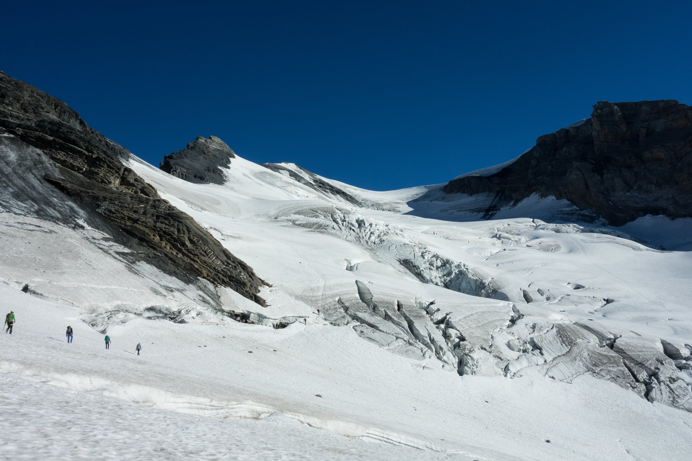 Die untere Spaltenzone ist sehr groß, ausgeapert mit 20m+ tiefen Spalten. Wir sind sehr früh über eine etwas grössere Eisfläche nach links gequert und dann sobald wir den Schnee erreicht hatten haben wir uns Richtung Seraks gehalten, um dann in grossem Abstand davor nach links zu drehen. Hier muss jedoch jeder seinen eigenen Weg finden.