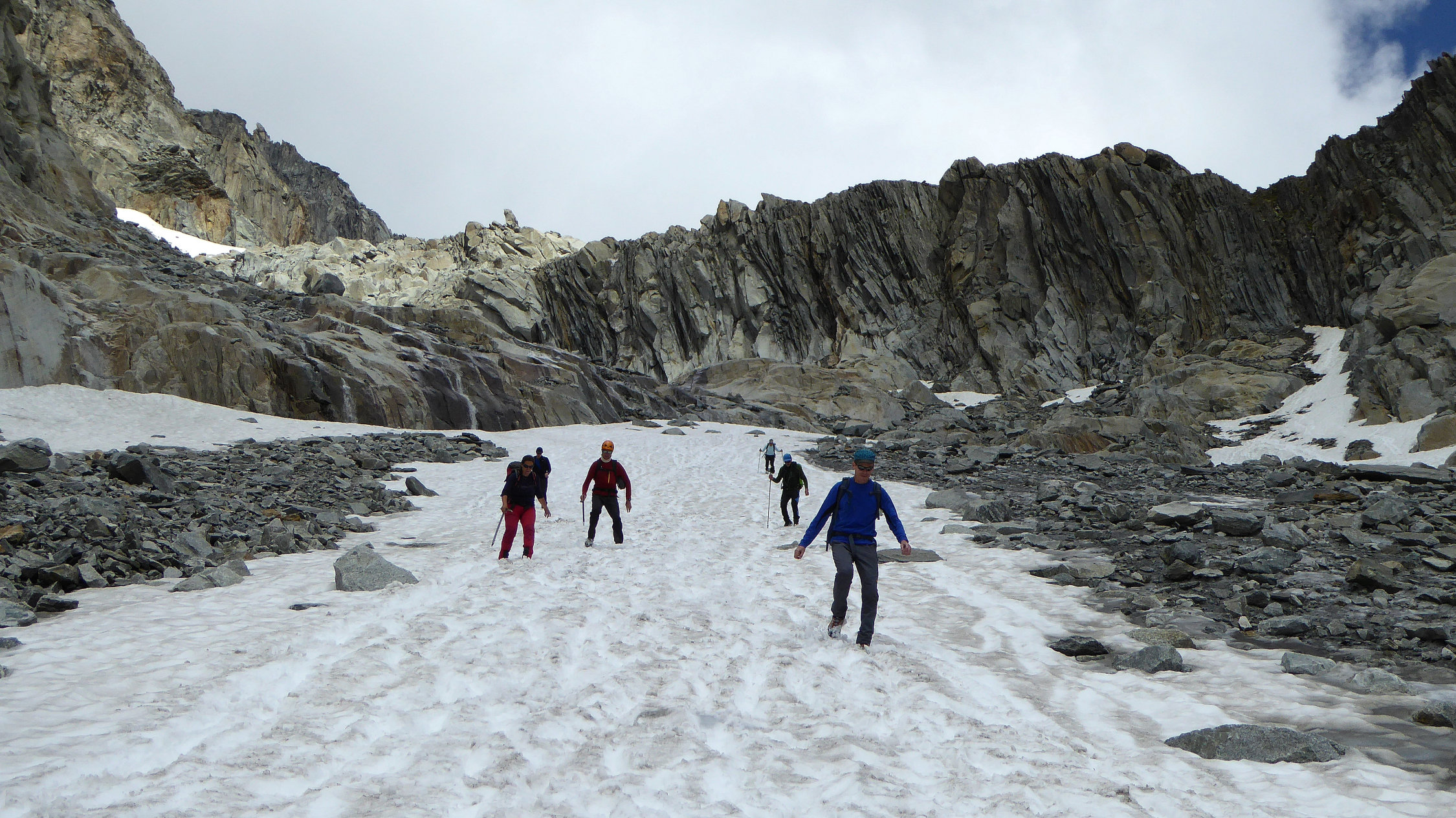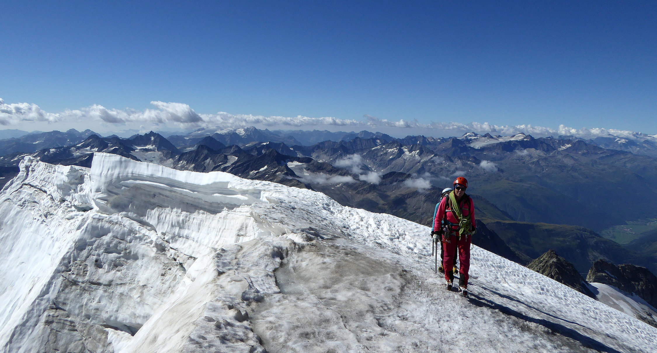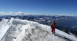Beste Verhältnisse im Aufstieg zum Sporn (Sidelengletscher teilweise blank mit Geröll --> Steigeisen, weiter oben dankbarer Trittschnee) und auch am Sporn selbst (Genuss pur). Eher anspruchsvolle Verhältnisse am Gipfelgrat, welcher oft ausgeapert und teilweise über kurze Strecken sogar blank ist (ging gerade noch ohne zu schrauben).