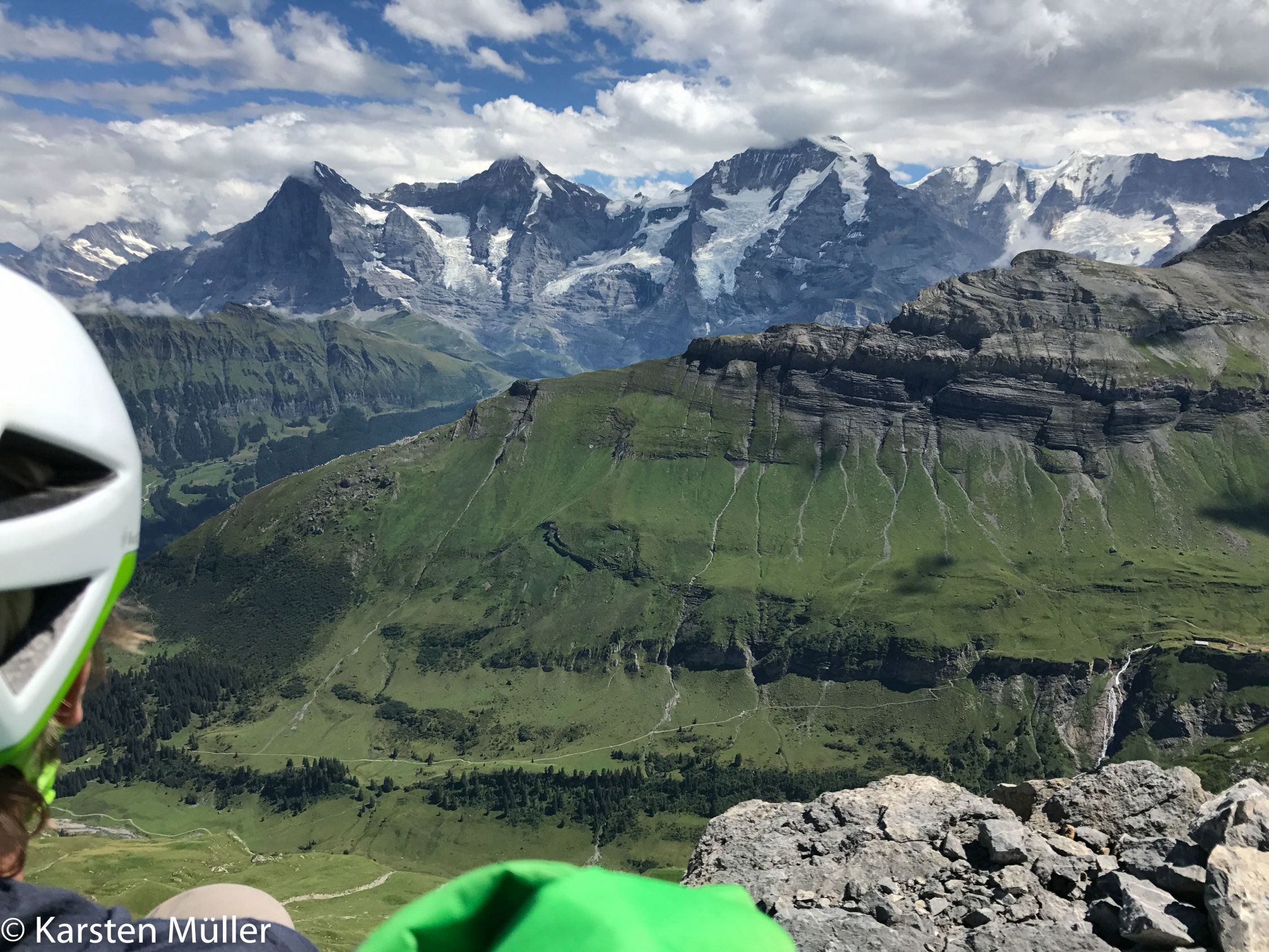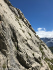 Wir haben von Isenfluh die erste Bahn genommen, 7.00, und sind auf dem bequemen Wanderweg an der Alp Suls (grosses Käselager) vorbei via Schwarz Chopf zum Einstieg gewandert, 2.5h. Dort stieg gerade eine 5-Personen-Seilschaft ein, sonst war ausser uns niemand am Fels unterwegs. Wasser gibt es aus dem Bach am Weg gut bis ca. 2000m.