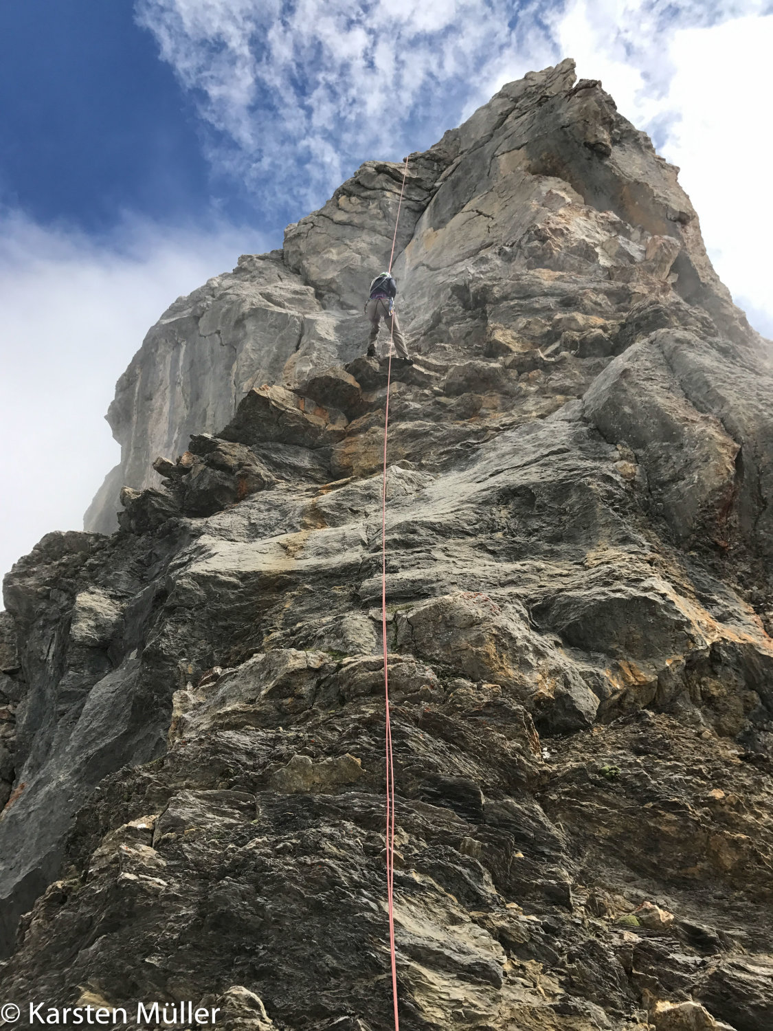Am grossen Lobhorn gibt es dann nochmals eine schöne Kletterlänge, und etwas Verwirrung in den Beschreibungen. Die obige Beschreibung ist m.E. die korrekteste, man kann frei auf grasigen Bändern bis zu der kleinen Verschneidung im ersten Felsriegel gehen und immer noch ohne Sicherung durch diese aufsteigen. Dann leicht rechtshaltend noch ca. 5m bis zum Stand, und dann hier direkt ziemlich senkrecht bis zum Grat, Stand an soliden Zacken. Von da fast horizontal auf teils schmalem Felsgrat, aber einfach zum Gipfel. Abgeseilt wird in westlicher Richtung, mit unserem 60m-Seil wird die 2. Abseilöse nach knapp 15m benötigt(!), mit 2x50 könnte man sich das sparen. Dann muss aber noch etwas auf bröckeligem schmalen Rücken abgestiegen werden, bei Nässe wahrscheinlich heikel, und bei der letzten Abseillänge sind 25m etwas knapp.