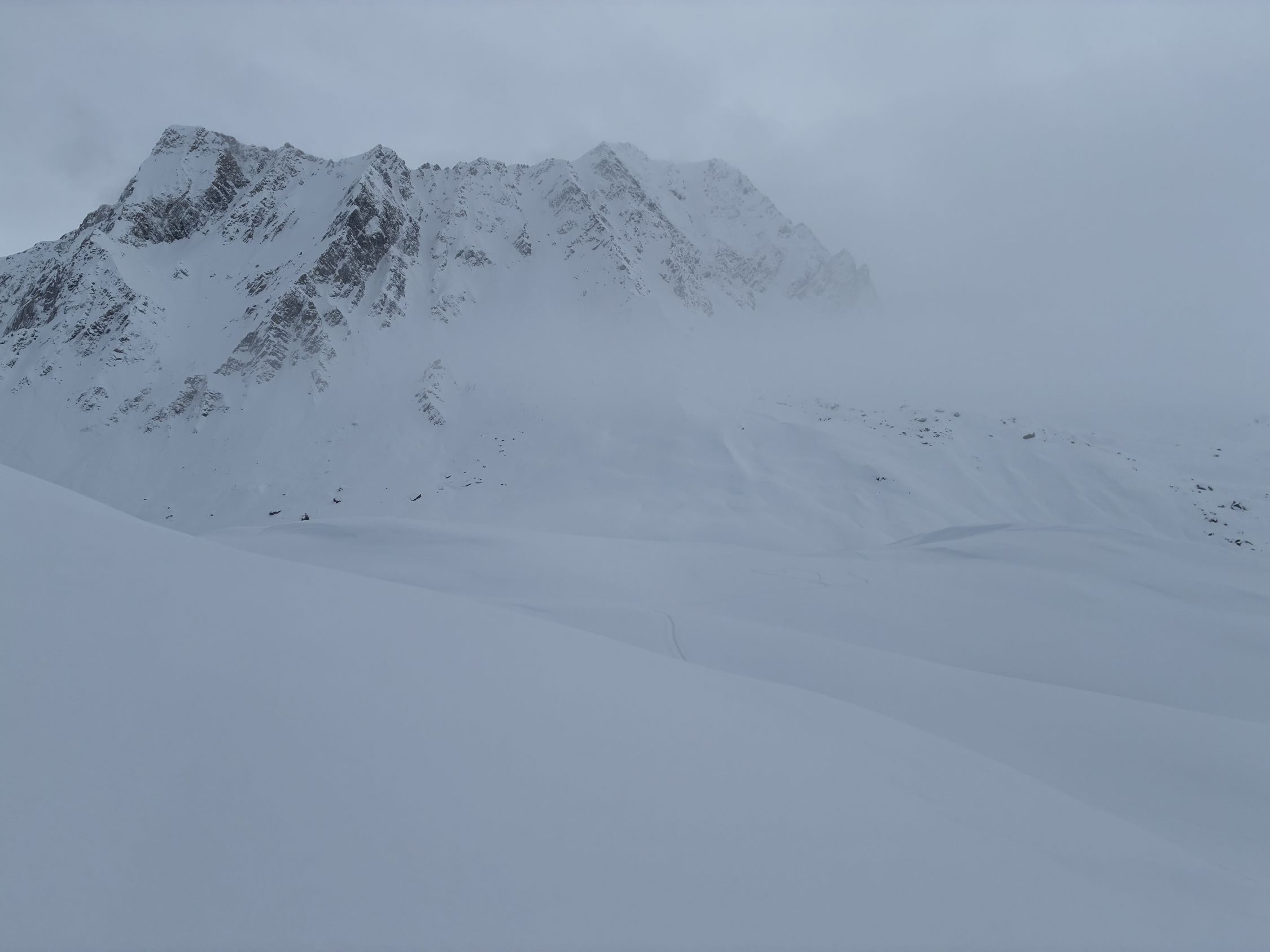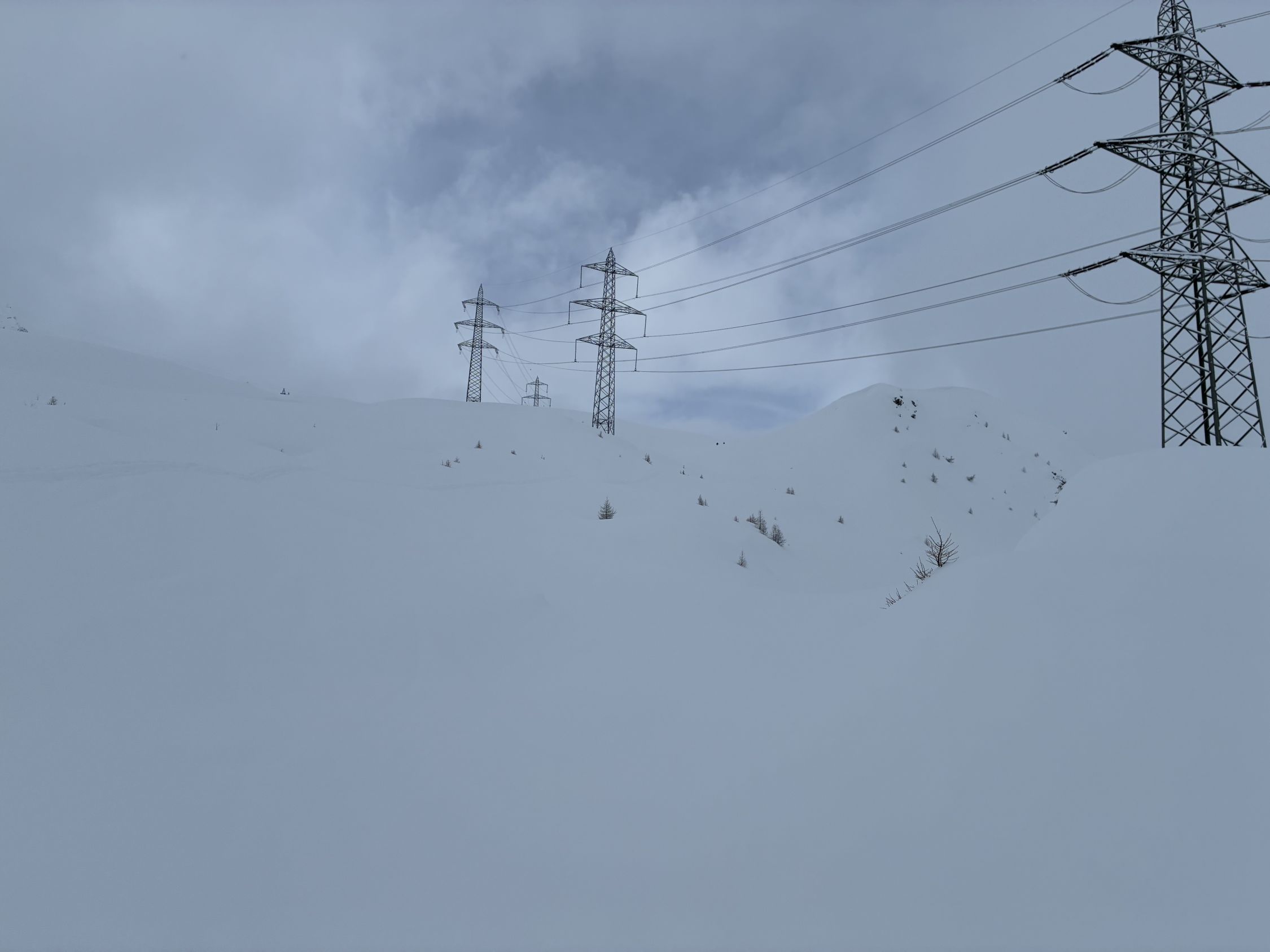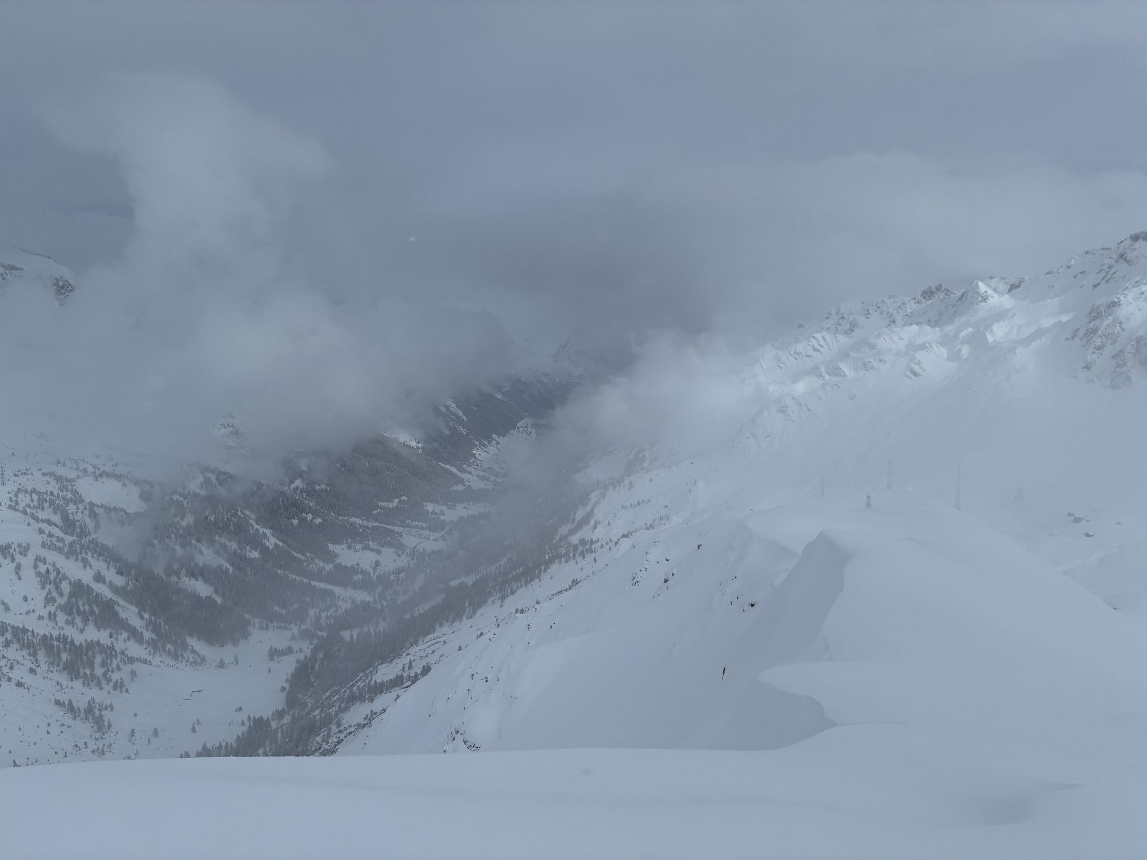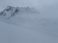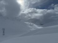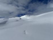 Von unten weg an hat es ausreichend Unterlage und darauf circa 30-50 cm Powder. Die Powder Auflage ist ziemlich konsistent bis zu meinem Umkehr dem Pt. 2498. Bis zum passo Giacomo war es frisch gespurt, ab dort legte ich Sũdseitig die Spur hoch zum Gipfel. Eine Dreier Gruppe hat auch von Norden gespurt durch das etwas steiler Tal, welches bei Pt. 2392 endet, dort drehte die Gruppe auch um.