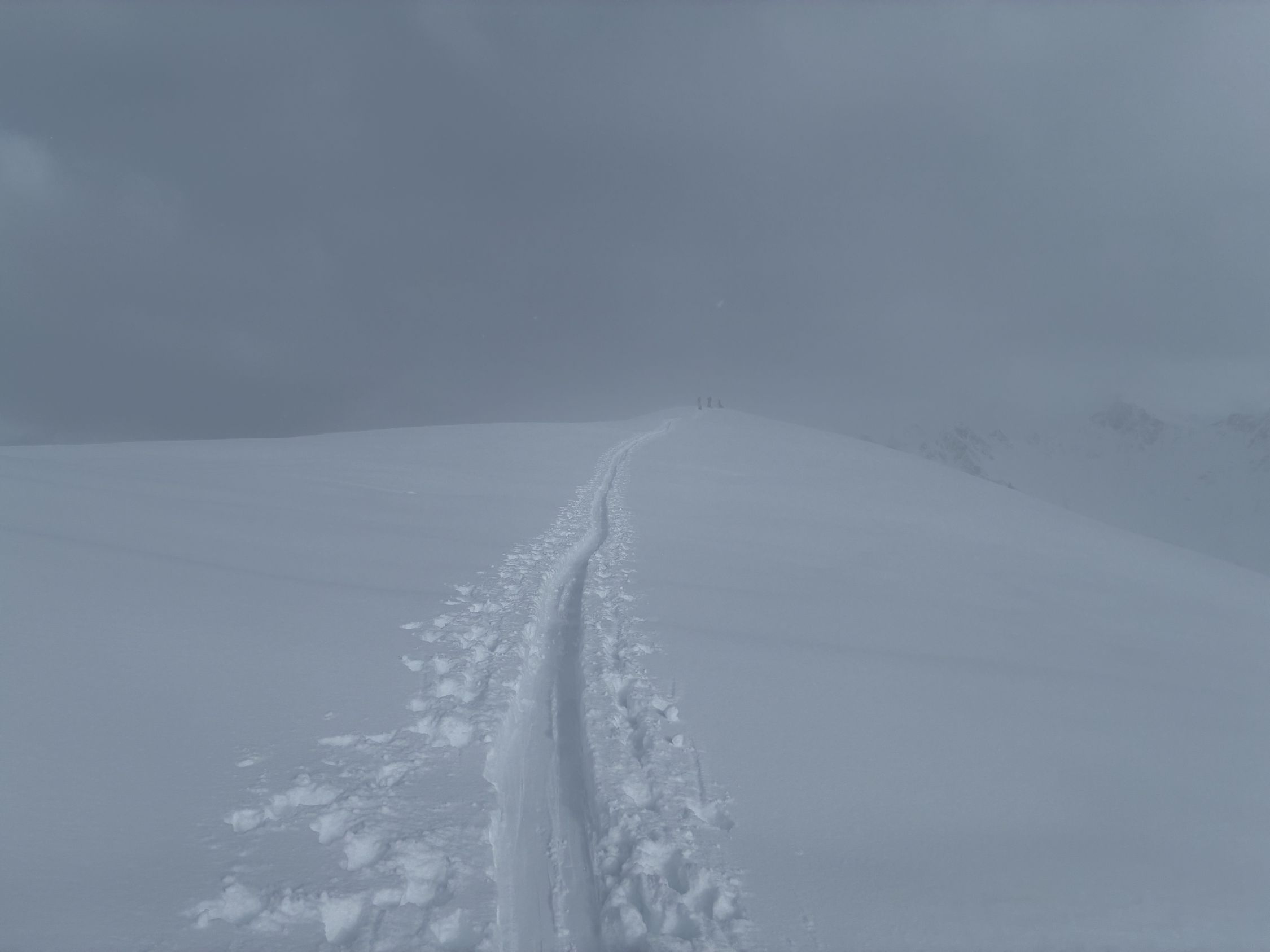 Ich harrte noch etwa 30 Minuten am Gipfel aus bis sich eine bessere Sicht ergab fuhr dann südseitig an und stieg wieder zum Gipfel um - wie es die andere machten via Pt. 2392 und dann kaum stöckelnd auf der ebene links ab.
