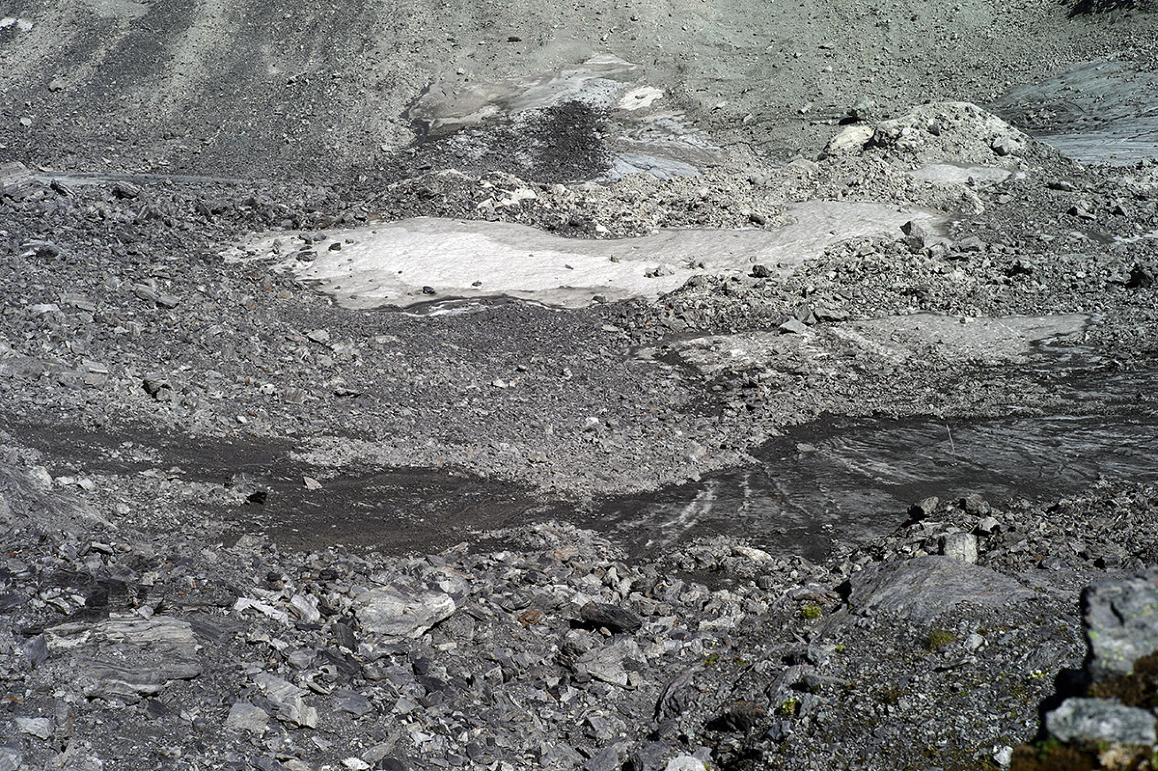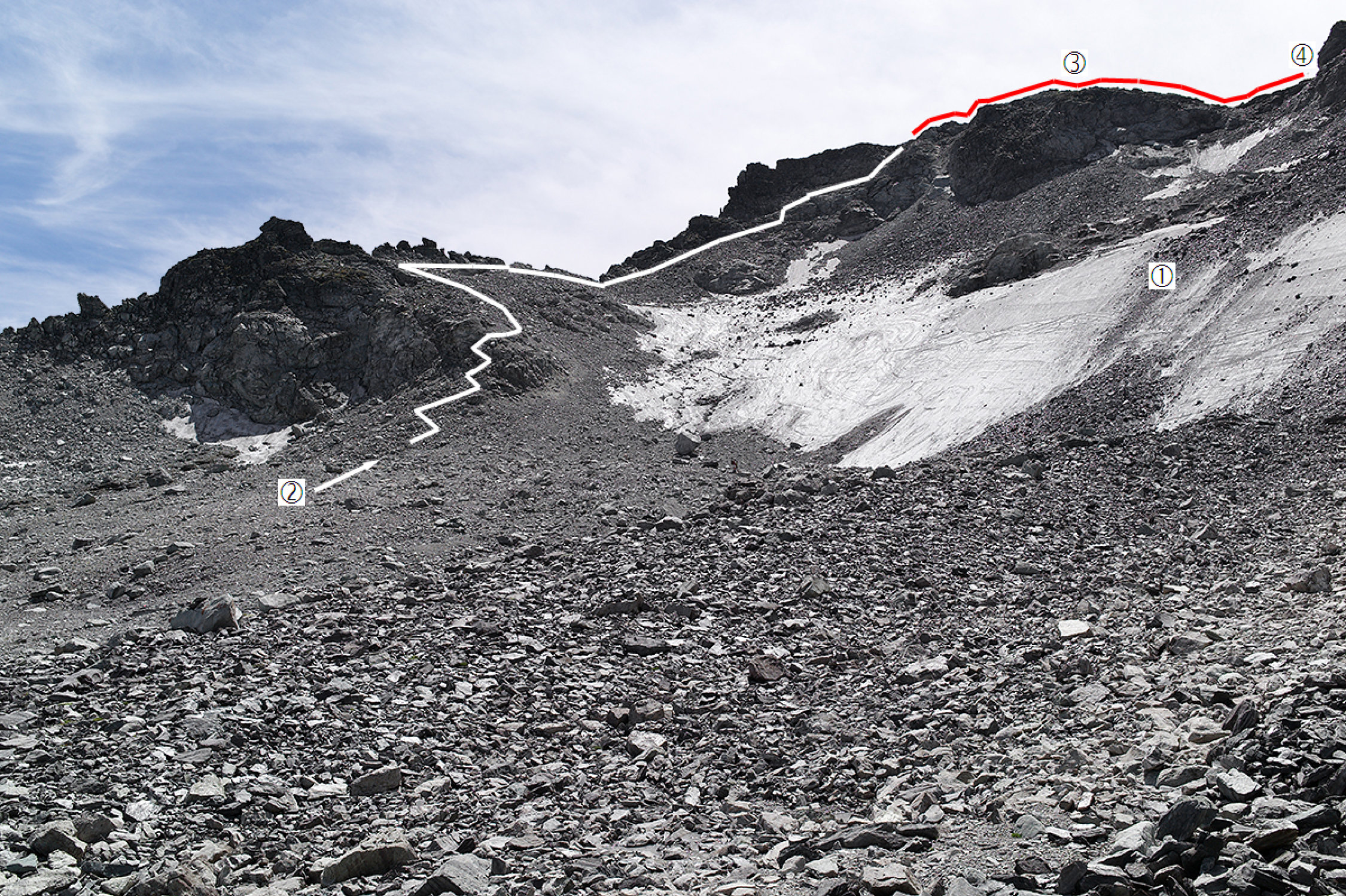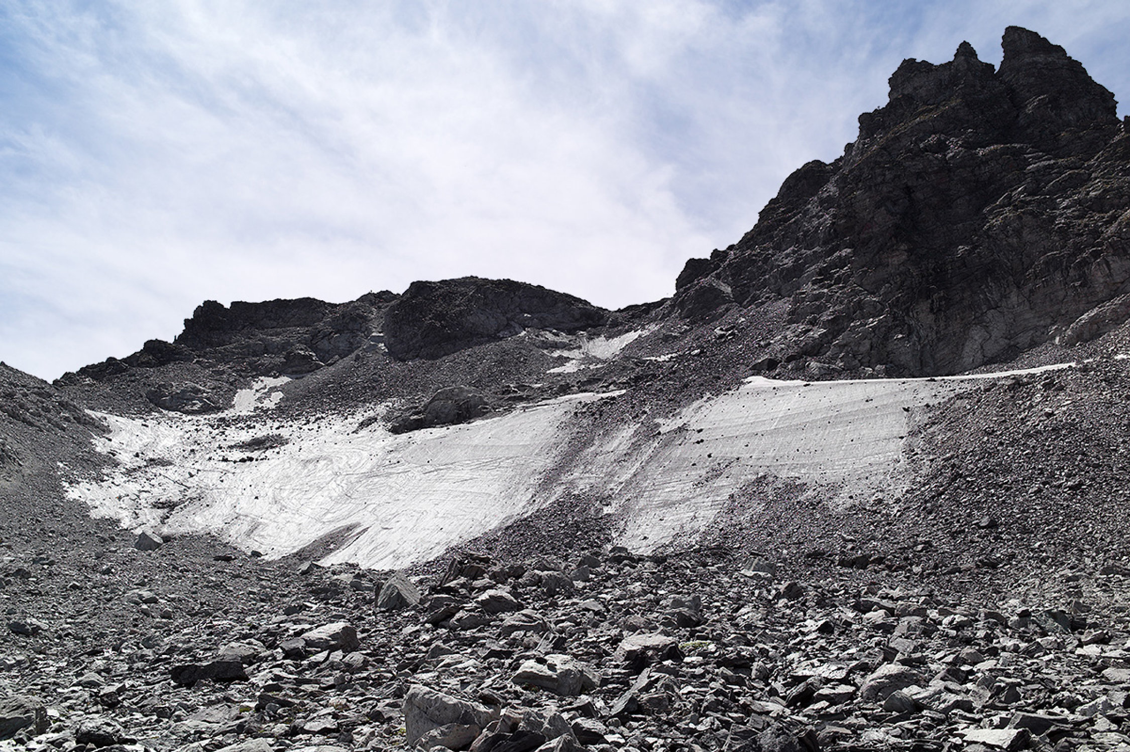Es kann aktuell nur empfohlen werden, für den Aufstieg zum Pizolsattel die neu angelegte Route über die Wildsandköpfe ( P. 2810 LKS) zu verwenden. Der Gletscher ist zur Zeit komplett blank, im oberen Teil herrscht zudem des nachrutschenden Blockwerks wegen eine beträchtliche Steinschlaggefahr.