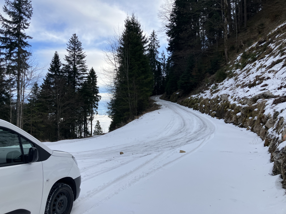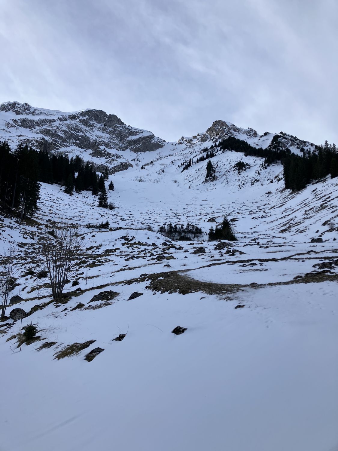 Wir sind nicht in Blumenstein gestartet, sondern mit dem Auto bis ca. 1100 hm auf der Alpstrasse hochgefahren. Mit dem 4x4 kommst du ohne Probleme bis ca 1300 hm (letzte Haarnadel vor der Lochhütte). Ab dort dann auch genug Schnee für den Aufstieg. Bis dahin sonst besser zu Fuss.