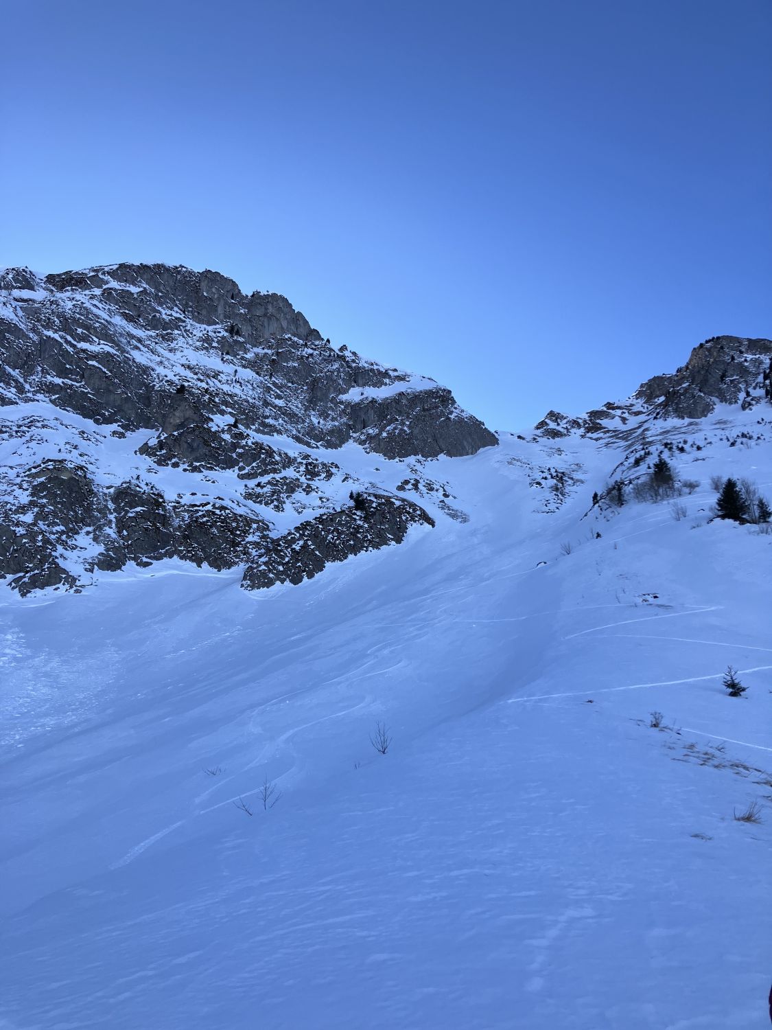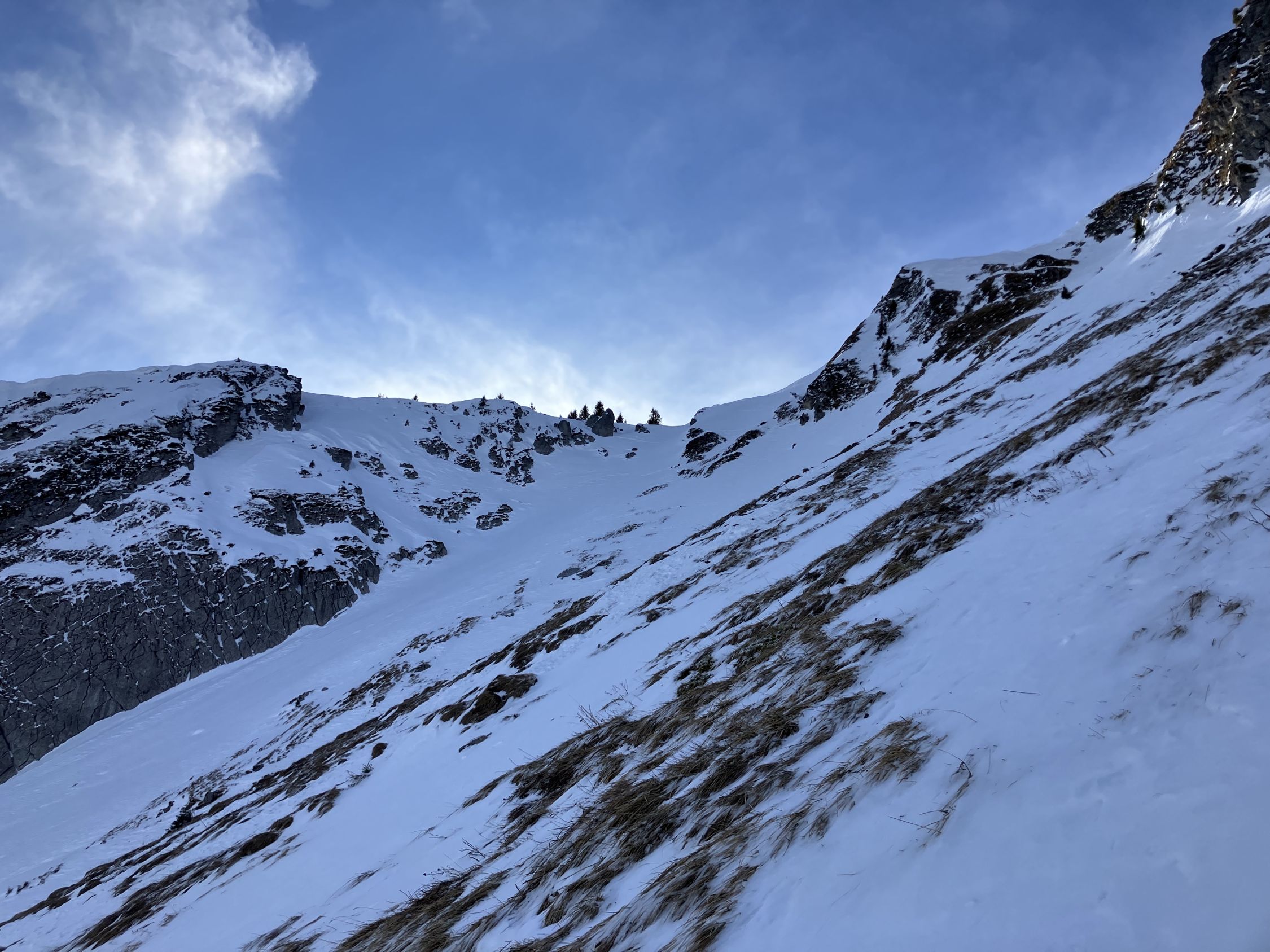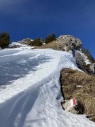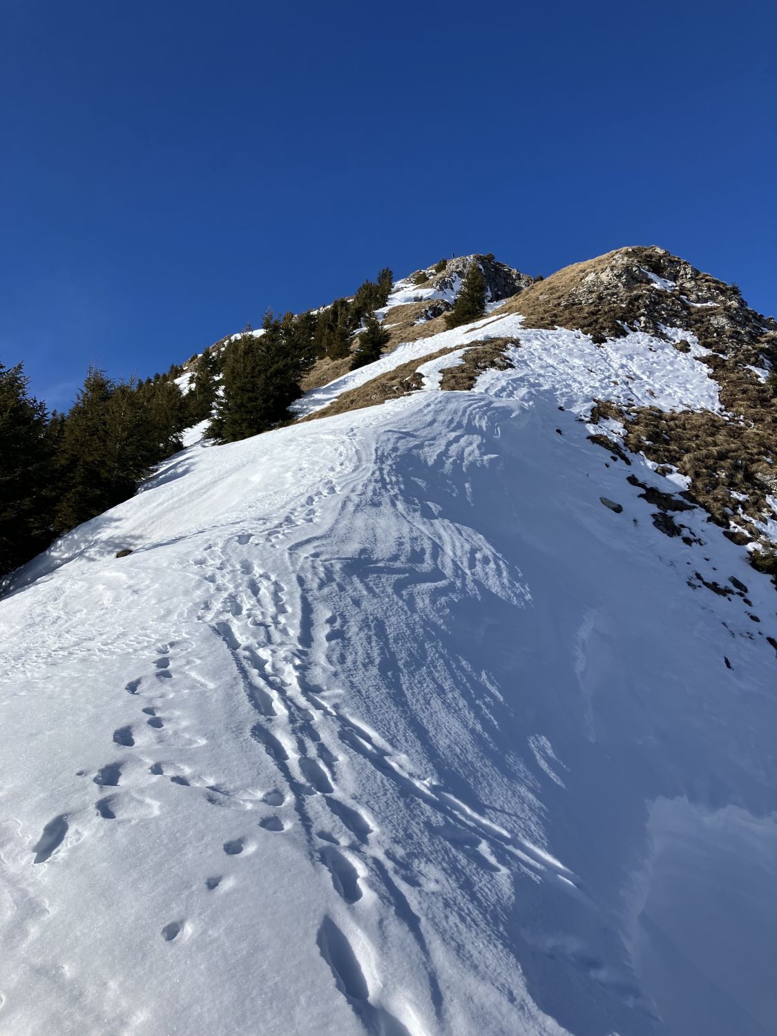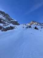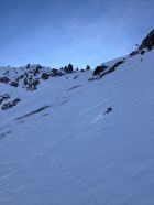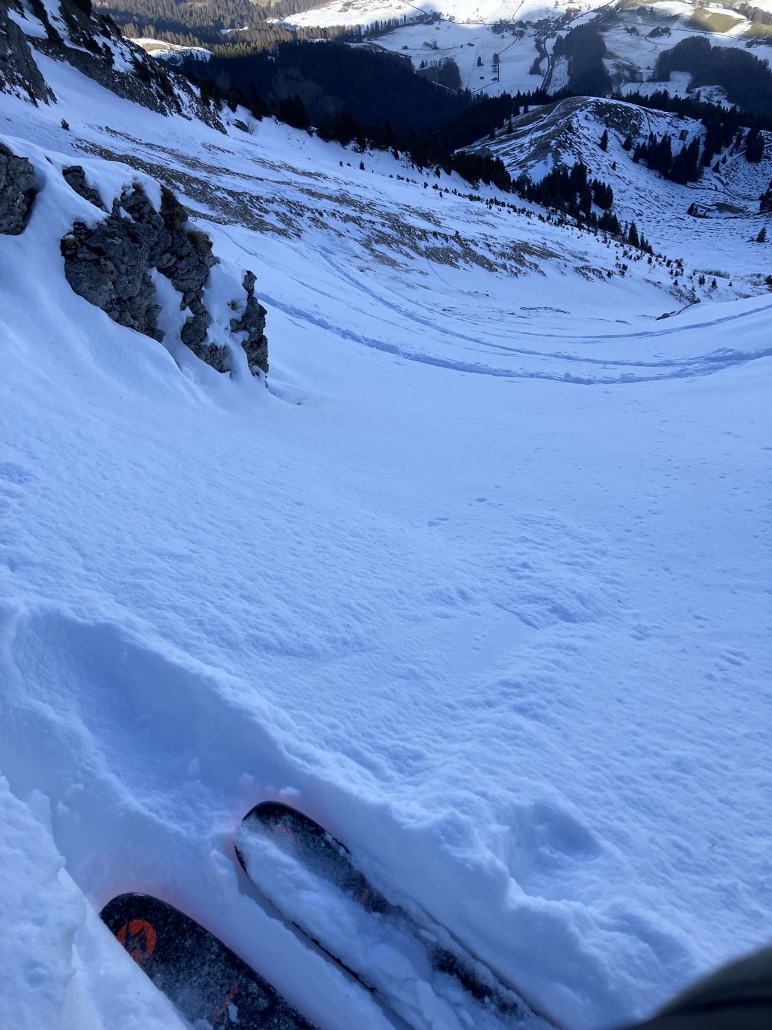 Die Abfahrt vor allem im oberen Teil in sehr schönem Pulver. Zwischenzeitlich hart, dann wieder schöner Triebschnee und hart abwechselnd. Wo der Schnee leicht gedeckelt war, war er gut zu fahren. Unten raus dann mit angezogener Handbremse. Es ist ohne Steinkontakt machbar.