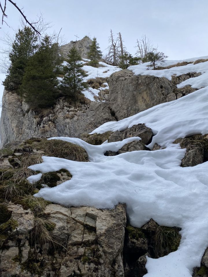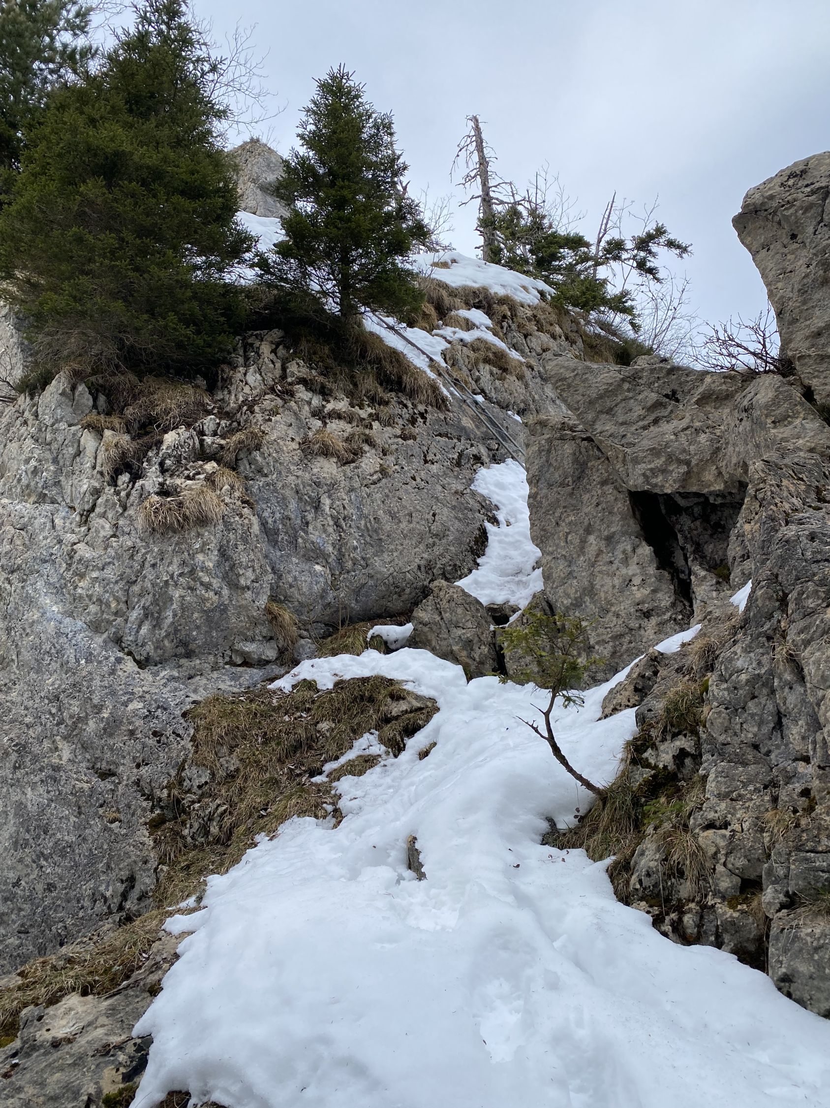 Die Leiter ist frei von Schnee. Oberhalb waren Steigeisen hilfreich, dort ist der Schnee zum Teil hart gefroren oder lose.