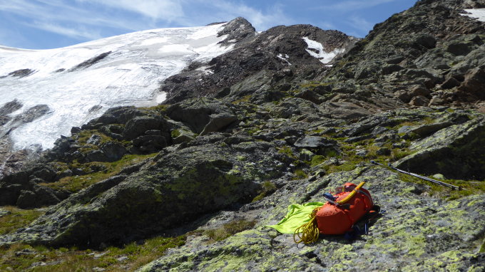 Kein Restschnee mehr auf Fels und Gletscher. Kurze Gletscherstellen gerade noch ohne Steigeisen möglich,- ins Geröll/Fels ausweichen.