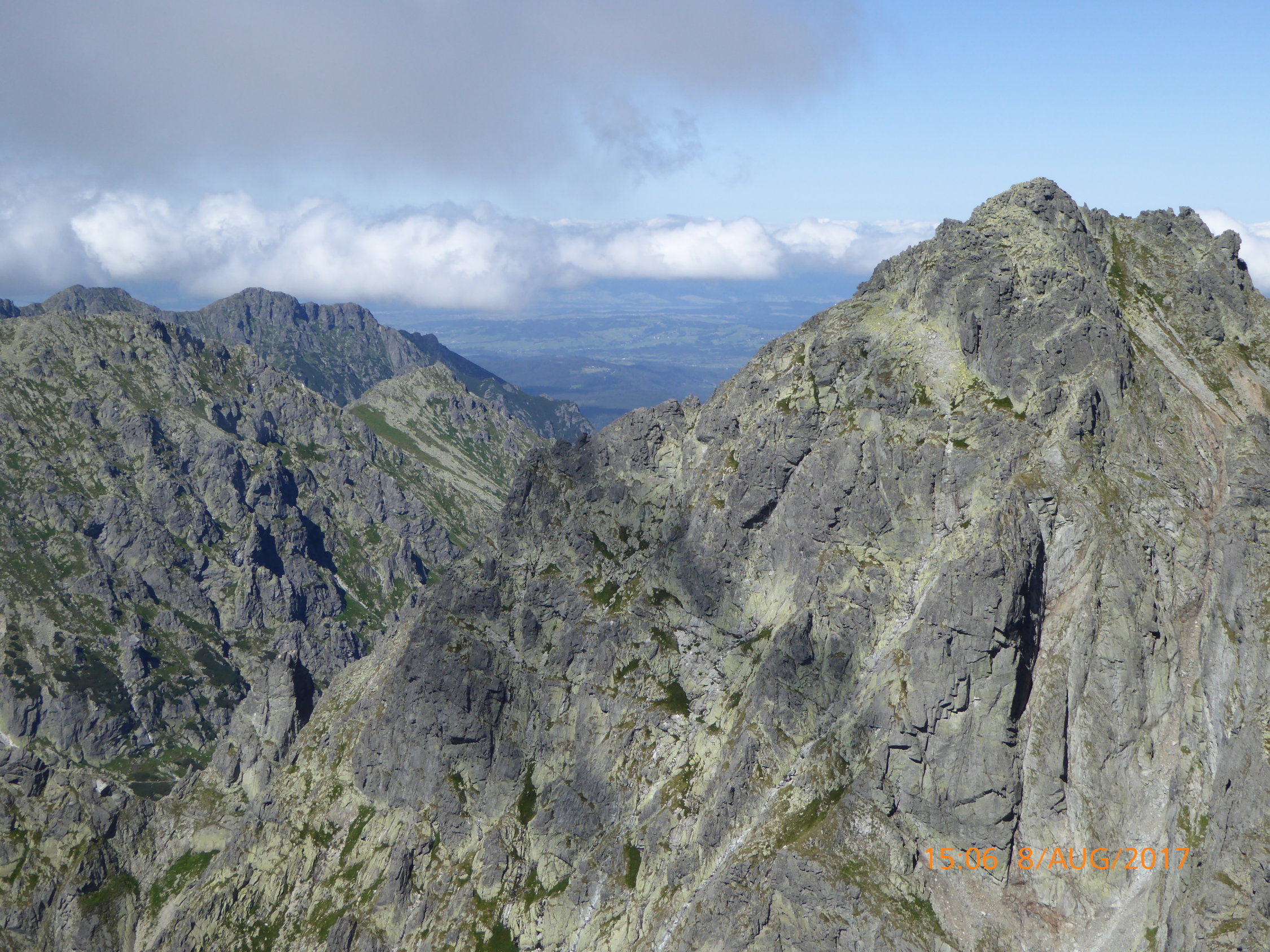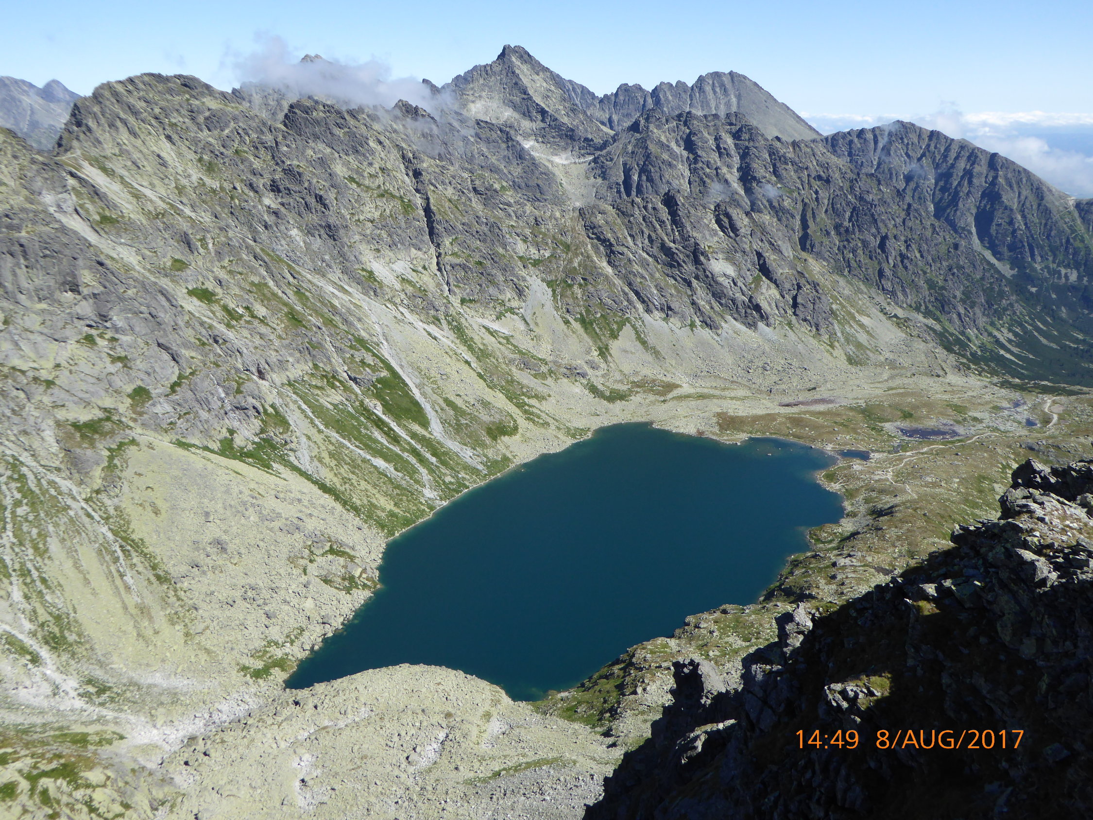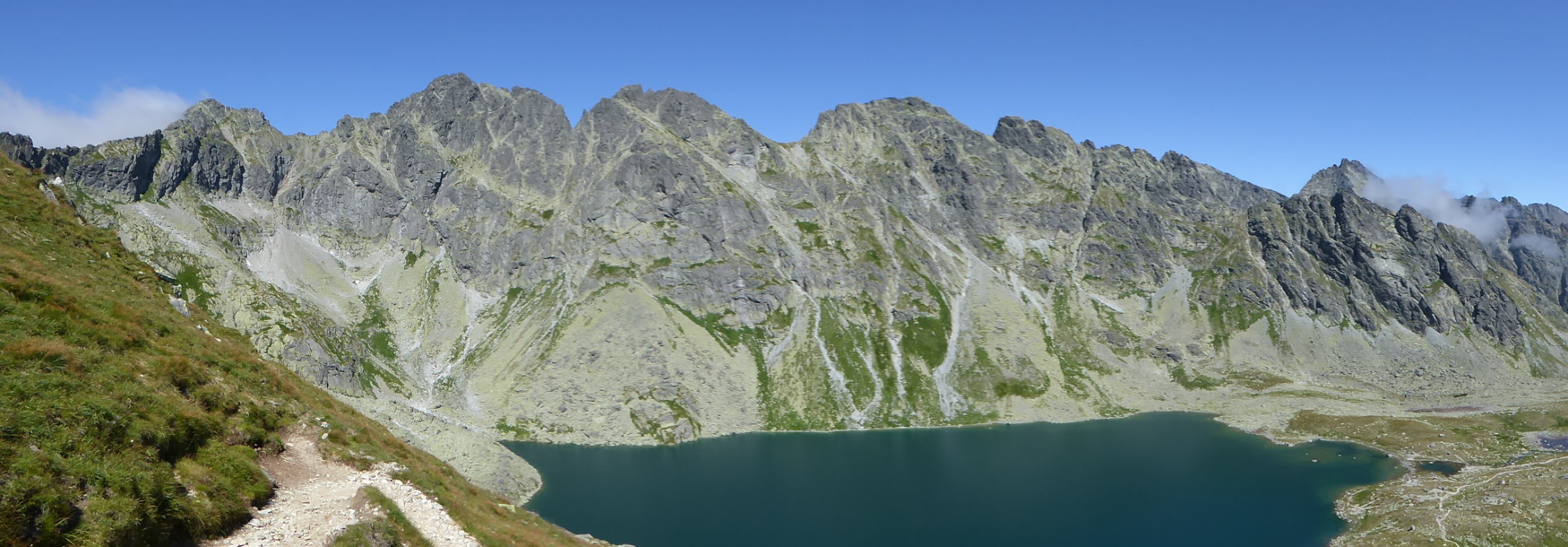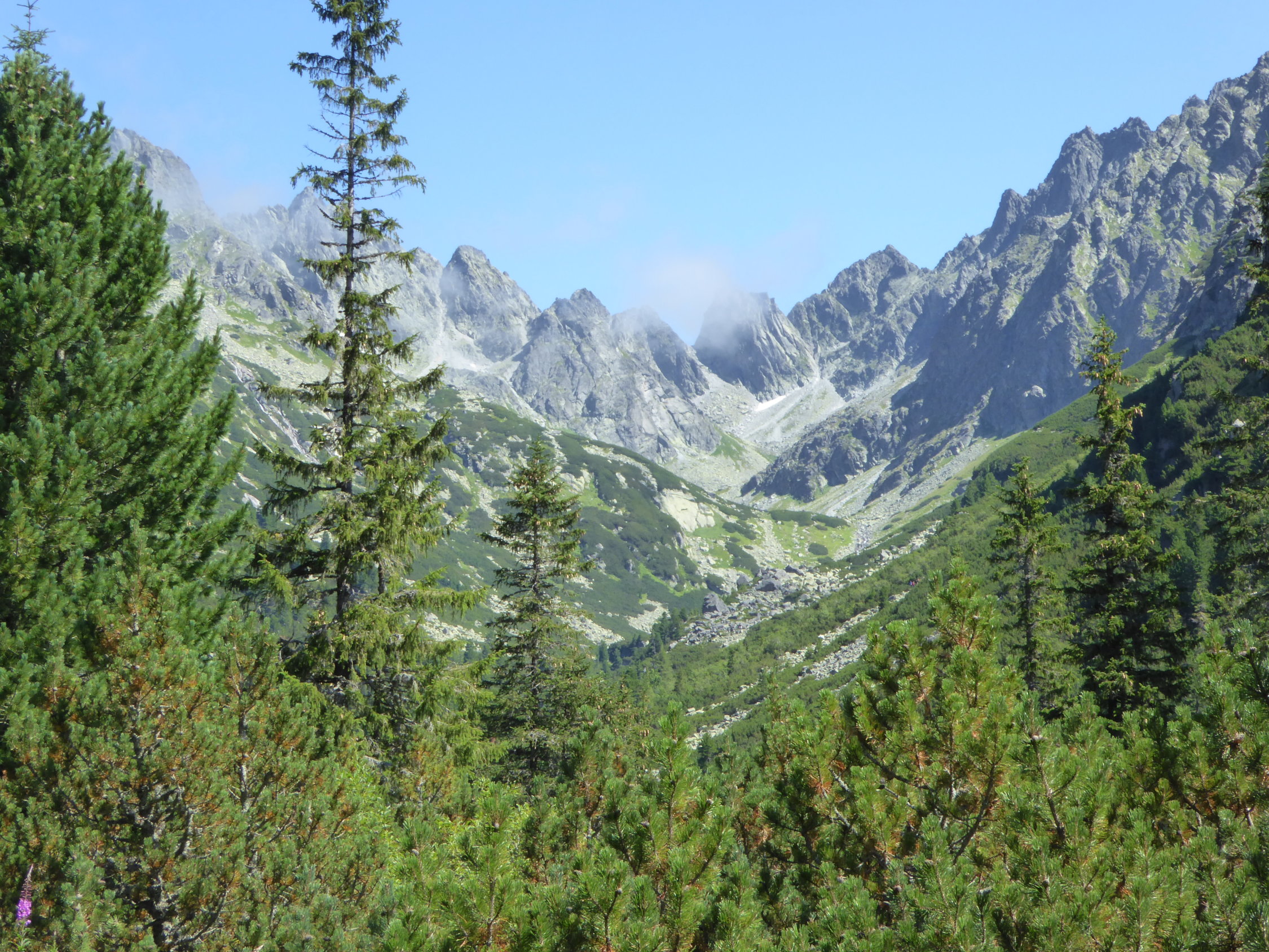 Die Kaltfront vom Montag (7.8.) hat mit dem Sommer kräftig aufgeräumt. Es ist herbstlich kühl. Die Hohe Tatra liegt bis 10 Uhr unter einer tiefliegenden Wolkendecke, um 11 Uhr kommt die Sonne langsam aber stetig durch die Wolken. Hauptgipfel ab etwa 13 Uhr bis zum Abend wechselseitig in Wolken. Im Hochtal des Vel´ké Hincovo pleso mit Gipfel Kôprovský štit dagegen wolkenloser, strahlend blauer Himmel.