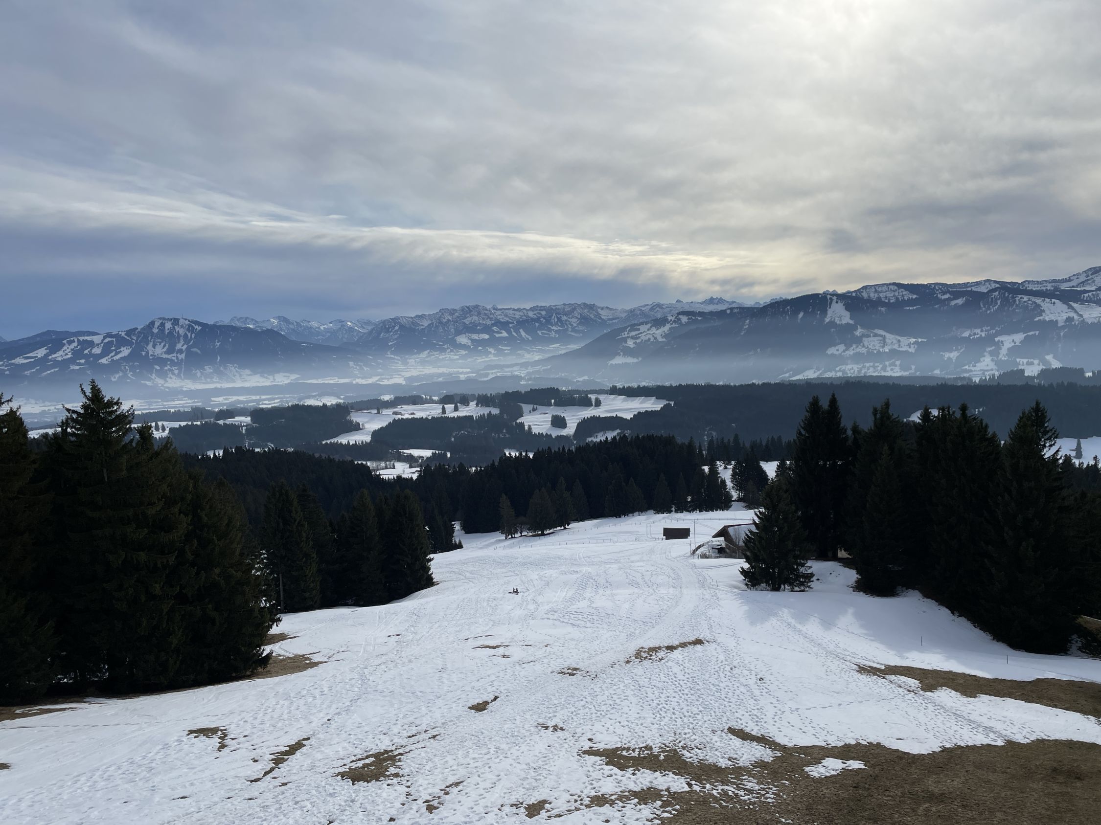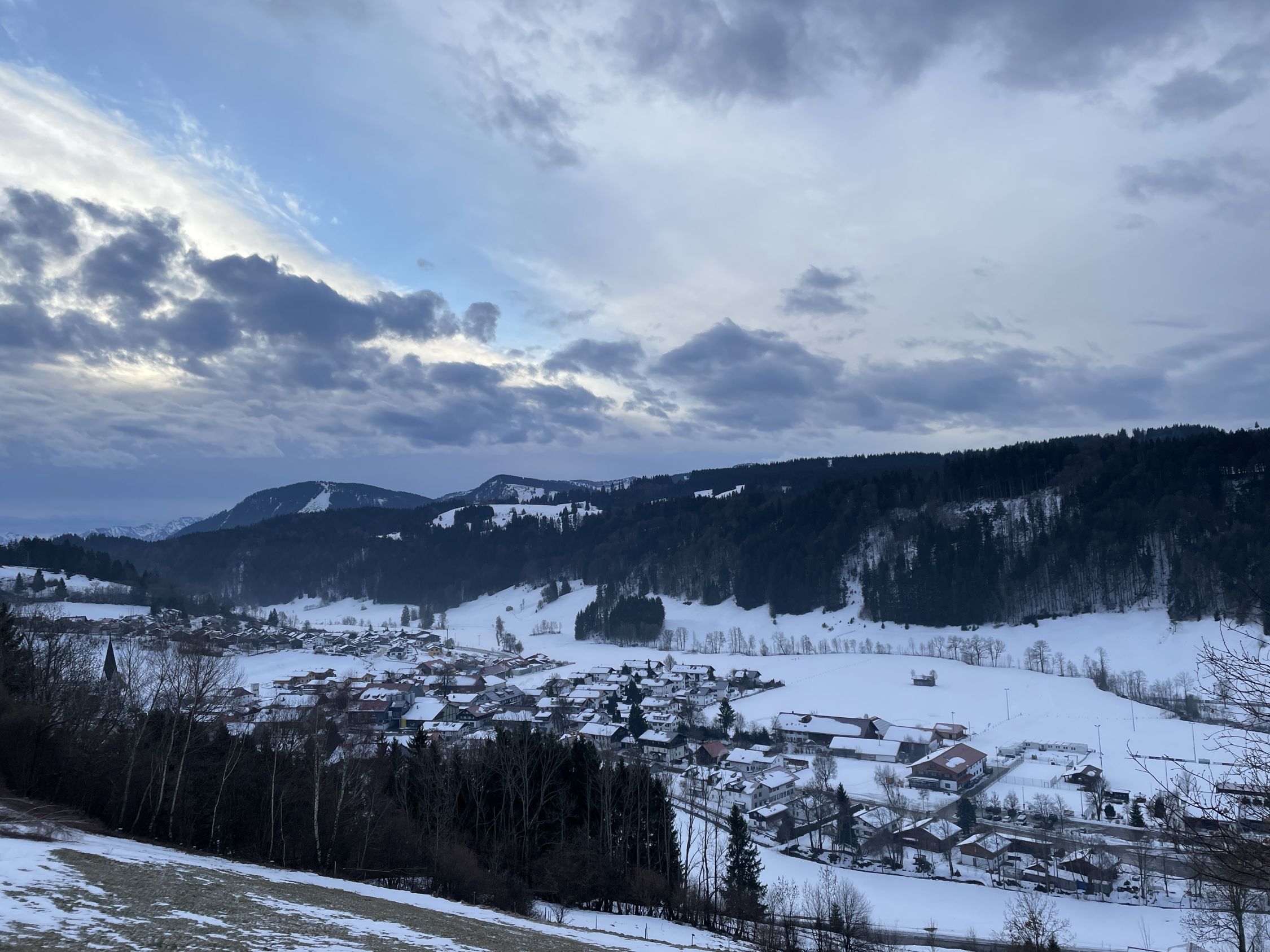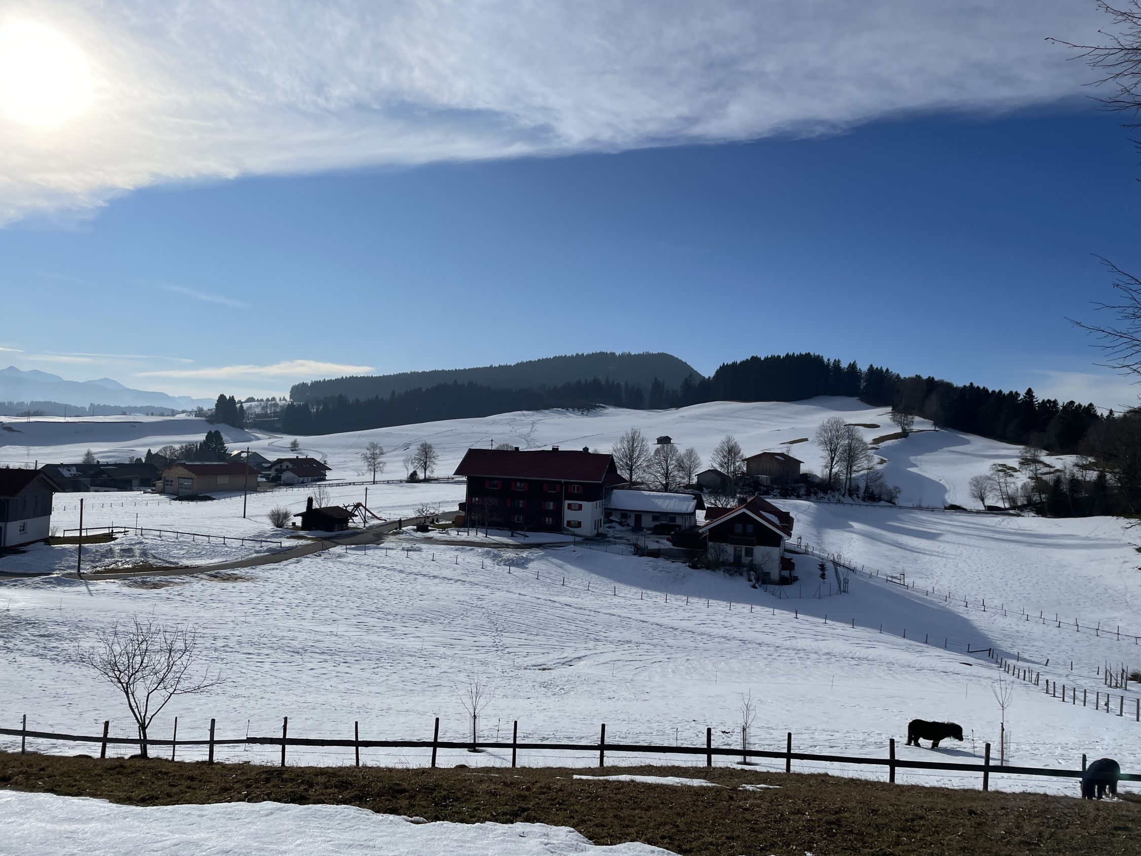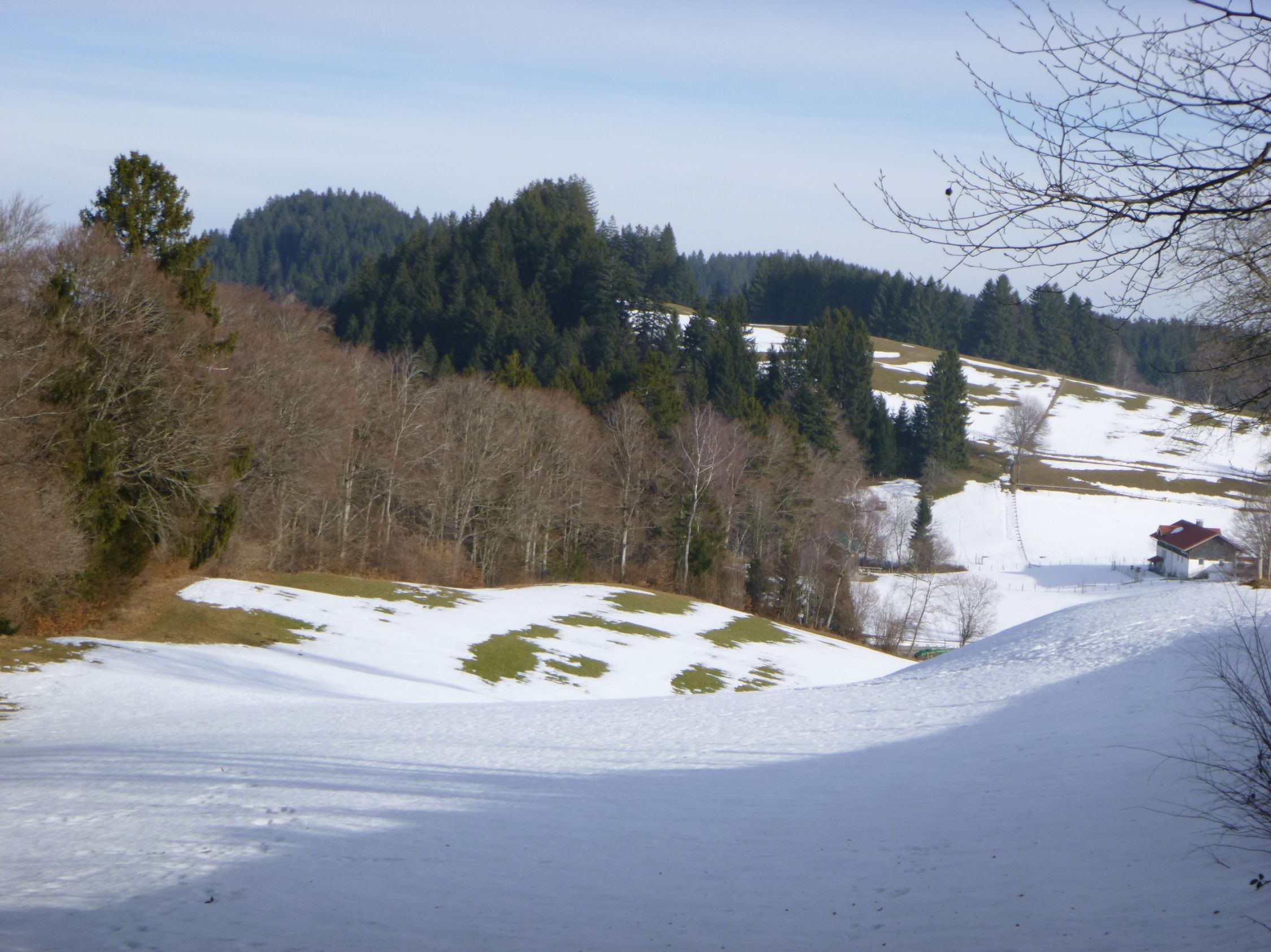 Vor Tourenbeginn deponierte ich mein Mini-E-Bike beim Schullandheim Allgäu in Stoffels. Als ich nachmittags dort wieder ankam war eine Schulkasse beim Skifahr-Üben am Grashügel 200 m etwas oberhalb nordwestlich vom Wegweiser P 935. Mit dem Radl bin ich dann auf den geräumten Straßen zurück nach Missen.