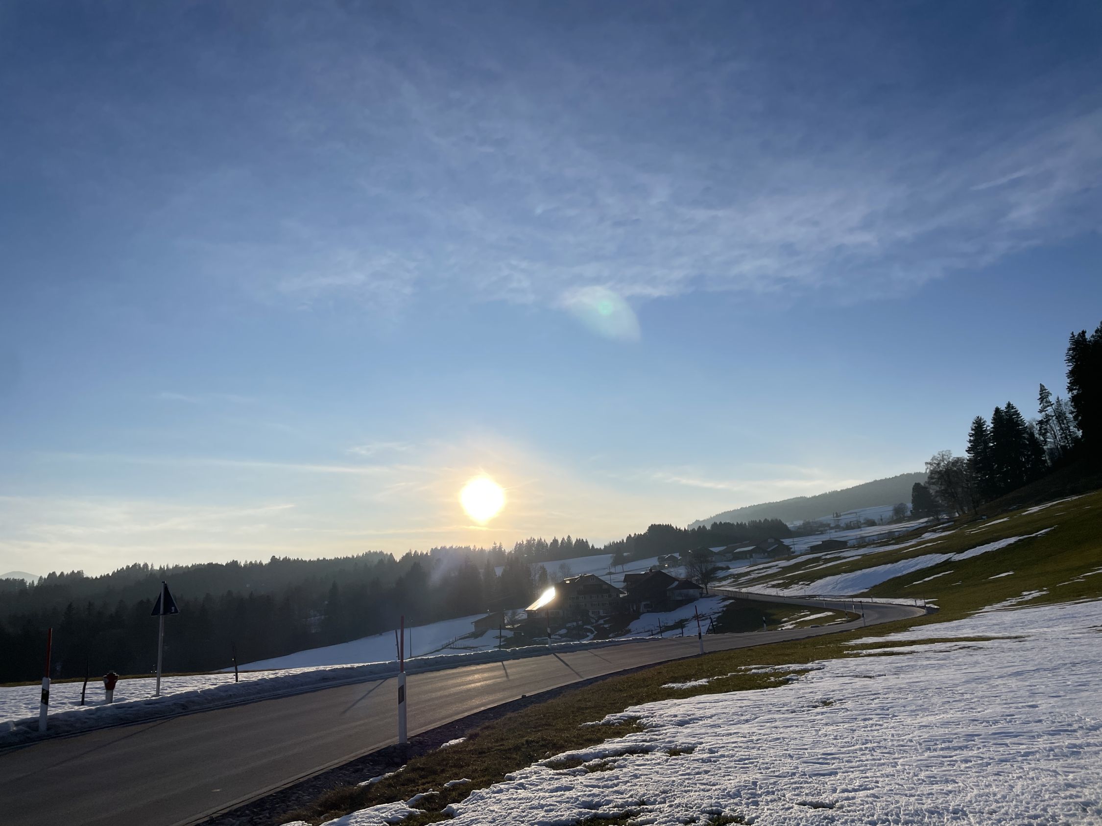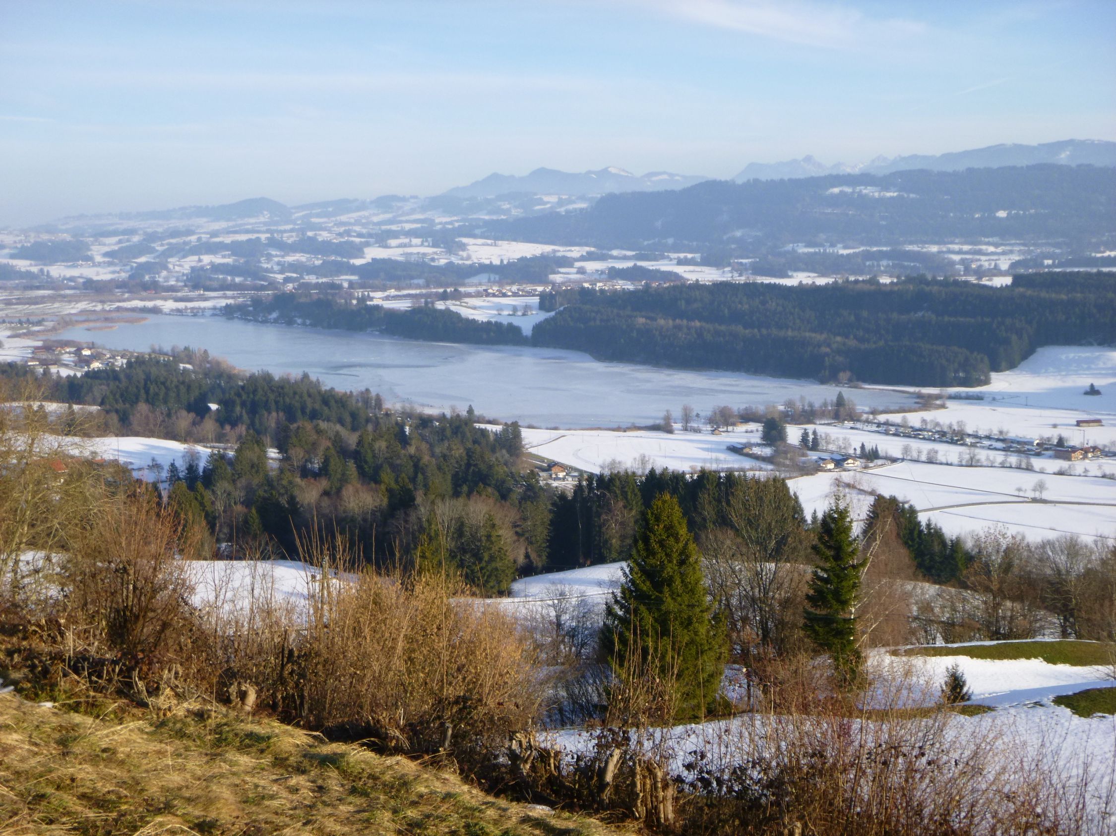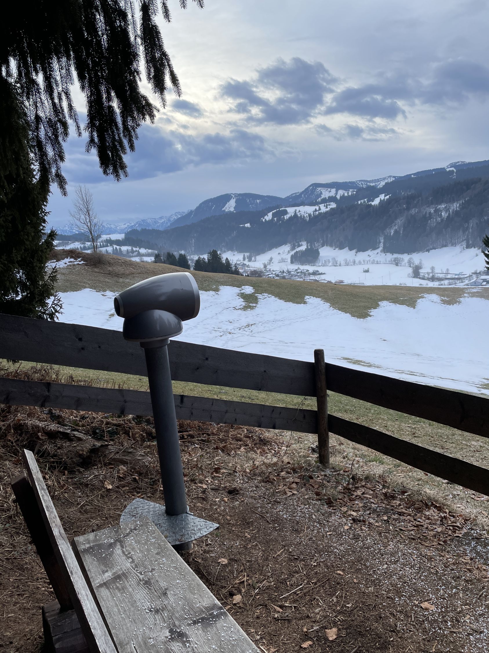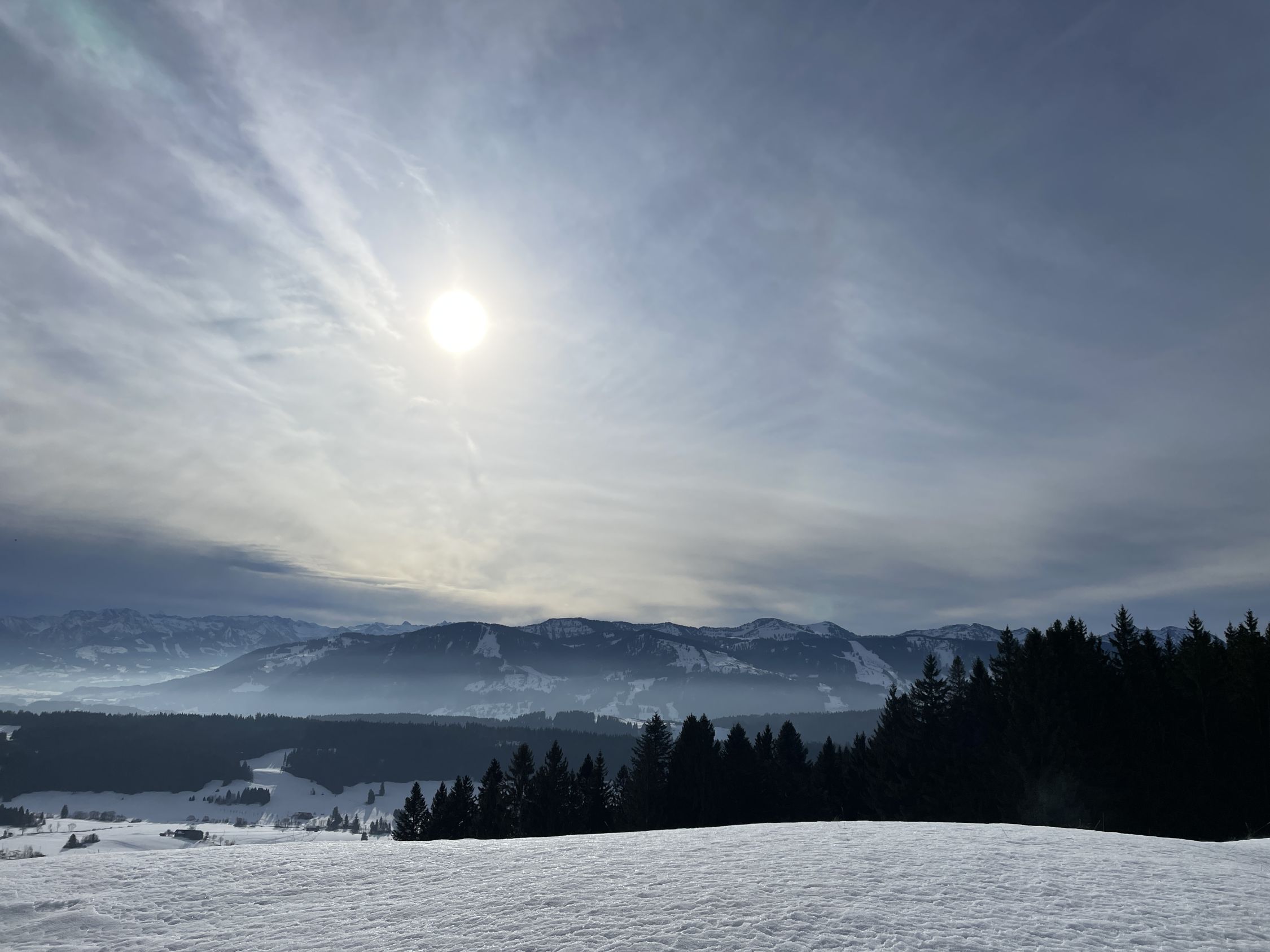 Vor Tourenbeginn deponierte ich mein Mini-E-Bike beim Schullandheim Allgäu in Stoffels. Als ich nachmittags dort wieder ankam war eine Schulkasse beim Skifahr-Üben am Grashügel 200 m etwas oberhalb nordwestlich vom Wegweiser P 935. Mit dem Radl bin ich dann auf den geräumten Straßen zurück nach Missen.