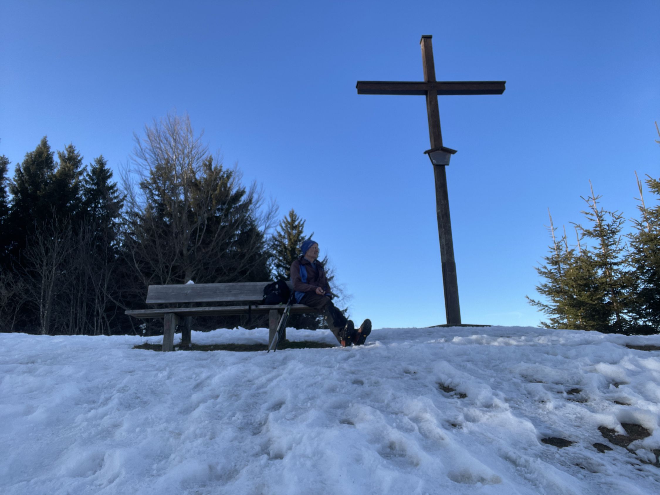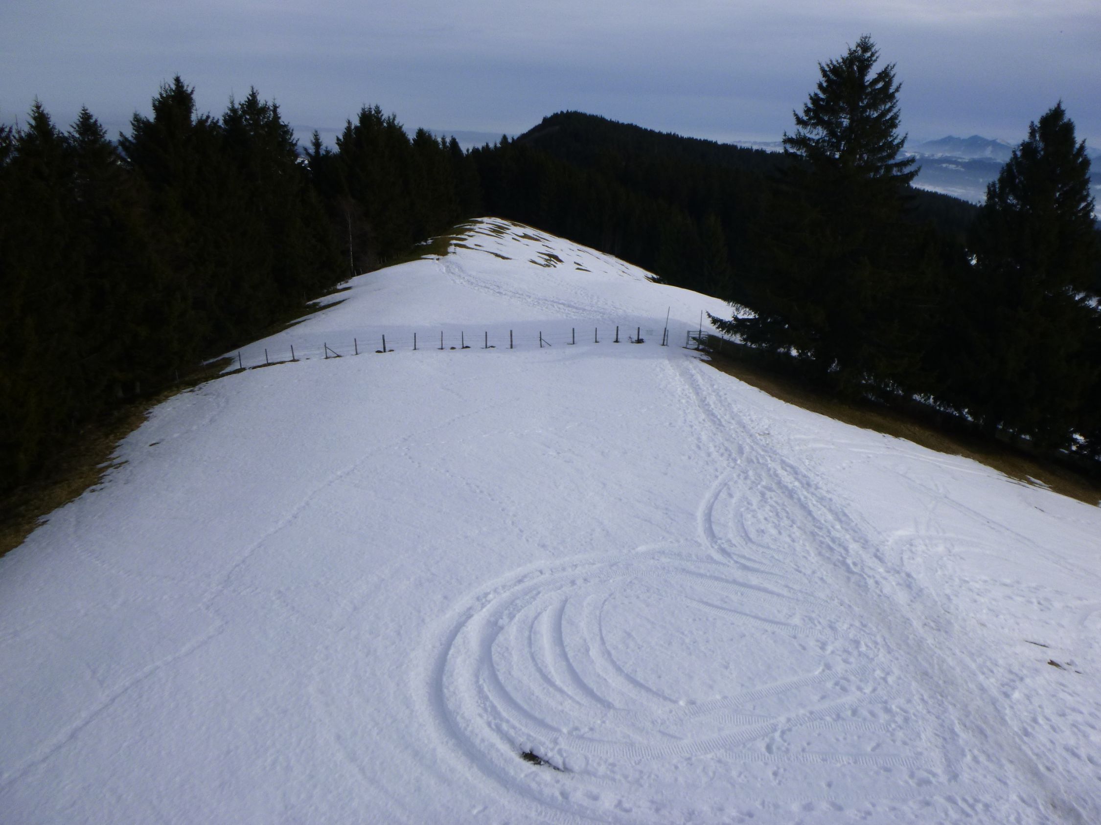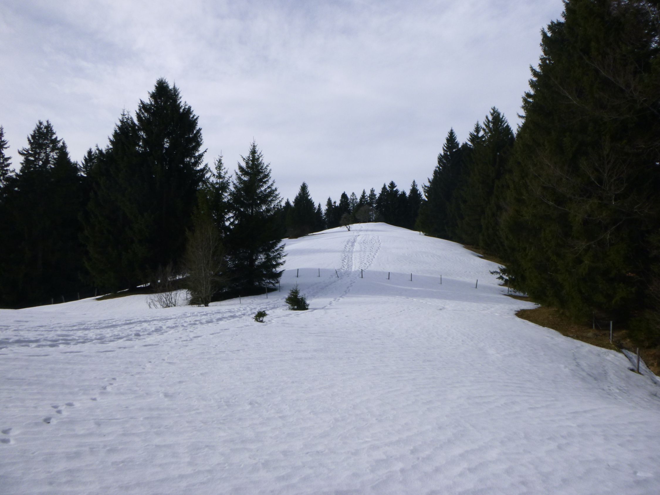 Tourenbeginn um 08:30 Uhr bei 2°C unter Schichtwolken. Mittags kam die Sonne durch. Unten lag kein Schnee mehr. Im Abschnitt zwischen P 1243 und Freundpolz war nicht nur Orientierung gefragt, sondern lag auch noch über 20 cm alte Mischung aus Pulverschnee und Bruchharsch, durch den man stapfen musste.