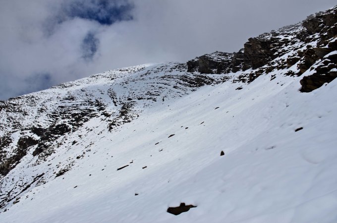 Bis zum grossen Stein gut da der Schnee schon geschmolzen war, allerdings etwas nass. Weiter oben zunehmend mit Schnee bedeckt. Zu wenig für eine schöne tragende Decke, zu viel um den plattigen Steine gerade zu bedecken und zu warm um es so gerade glitschig zu machen. Na ja, mit den Skistöcke ging es dann trotzdem noch ordentlich. Leider verdeckte der Nebel die Aussicht oberhalb von Zirka 2500m.