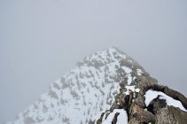 Bis zum grossen Stein gut da der Schnee schon geschmolzen war, allerdings etwas nass. Weiter oben zunehmend mit Schnee bedeckt. Zu wenig für eine schöne tragende Decke, zu viel um den plattigen Steine gerade zu bedecken und zu warm um es so gerade glitschig zu machen. Na ja, mit den Skistöcke ging es dann trotzdem noch ordentlich. Leider verdeckte der Nebel die Aussicht oberhalb von Zirka 2500m.