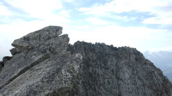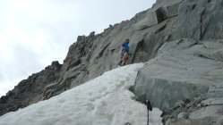 Durch Ausaperung Route wie beschrieben nicht machbar. Lt Auskunft eines Mitarbeiters der Cavardirashütte zumindest diesen Sommer noch niemand am Gipfel. Sind stattdessen vom Sattel rechts (nördlich?)des Gipfelaufbaus auf den Gipfel "rechts" des Hauptgipfels. Allerdings auch sehr brüchig - UIAA ca 2-3. Zwei Schlingen gesichtet