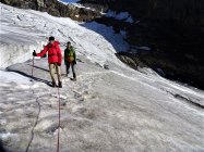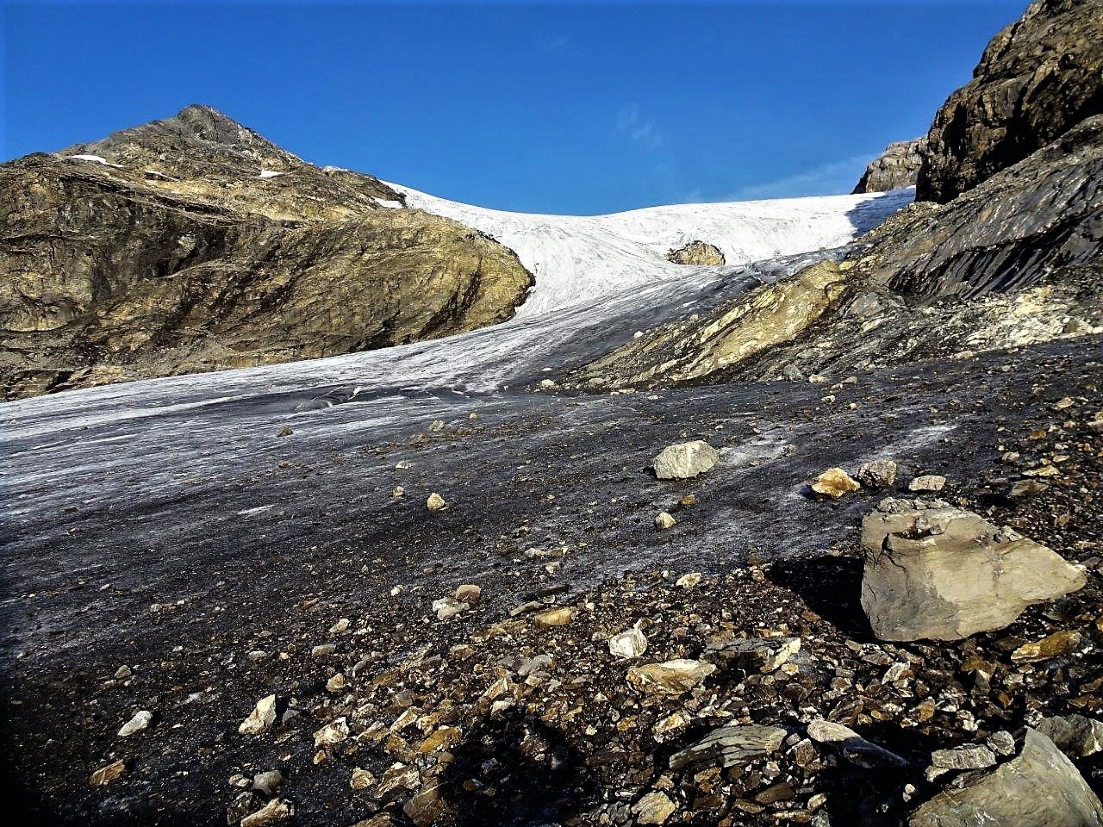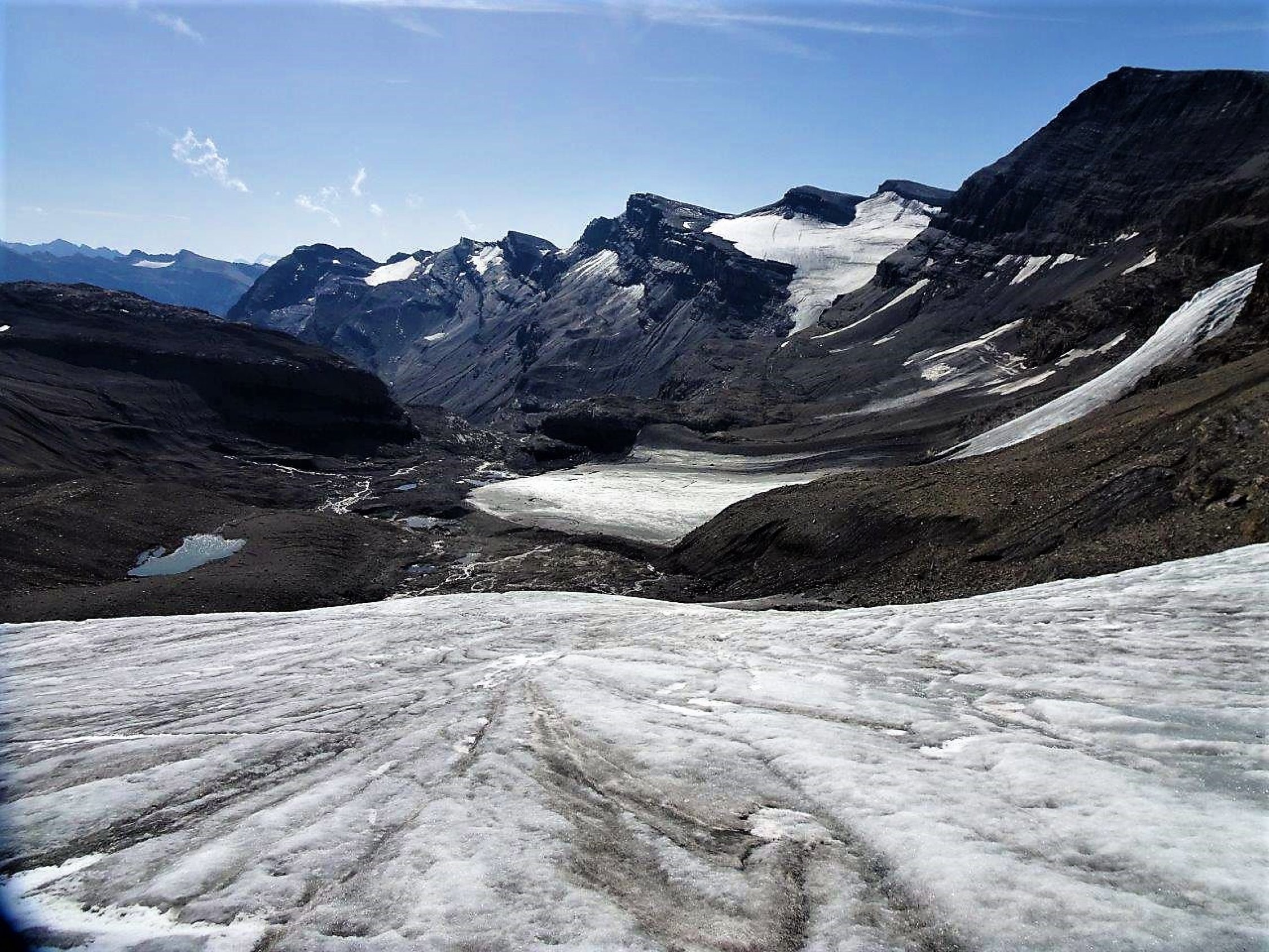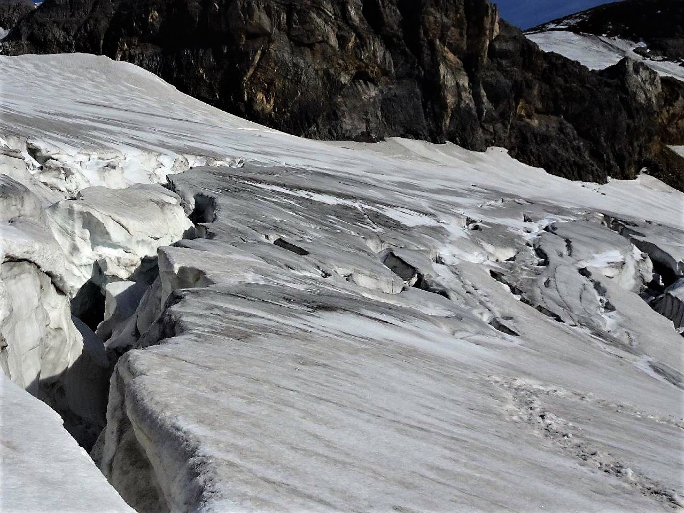 nach dem nächtlichen Regen- und Hagelgewitter am Morgen wieder schönes Wetter. In der Nacht keine Abkühlung daher etwas weicher Trittschnee ab ca. 2900m bis zum Gipfel. Der Gletscher zu Beginn blank bis zur Schneezone - mit Steigeisen jedoch sehr gut zu begehen. Nach den Schneefällen vom vergangenen Freitag, 12.8.2017 und den warmen Temperaturen waren 2-3 Spalten ohne tragende Schneedecke. Vorsicht beim Überqueren.