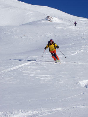 Bis 1900m keine zusammenhängende Schneedecke. Danach sind die Westhänge bis 2300m pickelhart gefroren (evtl. Harscheisen montieren). Oberhalb von 2300m ganz passabel. An den Südhängen ist stellenweise etwas Bruchharsch anzutreffen.
