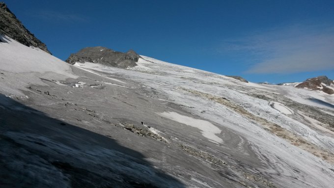 15.8. Aufstieg über das Kleinelendkees zum Ankogel. Der Gletscher hat einige Spalten, jedoch mit der geringen Schneebedeckung und einer guten Spur auch als Einzelgänger riskierbar.