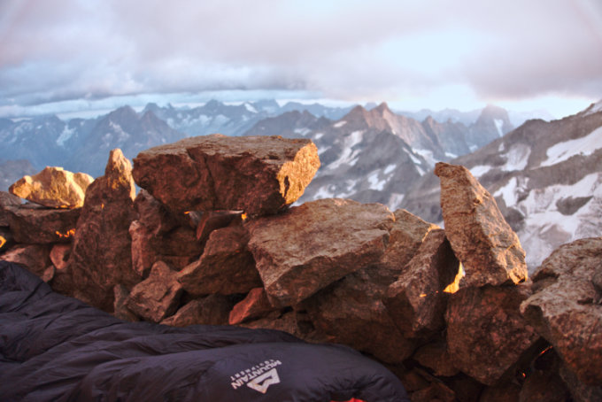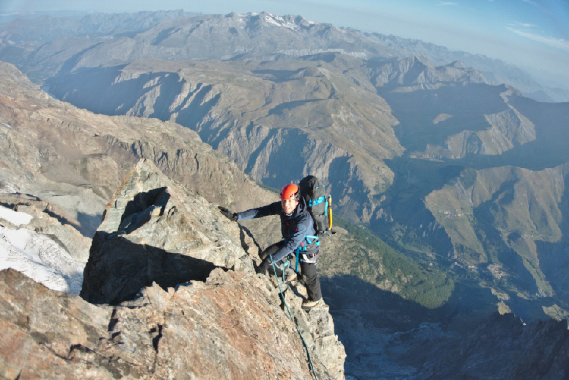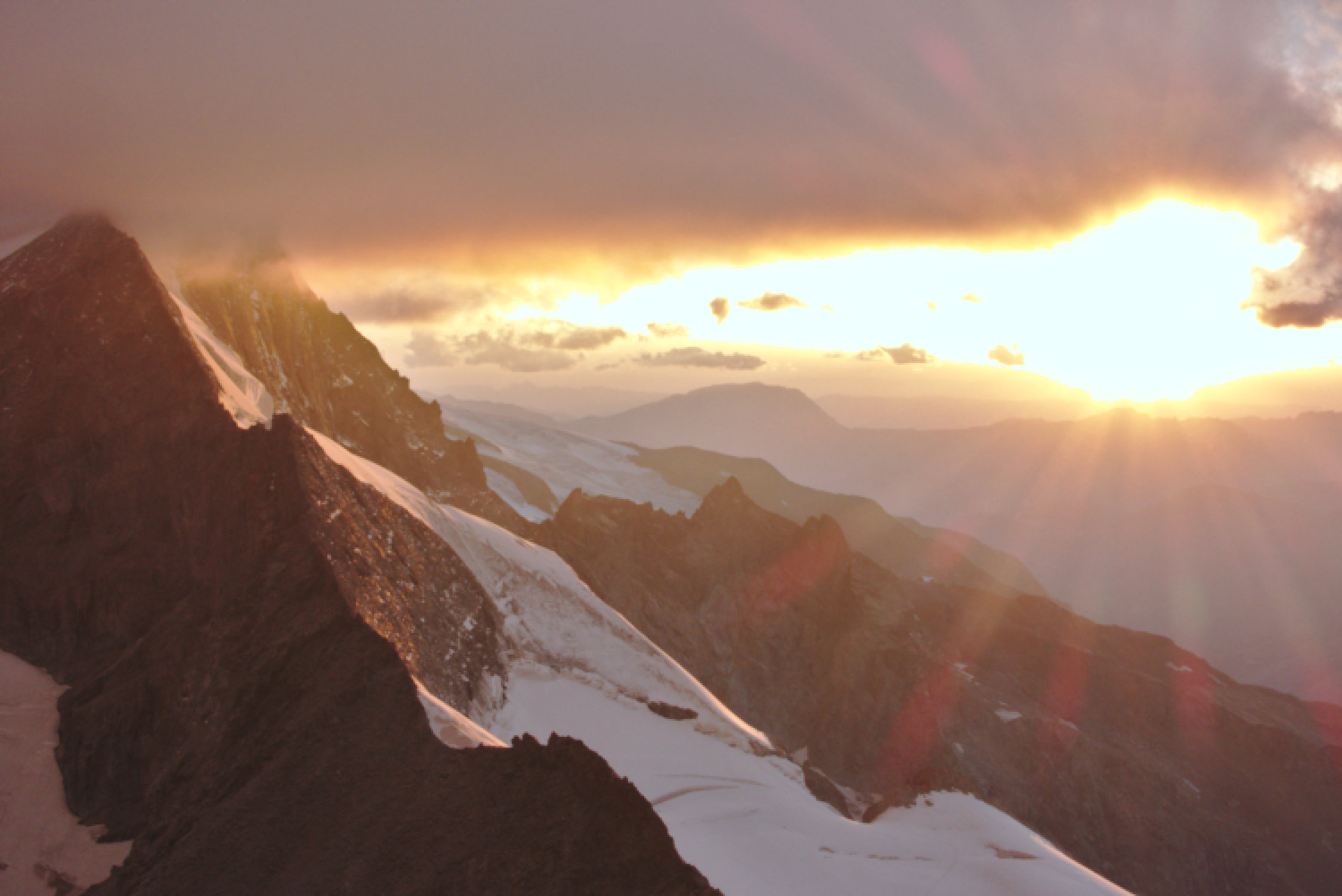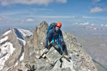 Promontoire Grat trocken. Am Glacier Carré führt am Rande der Felsen entlang eine Spur mit guten Tritten. Überschreitung vom Grand Pic bis zum Doigt de Dieu bis auf die nordseitige Querung am Fixseil auch komplett trocken und ohne Steigeisen. Das Fixseil ist frei. Zum Abseilen wird momentan ein 55m Doppelseil (oder Hilfsleine & Einfachseil benötigt) um über den Bergschrund zu kommen.