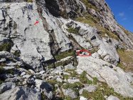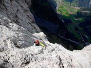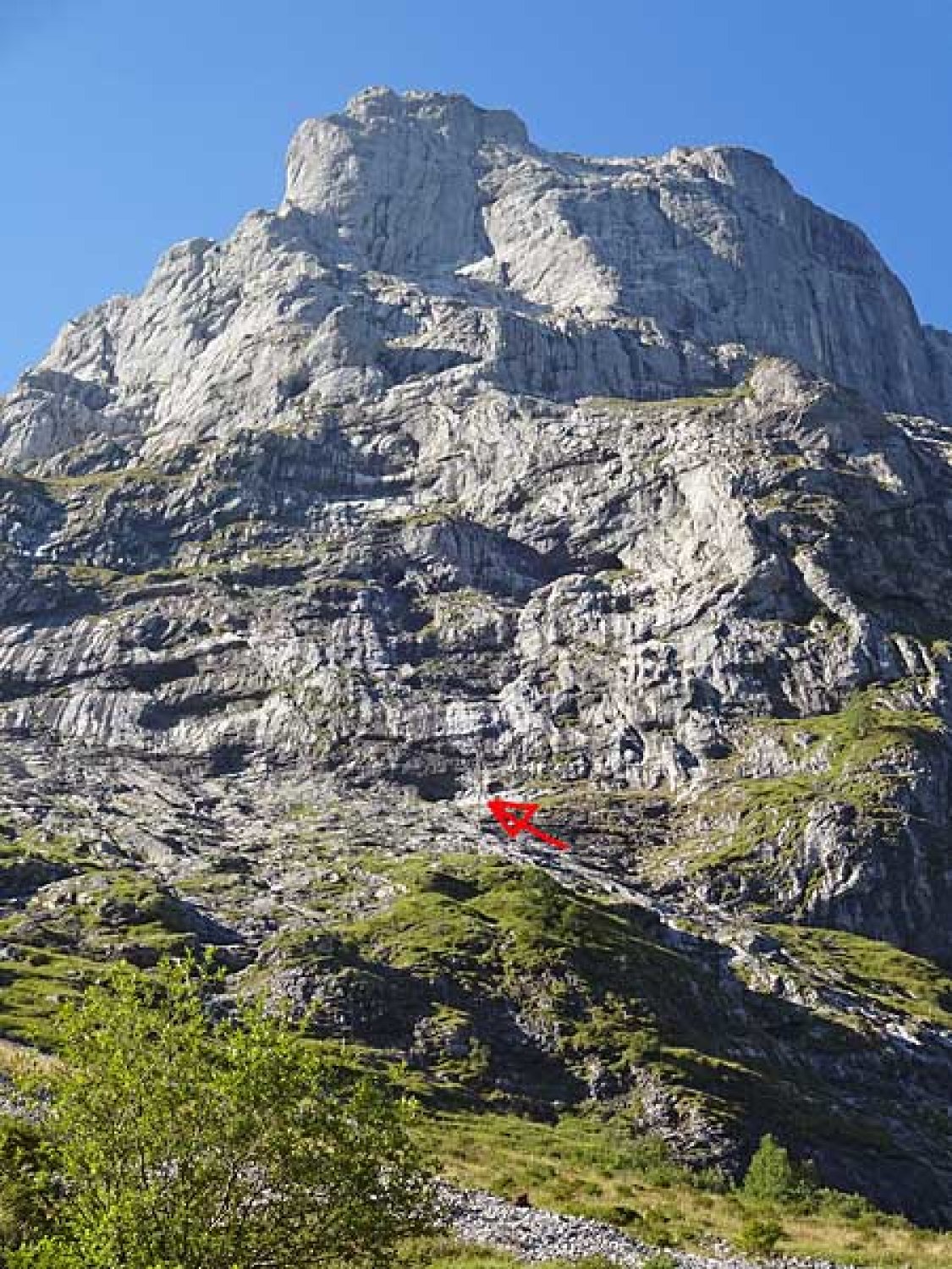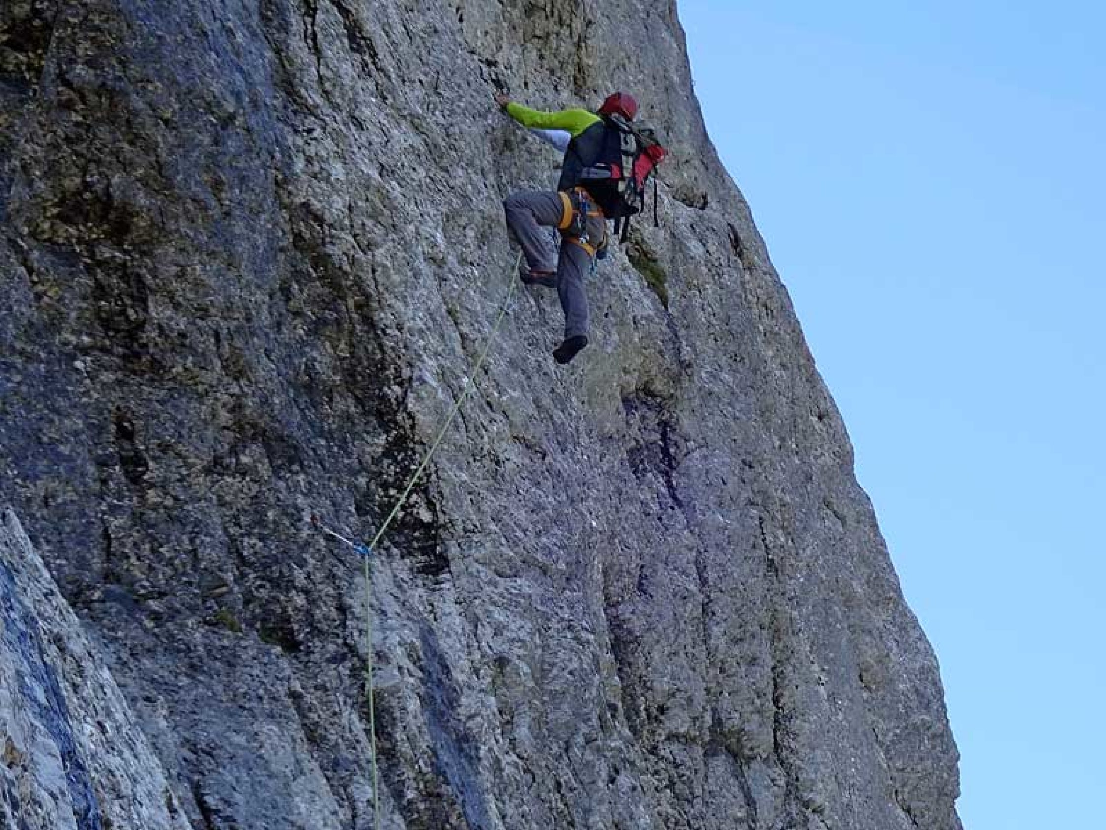 trotzdem handelt es sich um eine sehr lohnenswerte alpine klettertour (17 sl!) mit kletterfreundlich geschichteten felsen, vielen silikateinschlüssen und einer für nordseitenkalk erstaunlich guter reibung. die route kann als gut abgesichert bezeichnet werden, wenn man bereit ist, im leichten gelände grössere runouts zu klettern. beim gehgelände in der mitte der route muss man relativ stark rechts halten, um den einstieg in den nächsten teil zu finden. bei der 5a-rissverschneidung sieht man zum ersten mal keinen (roten) bolt und ist daher etwas unschlüssig, ob man richtig ist. doch kaum ist man etwas hochgeklettert, erblickt man eine sanduhrschlinge sowie bald wieder einen bolt. dies war gleichzeitig die einzige länge, wo wir einen cam legten (#0,5).