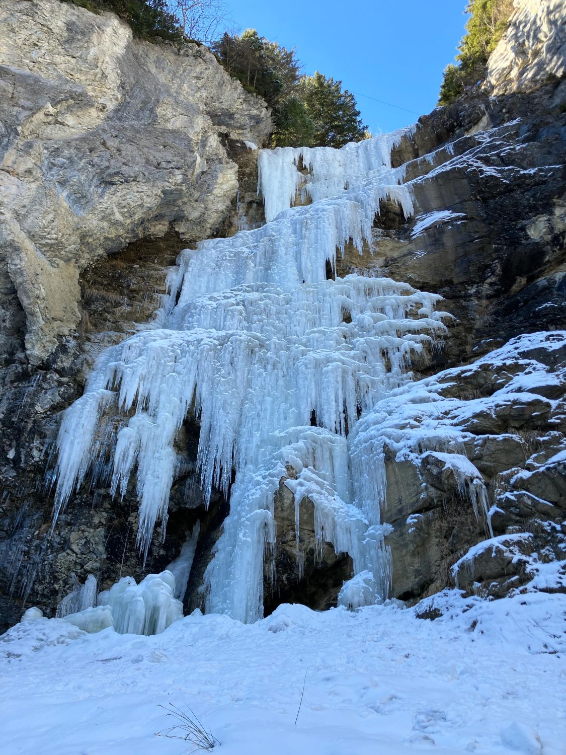 Eisfall steht unerwartet gut, Eis ist durchgehend und kompakt. Rechter Wandteil ist ab Mittag für ca. 1 h schon in der Sonne. Dort gibt es kein Eis mehr, also beim Sichern auch keine Gefahr durch Abbrüche.