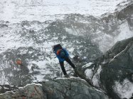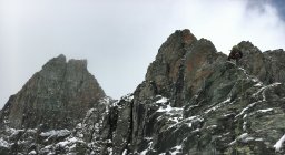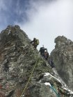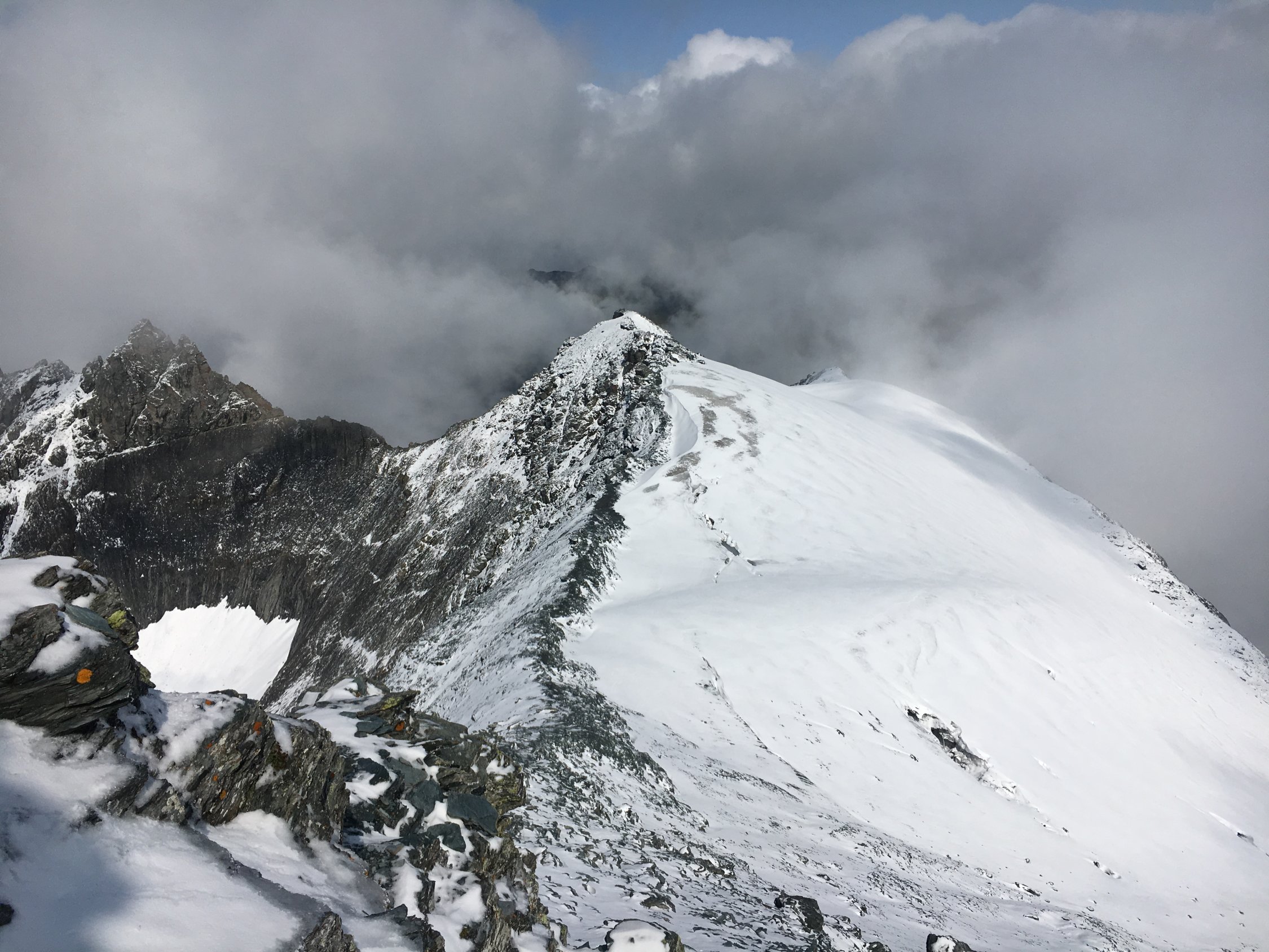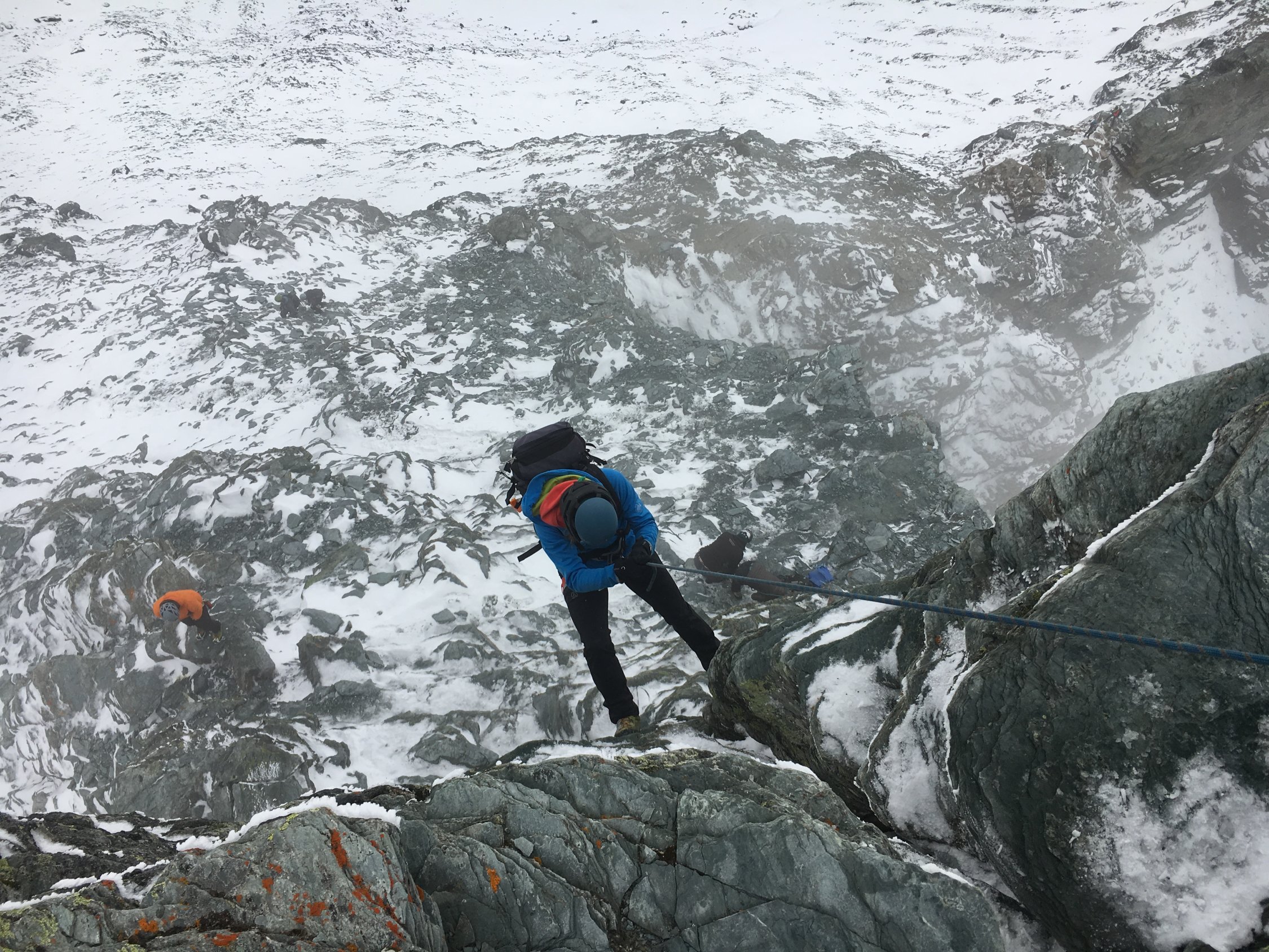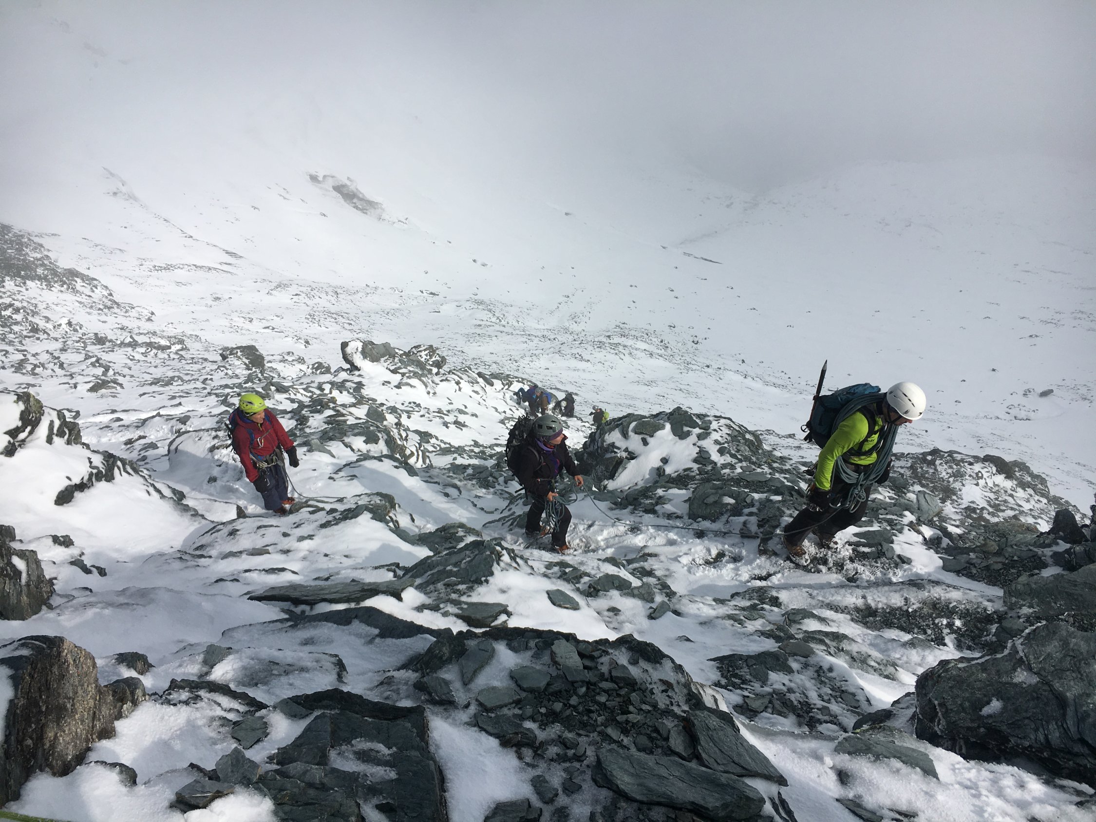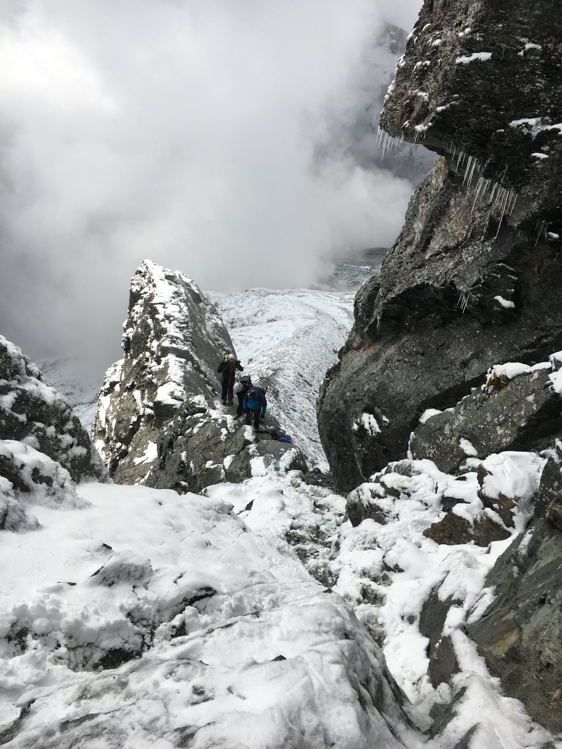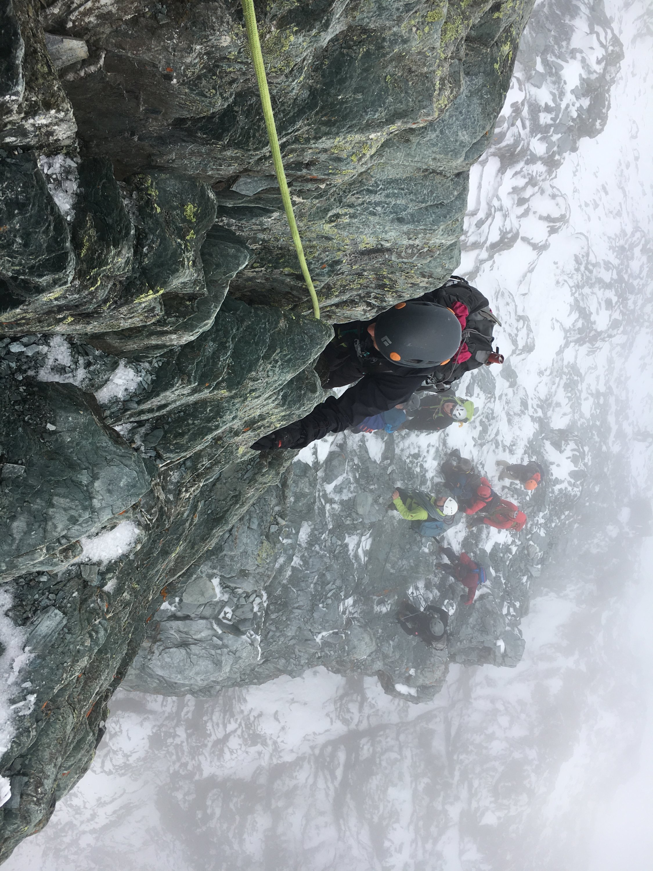 Der Fels war mit nassem Schnee bedeckt, was die Kletterei um mindestens einen Grad schwieriger machte. Unser Bergführer Jan Malaer von der Bergschule Grischa sicherte jedoch unsere Viererseilschaft. Es gab ein paar gefährliche Stellen, an denen ich keine guten Griffe und Tritte fand und nur mit Hilfe des Seils weiterkam. Gleichzeitig waren noch 2 andere Seilschaften unterwegs, die nur sehr langsam vorwärts kamen, weshalb wir mehrmals warten mussten.