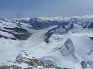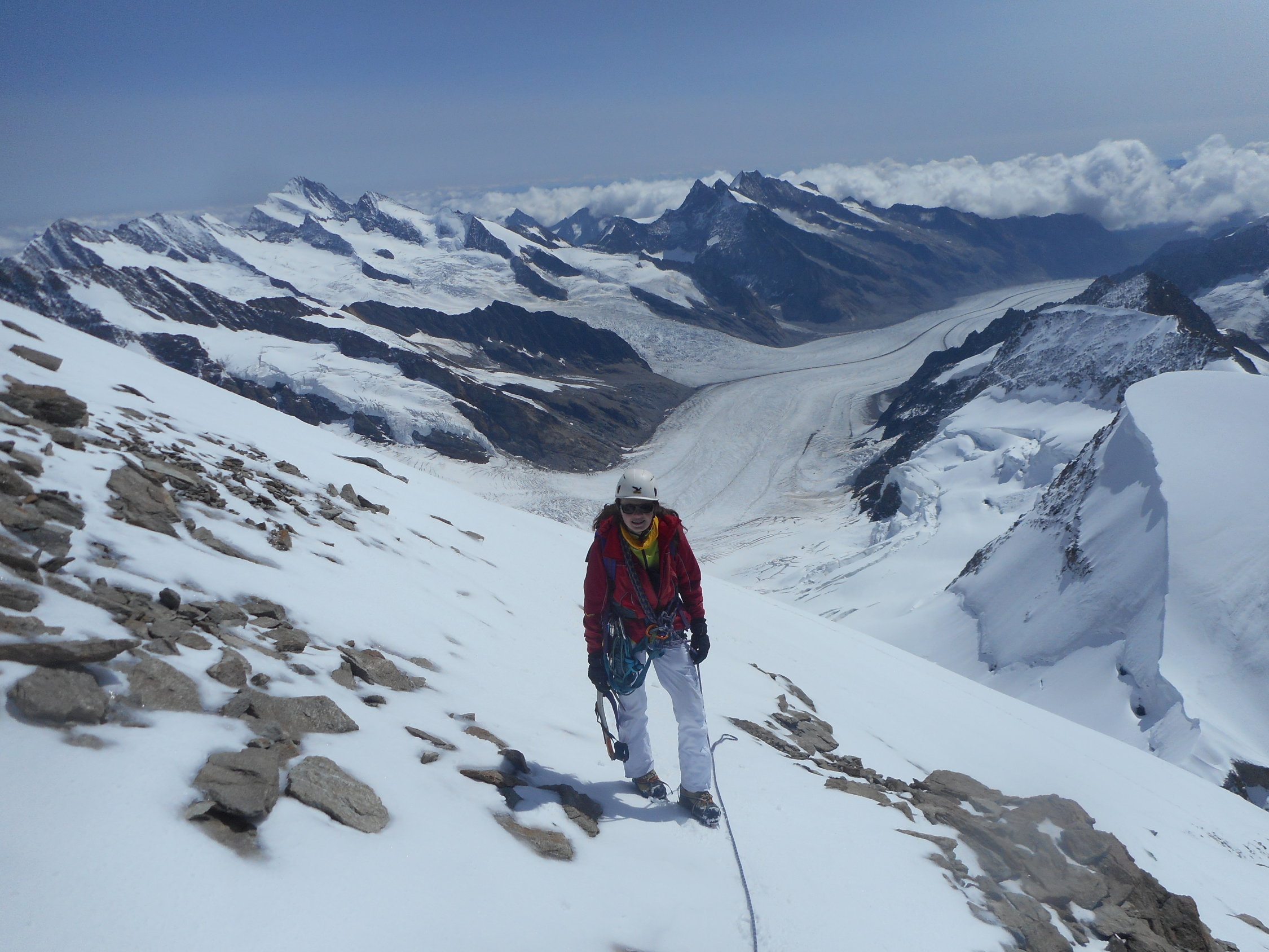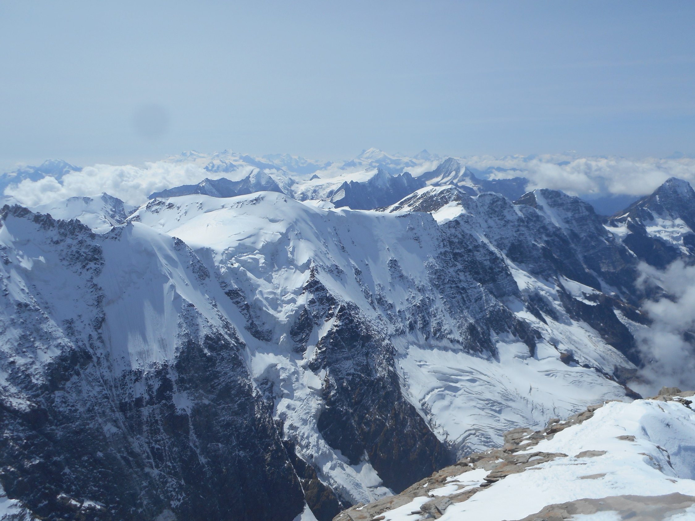 Das Gipfelpanorama ist einzigartig. Vom Mont Blanc Massiv, über die Walliser-, Berner-, Zentral- und die Bündneralpen erblicken wir ein endloses Gipfelmeer. An die 60 4000er sind zu sehen. Sehr eindrücklich der Tiefblick auf den Aletschgletscher, und die vielen anderen Gletscher. C`est fantastique!