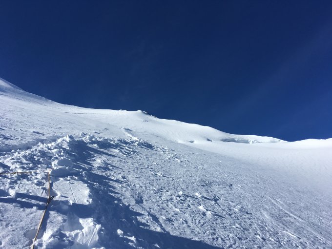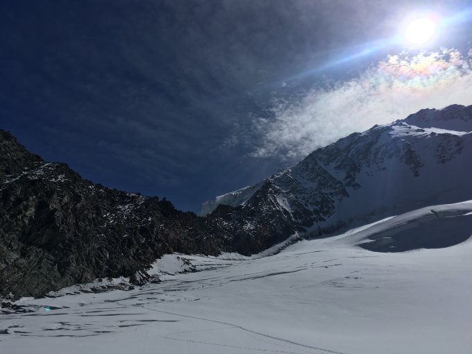 Zum Festigrat. Der untere Teil ist mit Firn und Hartschnee. Im mittleren Teil wenig Schnee, guter Fels. Gegen oben hin wird es eher pulvrig und ab der Gabelung wieder Firn und Hartschnee. Der Abstieg dank der guten Spur leicht zu meistern.