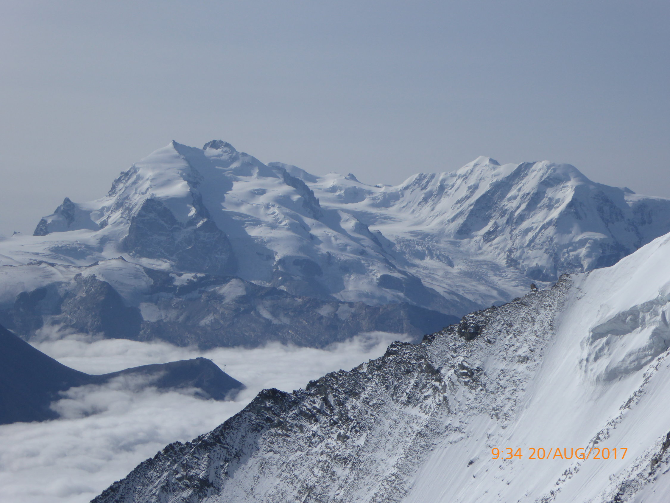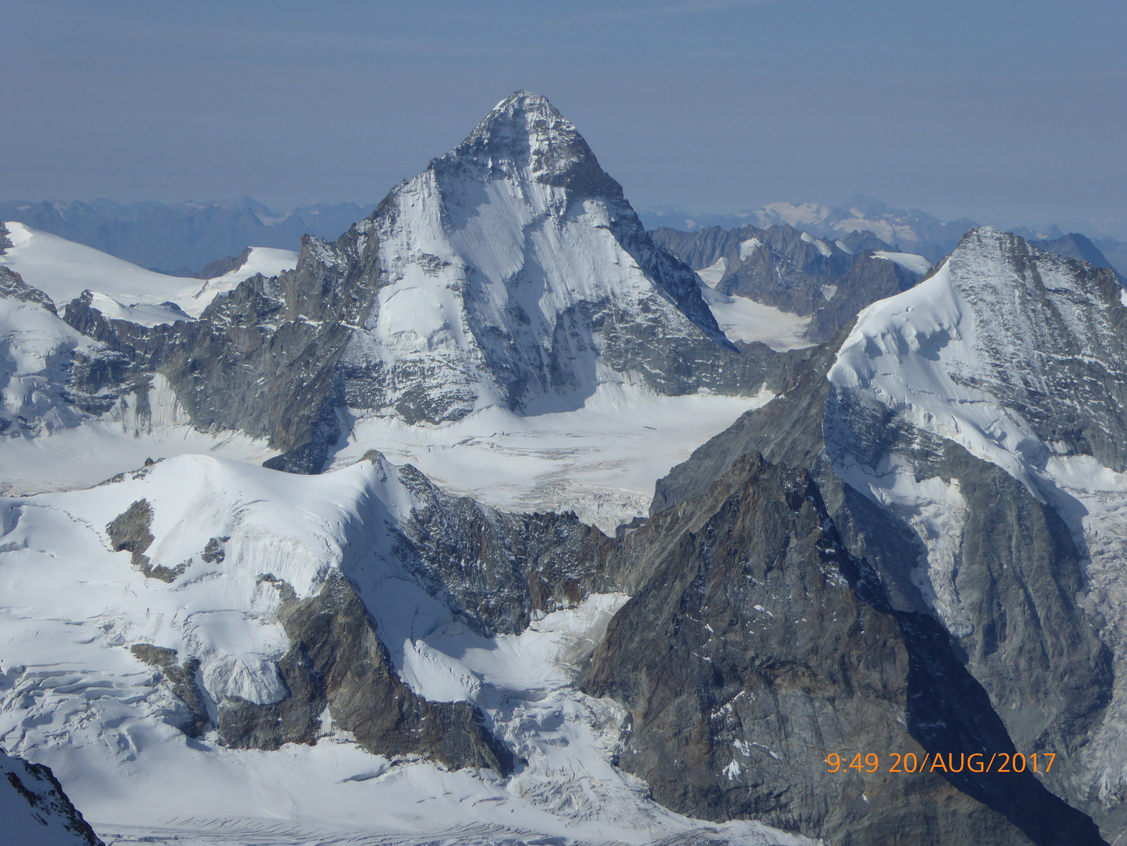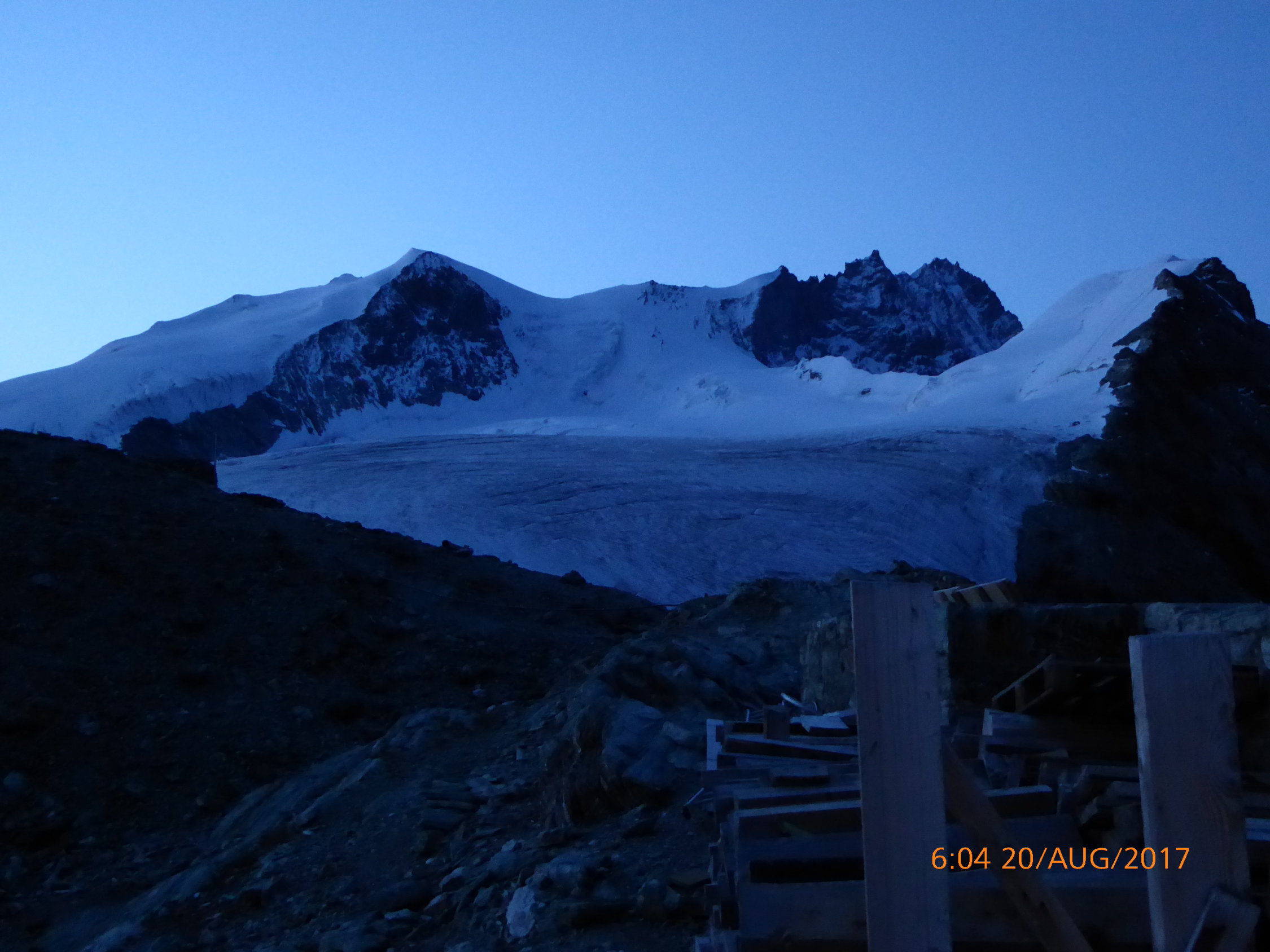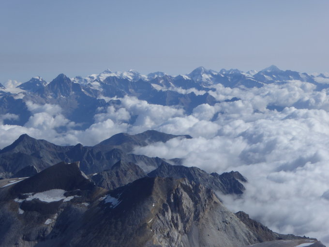 Das Bishorn ist ein Pracht-Aussichtsgipfel, leider auch ein Probiergipfel für viele Neueinsteiger. Viele Überholmanöver in den flachen Passagen, zu früher Wiedereintritt in die Spur mit Behinderung, oben am steileren Hang hängen diese Spezialisten und blockieren den Weg durch mangelnde Trittsicherheit im Neuschnee. Riesige Seilschaften, 10 Leute am Seil, die die Spur auf ganzer Länge blockieren. Tracuit-Hütte gute Bewartung, aber es fehlt an den nötigen Einrichtungen, auch sanitärer Art, um morgens zügig loszukommen. Am Besten startet man sehr bald nach dem Frühstück oder wie wir als vorletzte Seilschaft, um aus dem Pulk herauszukommen. Beim Schlussaufschwung auf die Eiskappe des Bishorn heisst es anstehen. Spannende abenteuerliche Seilmanöver (sichern aus der Hand direkt an der Kante) und Flüche. Schön, dass es an dieser Stelle eine phantastische Aussicht auf das Weisshorn und die Monte Rosa, sowie Dom und Täschhorn hat. Auf dem Gipfel ein sagenhafter Blick Richtung Dent Blanche und Mont Blanc.