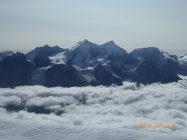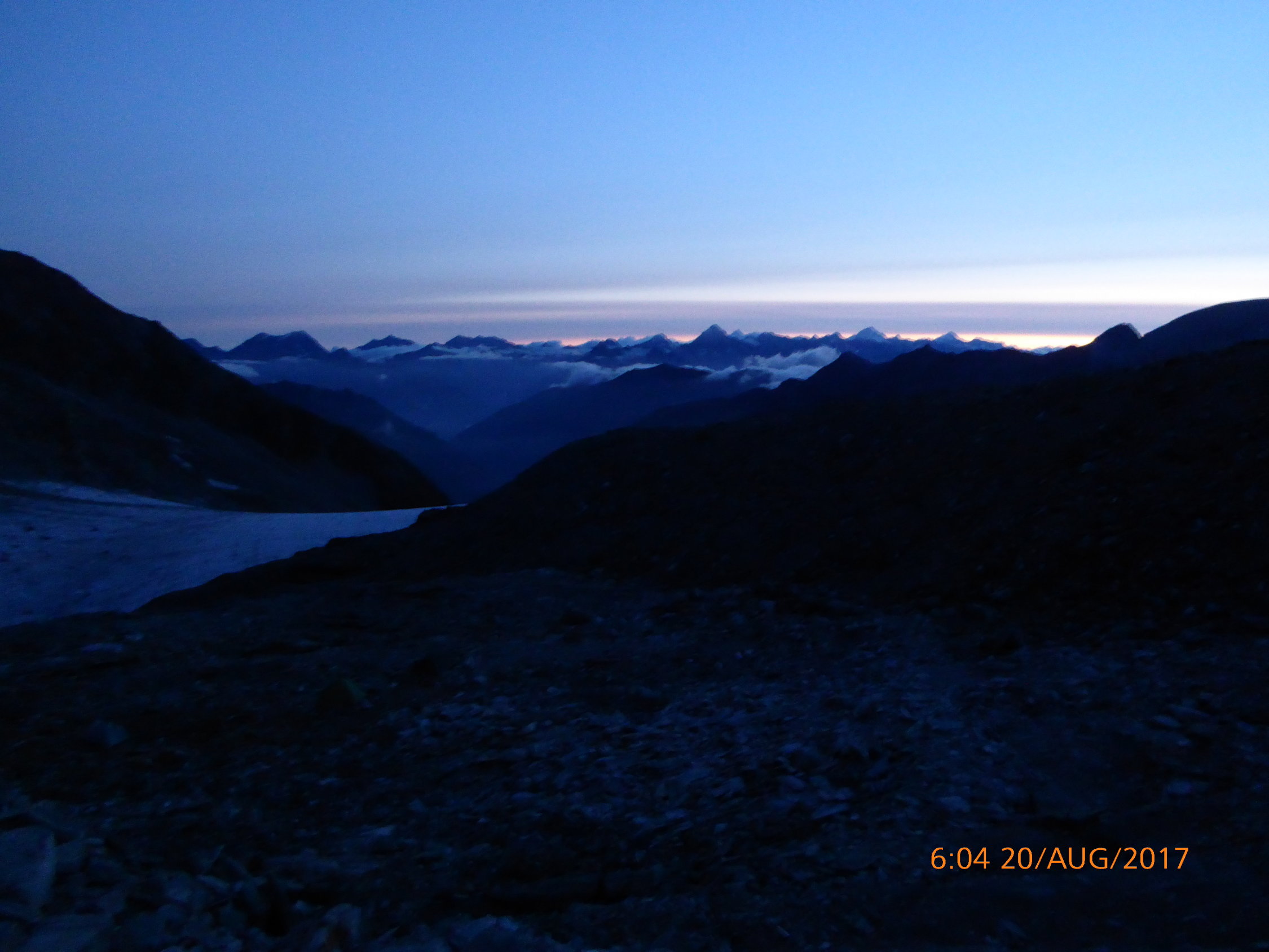 am Morgen wolkenloser Himmel, am Nachmittag wie vorausgesagt Quellwolkenaufzug, Wolkengrenze Tracuithütte. Untere Spaltenzone Turtmanngletscher trotz der Niederschläge von Freitag auf Samstag weitgehend aper, Spalten (auch eingeschneit) gut zu sehen. Aufstiegspur vorhanden. Im oberen Teil des Gletschers zunehmend Pulverschneeauflage, durch Triebschnee auf der Leeseite des Bishorns ab etwa 3900 m auf etwa 10-20 cm zunehmend.