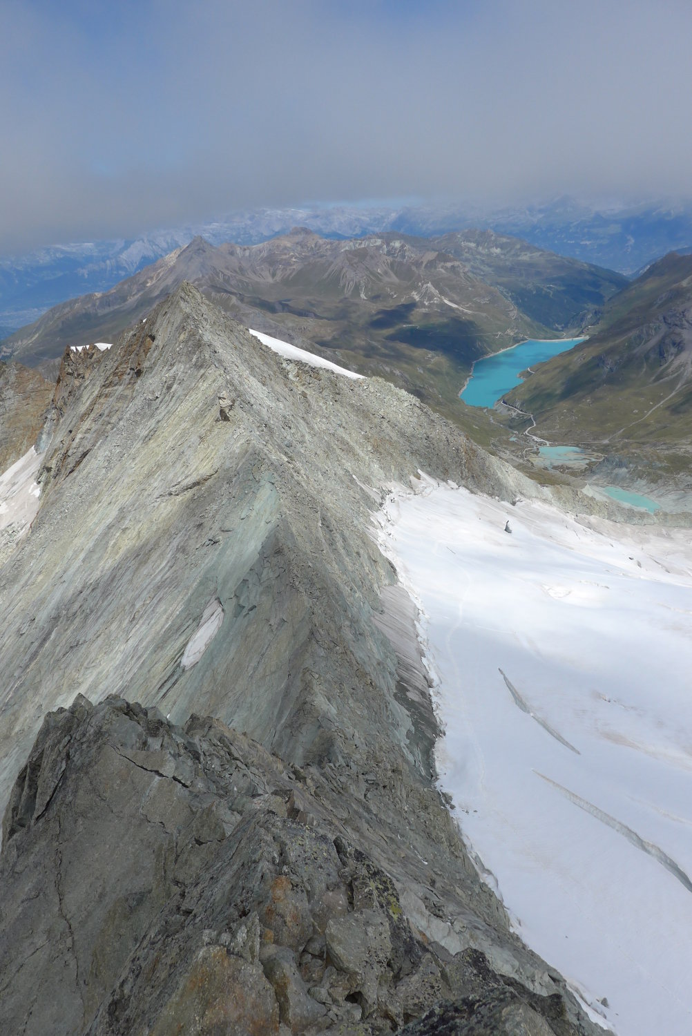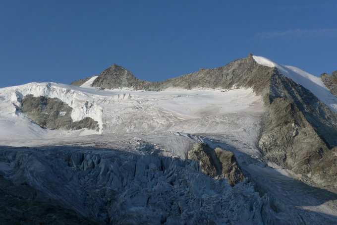 Der Gletscher ist im unteren Teil ausgeapert, die Spalten gut erkennbar. Zustieg zum Grat der Pointes de Mourti ist gut machbar. Der Firngrat ist auch schon am Ausapern, aber griffig. Der Klettergrat selbst ist schneefrei und gut zu Klettern. Ergänzend zum sehr guten Tourenführer hier: Es gibt noch eine eingerichtete Abseilstelle am Col des Rosses als Notausstieg.