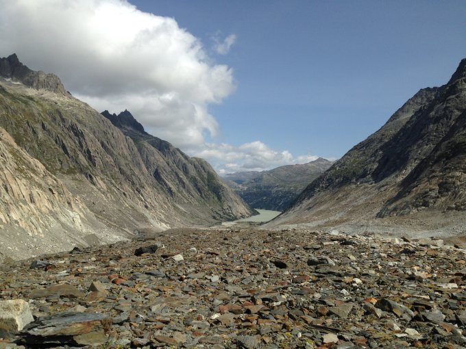 Die Abzweigung auf Lauteraargletscher ist nicht markiert. (Beim grossen Stein mit dem ersten grau übermalenen Pfeil gerade auf den Gletscher)