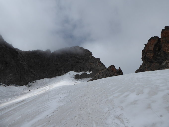 Porchabella-Gletscher weitgehend aper,Felsen im Gipfelaufbau trocken.
