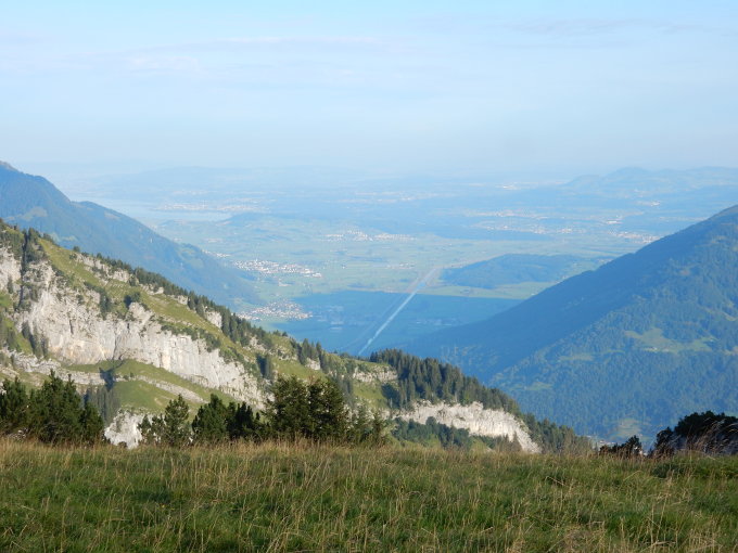 Gestern war der Fels trocken, das Gras saftig, das Wetter diesig-mild, und das Gestein ist in vielen der beschriebenen Kletterstellen (Risspassage ob Stogglochhütte, Fingerriss, Ruchen-Nordgrat) gut ausgeputzt. Natürlich liegt in den Rinnen und auf den Bändern auch jede Menge Schutt und Geröll, aber das erleichtert in diesen Passagen wiederum oft die Wegfindung (Trittspuren). Die erwähnten Pfeilmarkierungen sind vielfach verblasst und kaum mehr kenntlich, auch entdeckte ich viel weniger Steinmänner als erwartet.