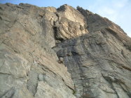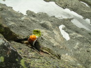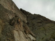 Aufgrund des als labil vorhergesagten Wetters waren wir früh unterwegs, die ersten beiden SL waren von den am Vorabend niedergegangenen Niederschlägen noch nicht abgetrocknet. Ob solche Verhältnisse noch als "gut" zu bewerten sind, ist Einstellungssache. Vorsteiger Haydar war jedenfalls der Meinung ;-). Weiter oben wurde es trockener, da waren die schwierigsten Stellen allerdings schon gemeistert.
