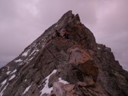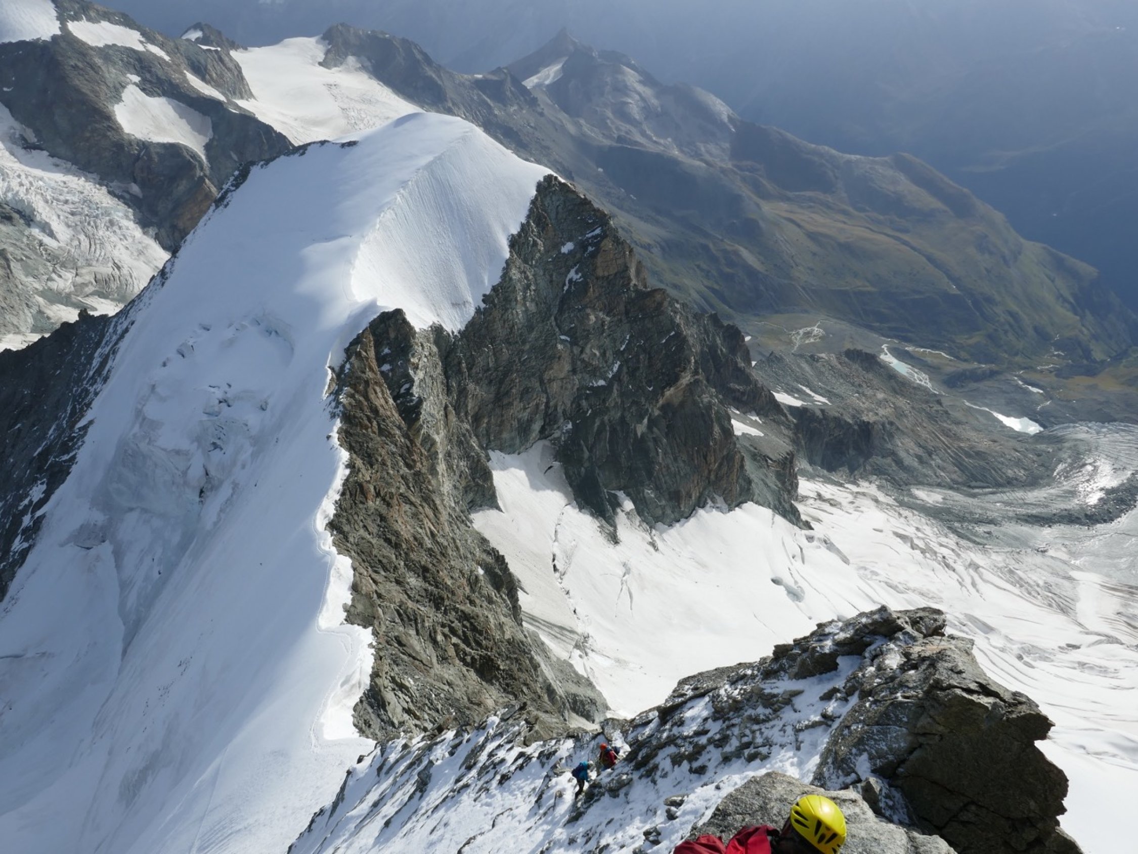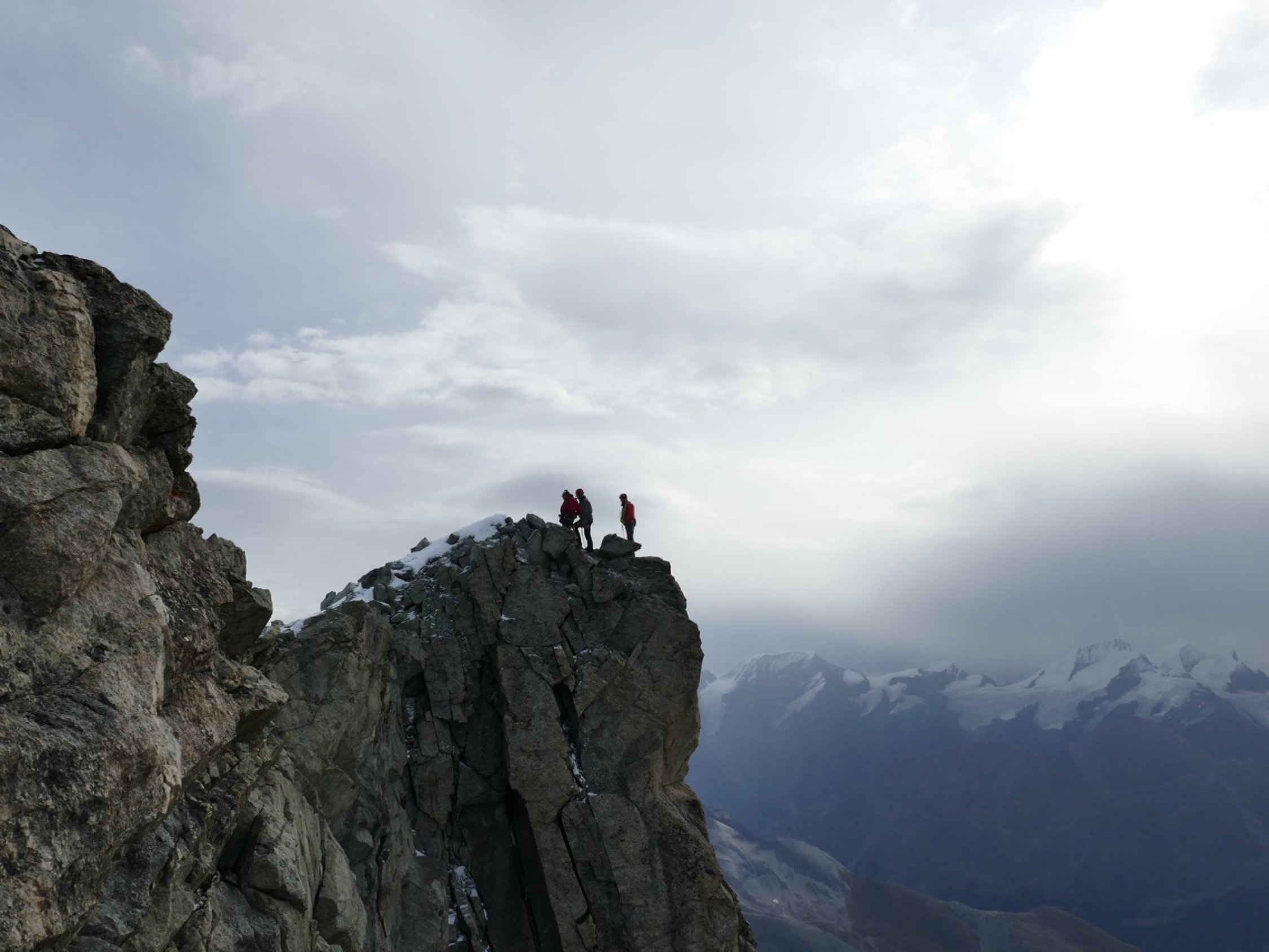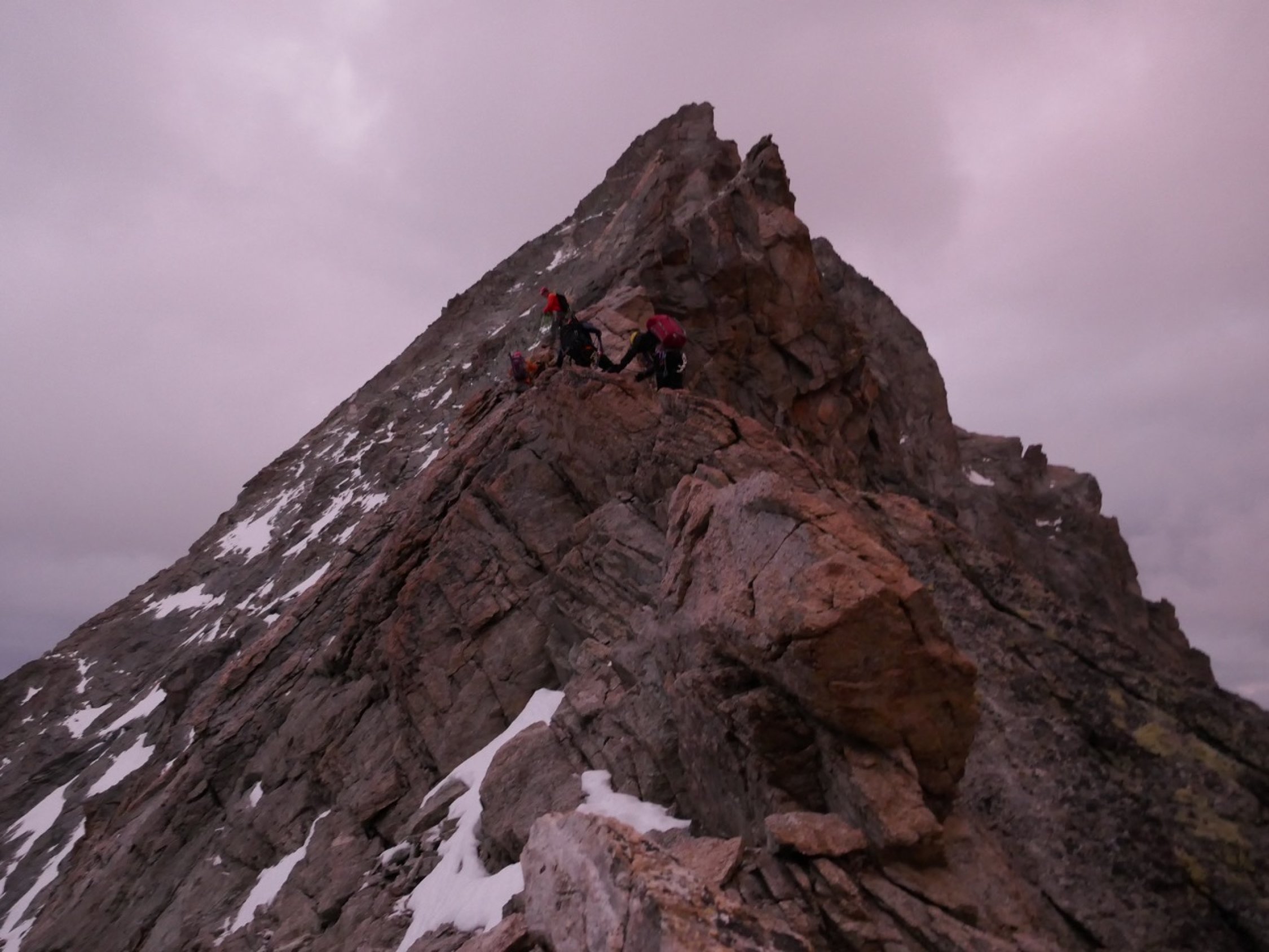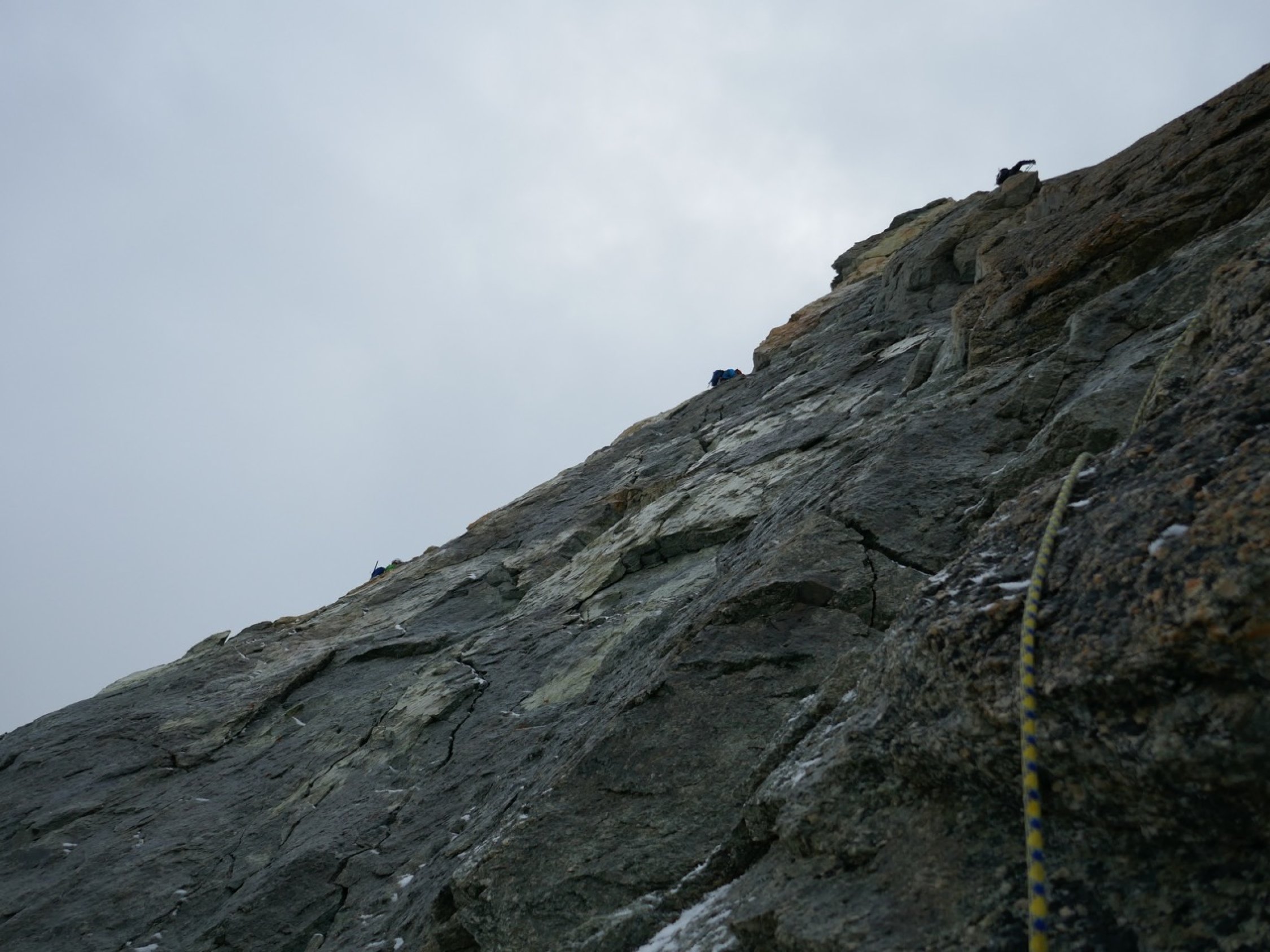 Morgen früh Schneefall, dann zunehmend sonnig, heikles Klettern in den mit Graupelschnee gefüllten Felsen.
