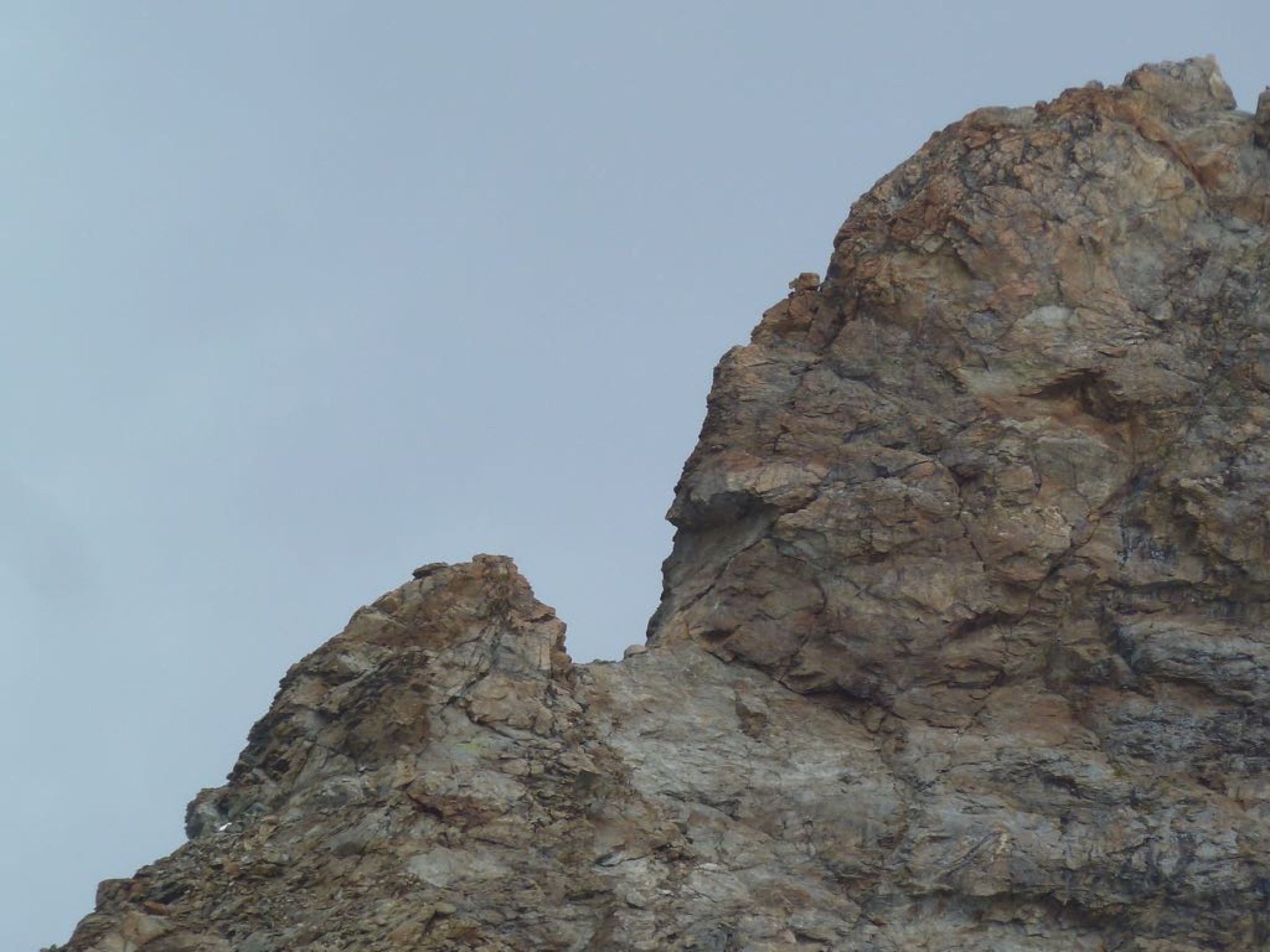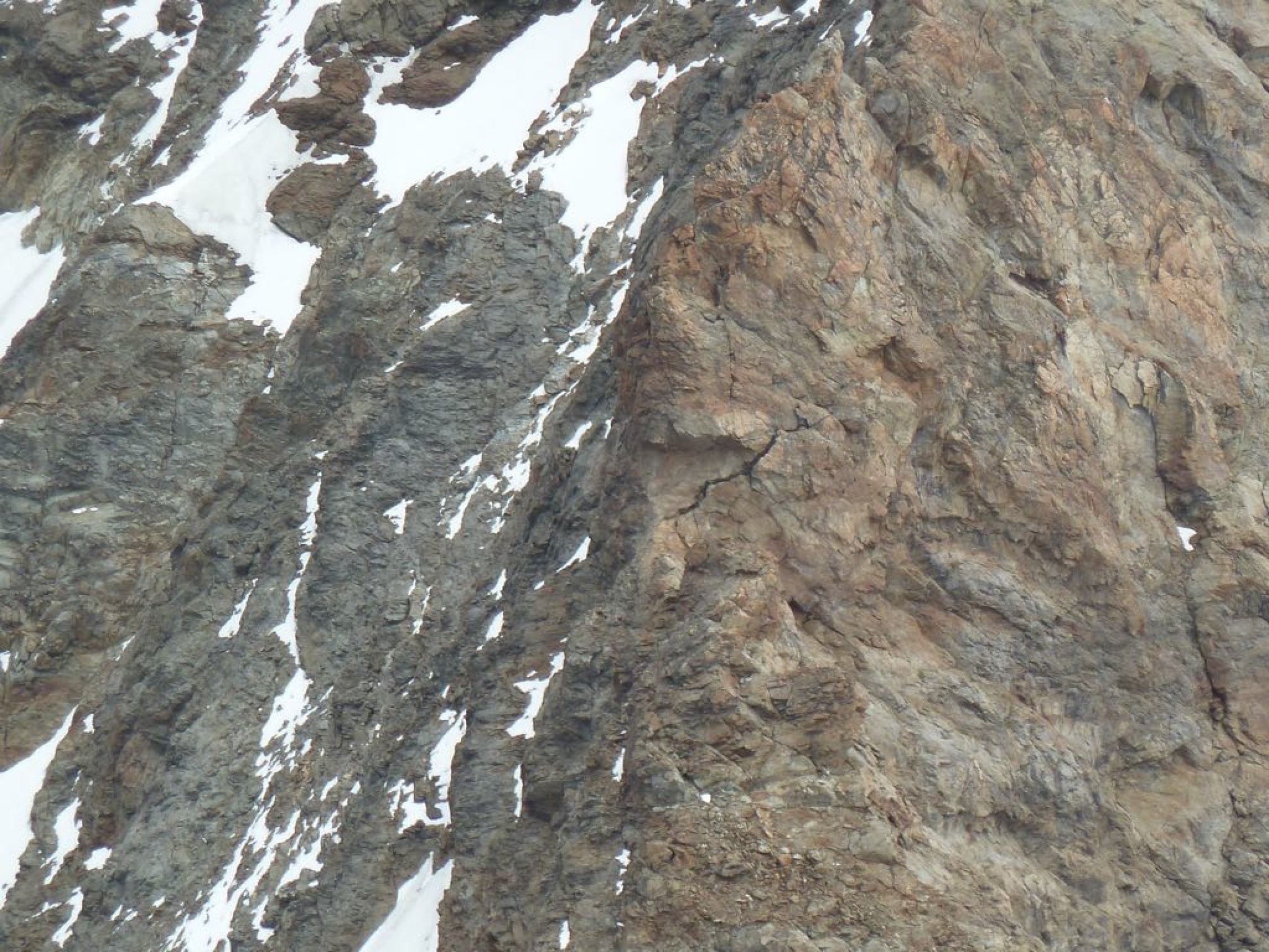 Vom Einstieg ginge auch nach schräg rechts oben ein gewaltiger Riss. Die Stelle entlang dieses Risses zu erklettern haben wir uns nicht getraut, weil die Sache auf uns nach wie vor einen irgendwie instabilen Eindruck gemacht hat. Auf camptocamp schreibt aber jemand, dass er die Stelle genau über diesen Riss erklettert hat.