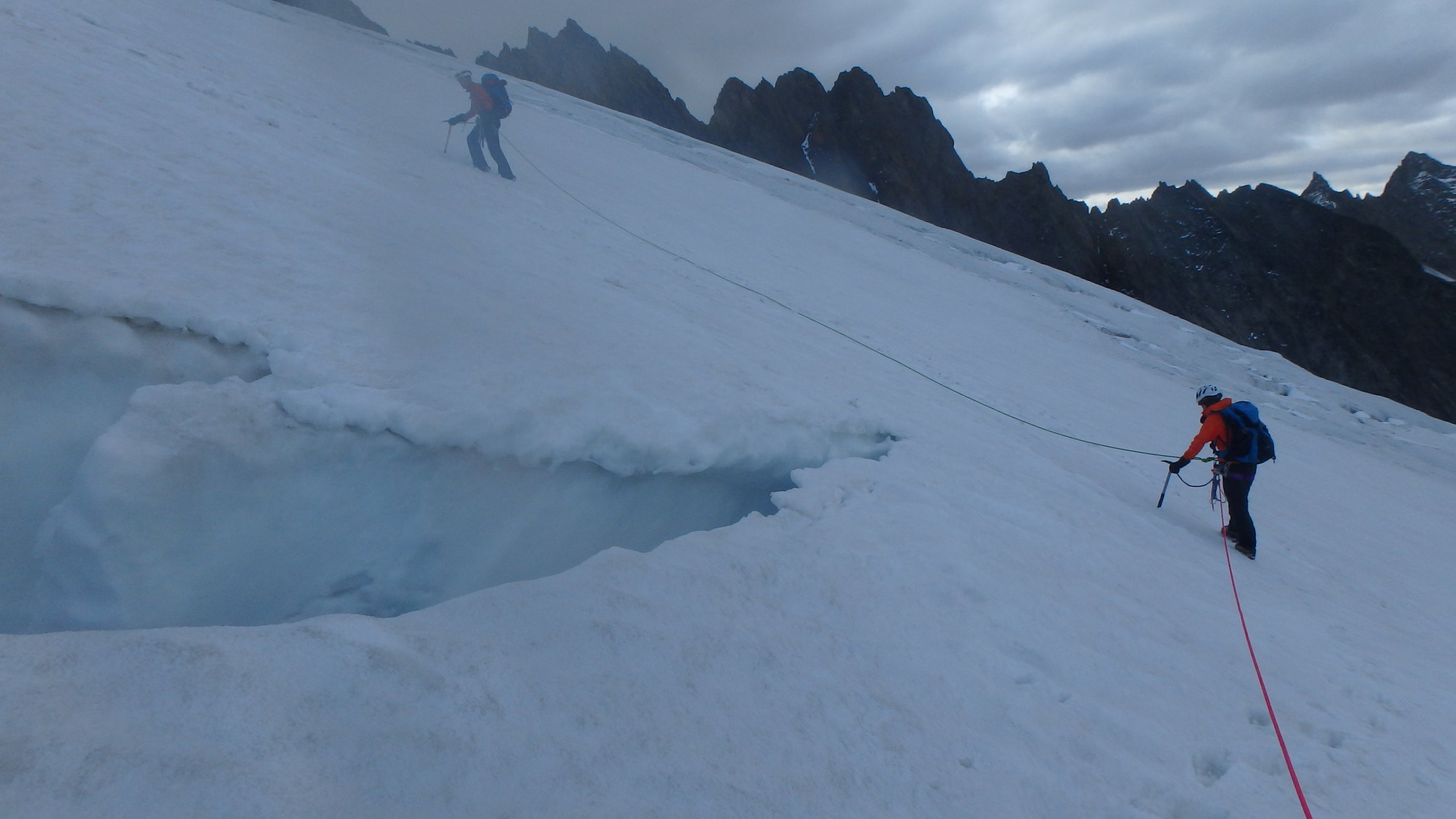 Insgesamt trafen wir gute Verhältnisse an. Lediglich der kurze, sehr steile Übergang vom Oberaletschgletscher auf die Moräne war unangenehm, aber machbar. Der Weg von der Hütte bis auf den Blockgrat ist mit Reflektoren sehr gut markiert, was in der mondlosen Nacht speziell hilfreich war. Der Übergang vom Blockgrat auf den Gletscher (Pt 3396) war noch problemlos. Von da über den teilweise ausgeaperten Gletscherhang bis zu Pt. 3736 gehts noch gut, aber die Brücken werden weniger und schwächer. Im oberen Bereich sind in der Rinne rechts (von unten gesehen) nahtlos massive Stangen bis zum Gipfel montiert. Da der Abstand teilweise über 25 Meter beträgt, reicht ein 50 Meter Seil nicht immer, um von Stange zu Stange abzuseilen. Wegen der teilweise etwas unangenehmen Schneeauflage haben über das ganze Rinnensystem abgeseilt, obwohl das nicht überall nötig gewesen wäre. Mit mehrfachen, durch Wetterkapriolen erzwungenen Pausen und Abseilen an den Stangen vom Gipfel haben wir 18 h gebraucht. Eine 2-er Seilschaft war bei gutem Wetter am Vortag 1 h schneller. Sektionstour SAC Kamor.