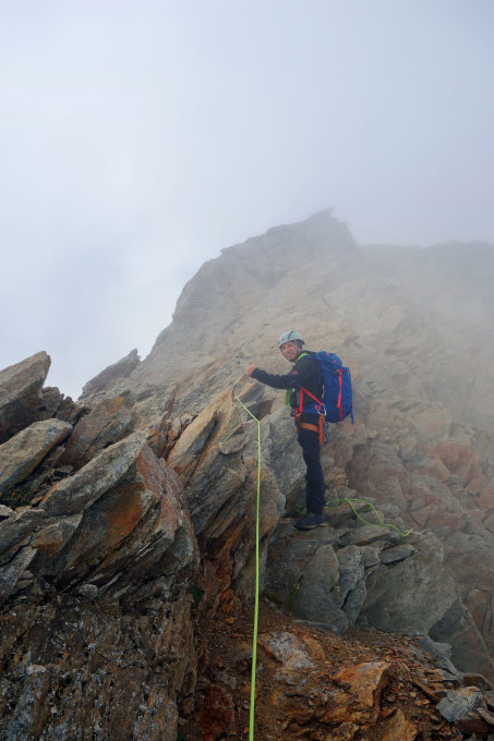 Trotz Nebel und Wolken und deshalb entsprechend schwieriger Routensuche ab Chipfeseeli bis auf den Hangendgletscher, fanden wir den Einstieg auf das letzte Gratstück trotzdem. Hangendgletscher im unteren Bereich aper, dann firnig. Der steile Schlussanstieg auf den Grat teilweise in gutem Trittfirn und teilweise in weichem Schnee. Steigeisen von Vorteil. Gratstück aper, teils etwas brüchig, jedoch in der Regel gut abzusichern mit Schlingen.