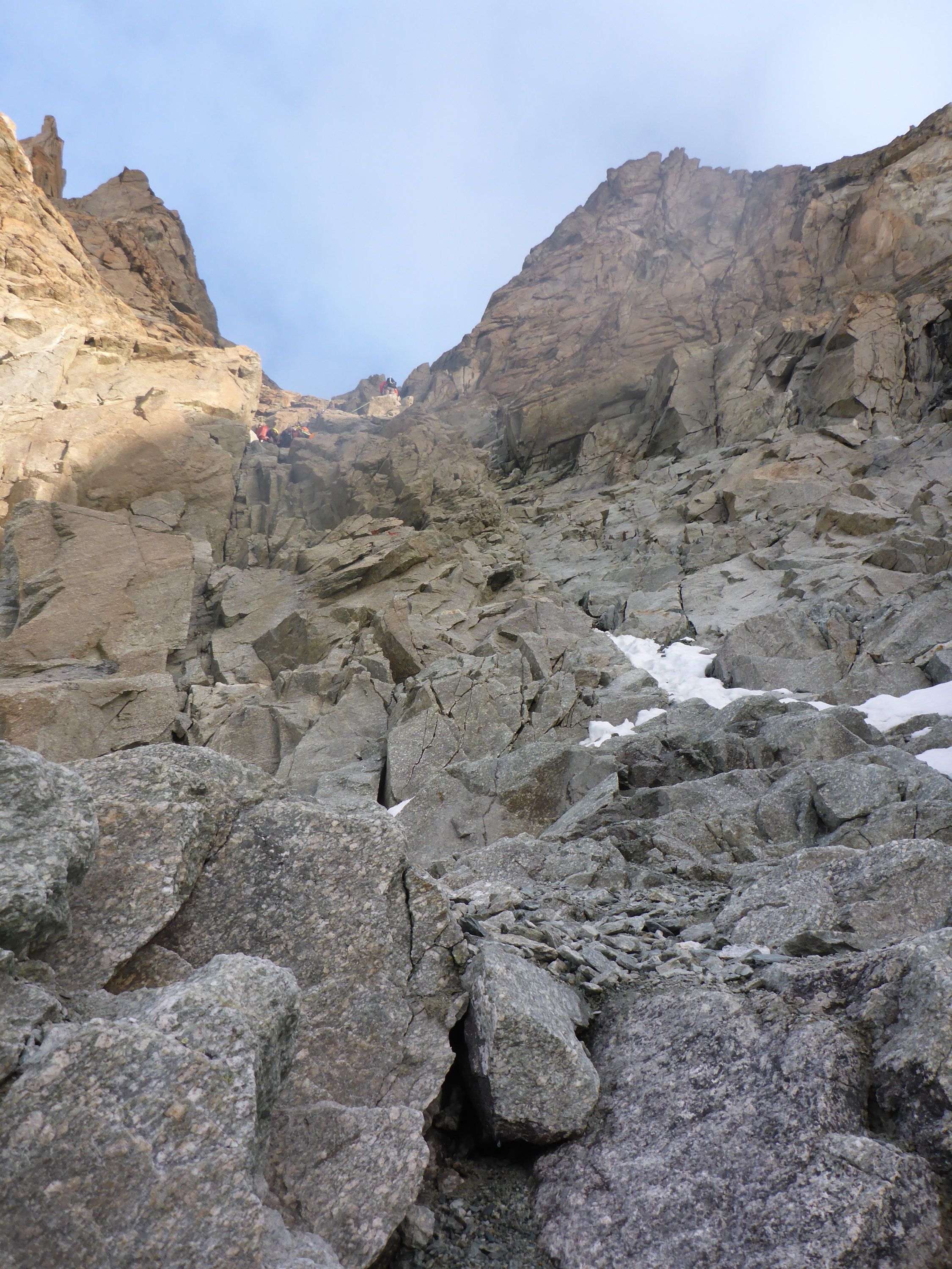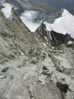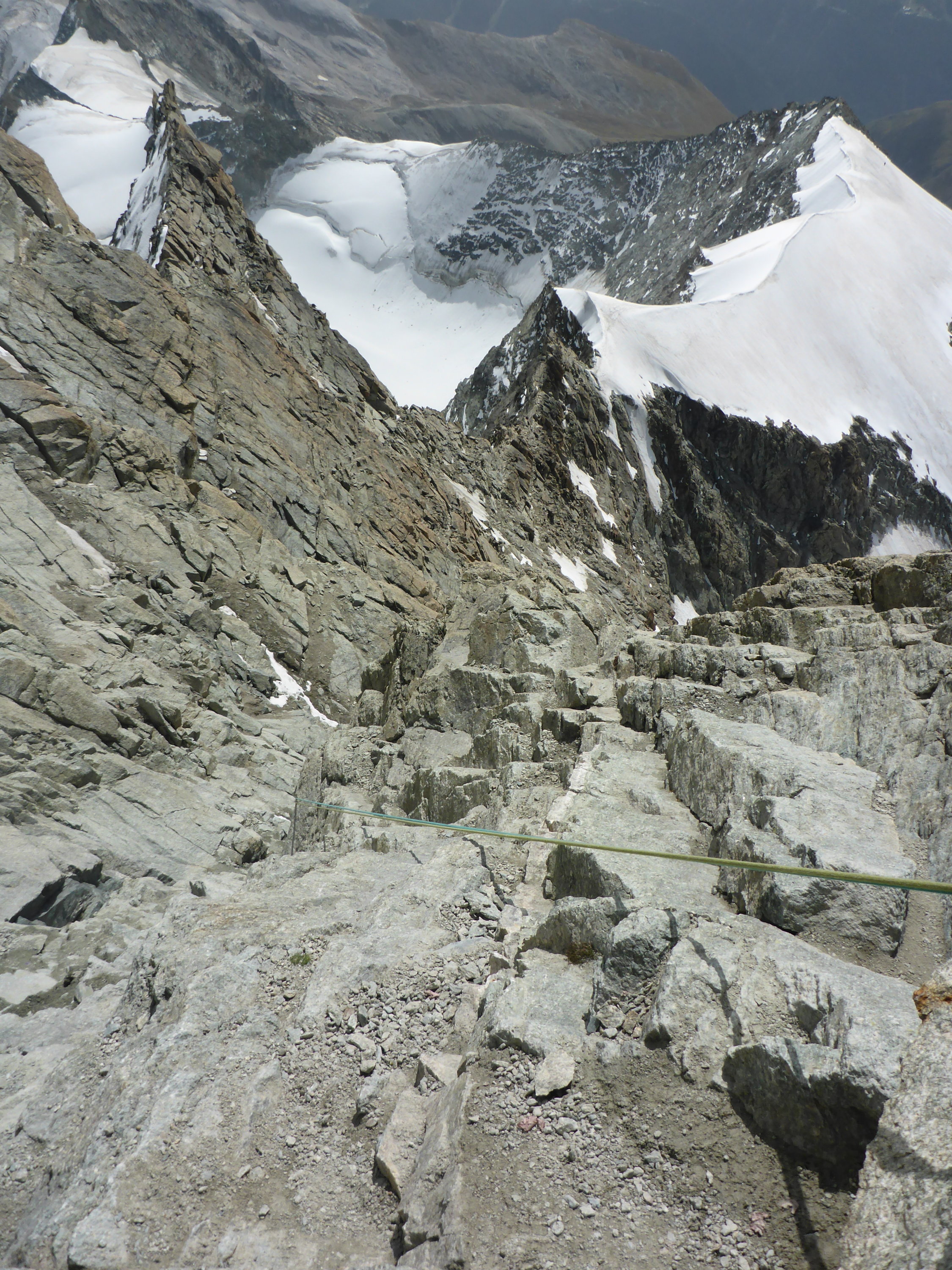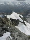 Super Bedingungen. Gletscher in Ordnung, guter Trittschnee. Felsen trocken, Binerplatten ohne Eis, darüber auf der Rippe minimal Schnee. Lässt sich ohne Steigeisen machen.