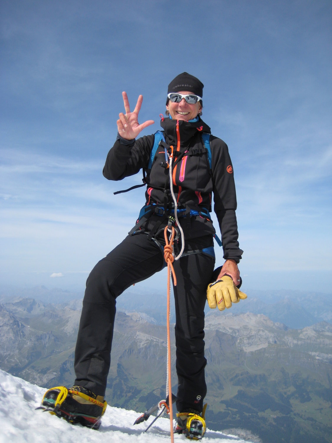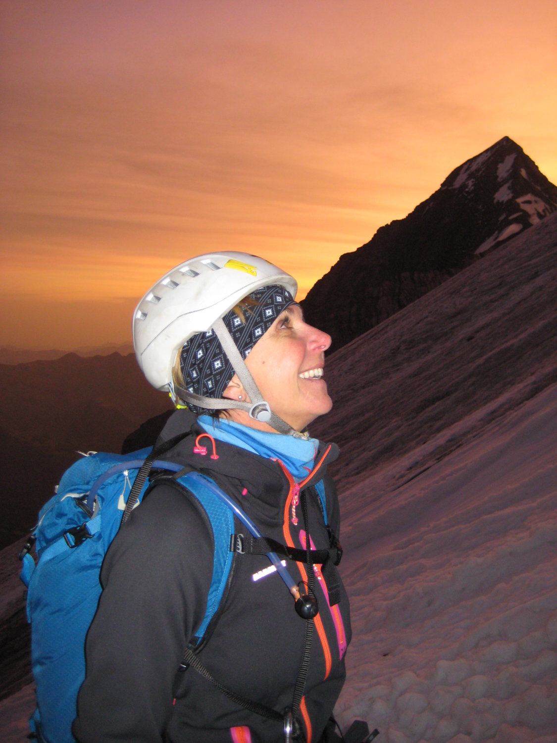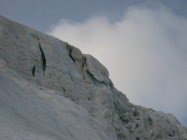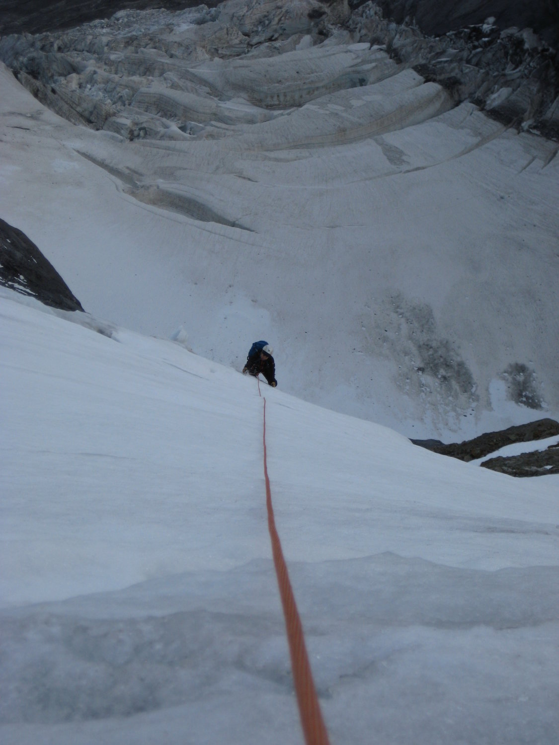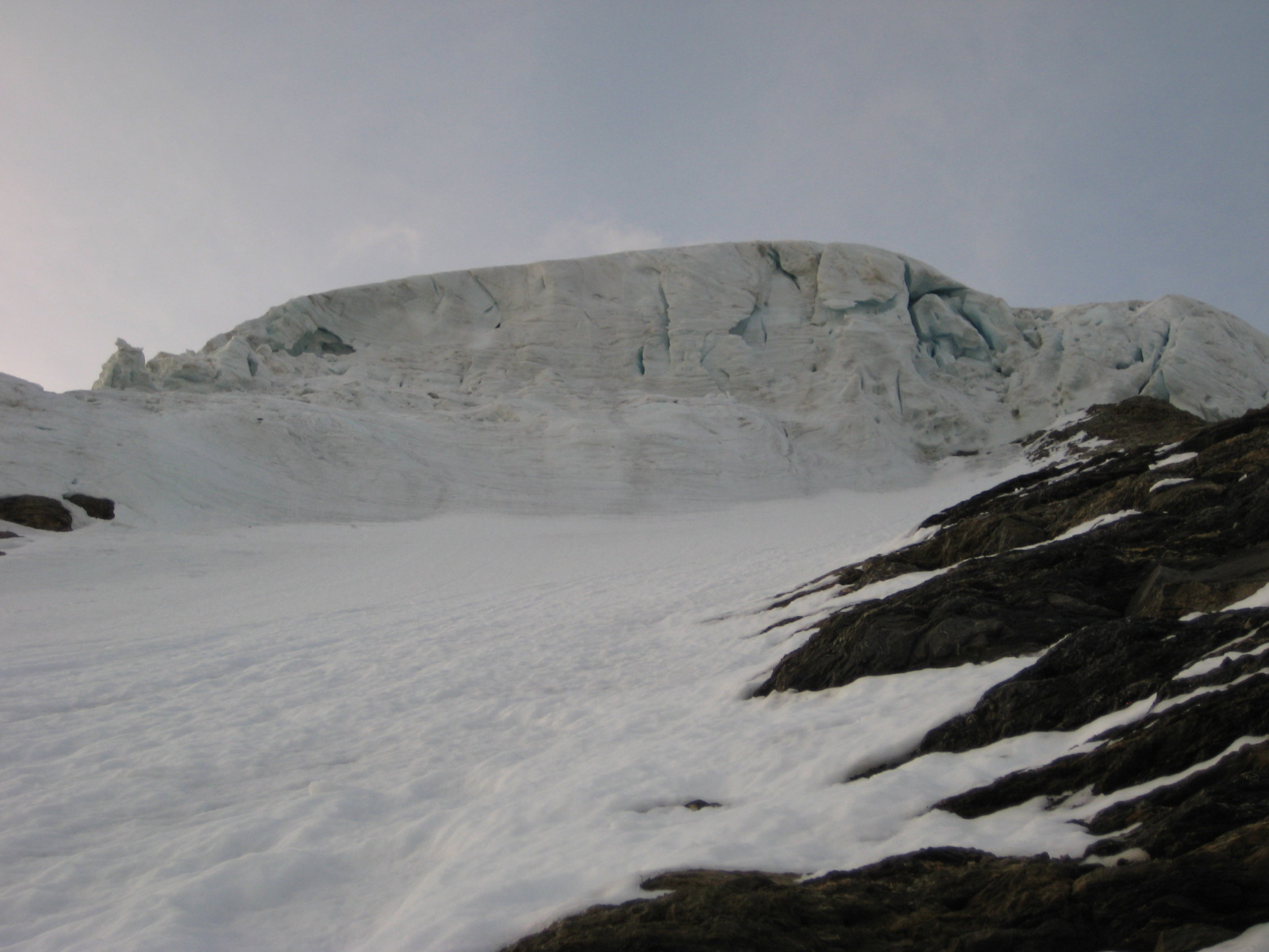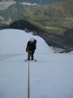 Der Bergschrund oberhalb ist problemlos und darüber ist feiner Trittschnee bis zum Gipfel.