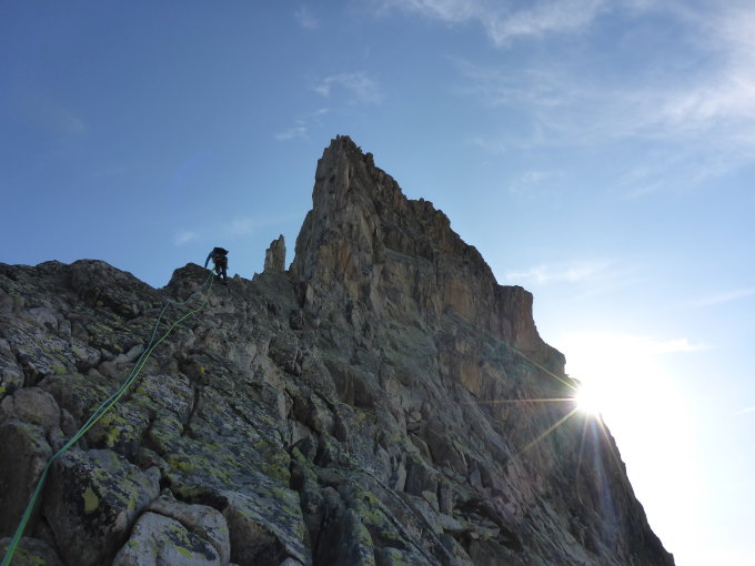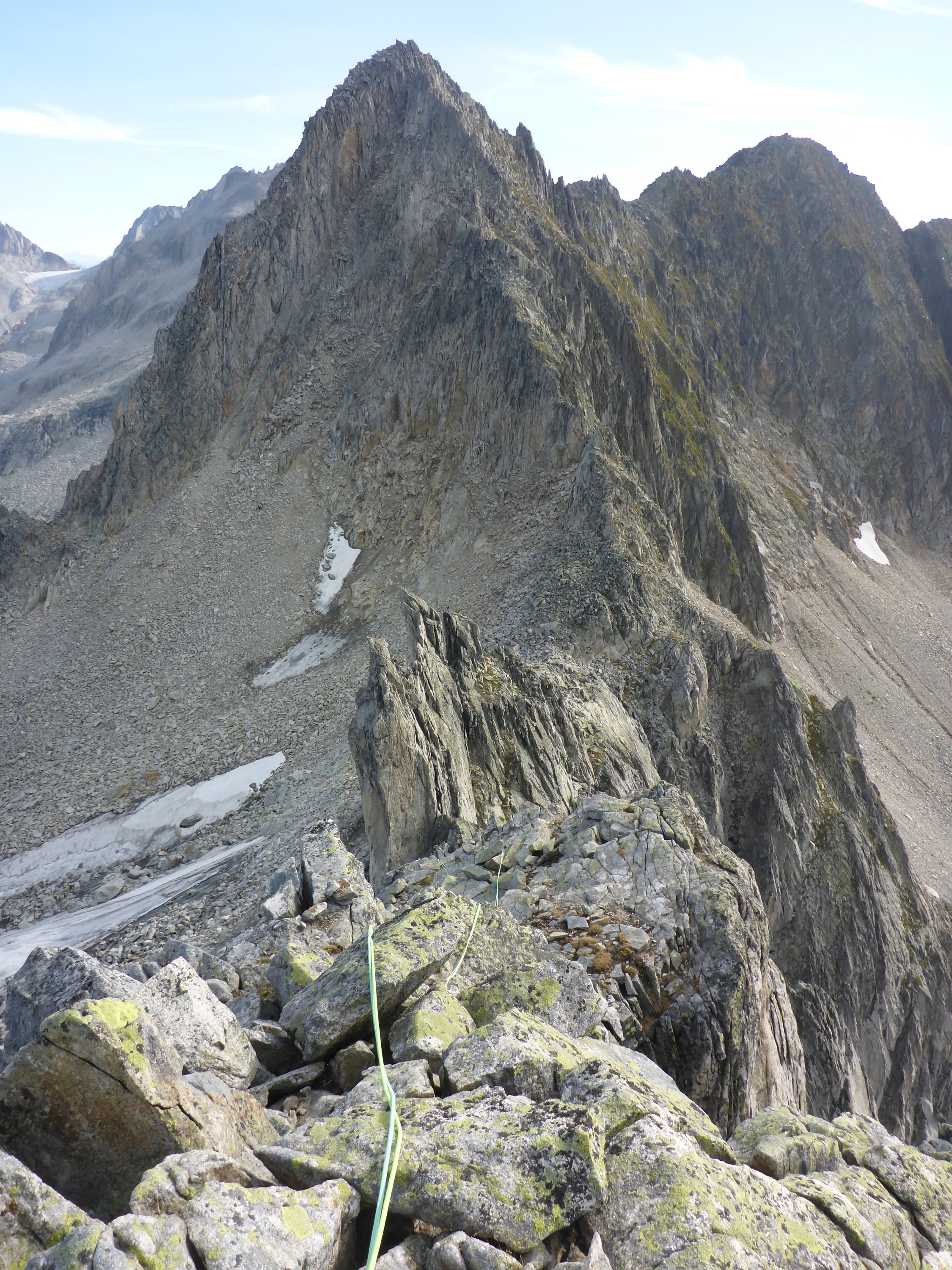 Ganzer Grat trocken und meist schön und fest. Gletscherüberschreitung im Abstieg problemlos ohne Steigeisen möglich.
