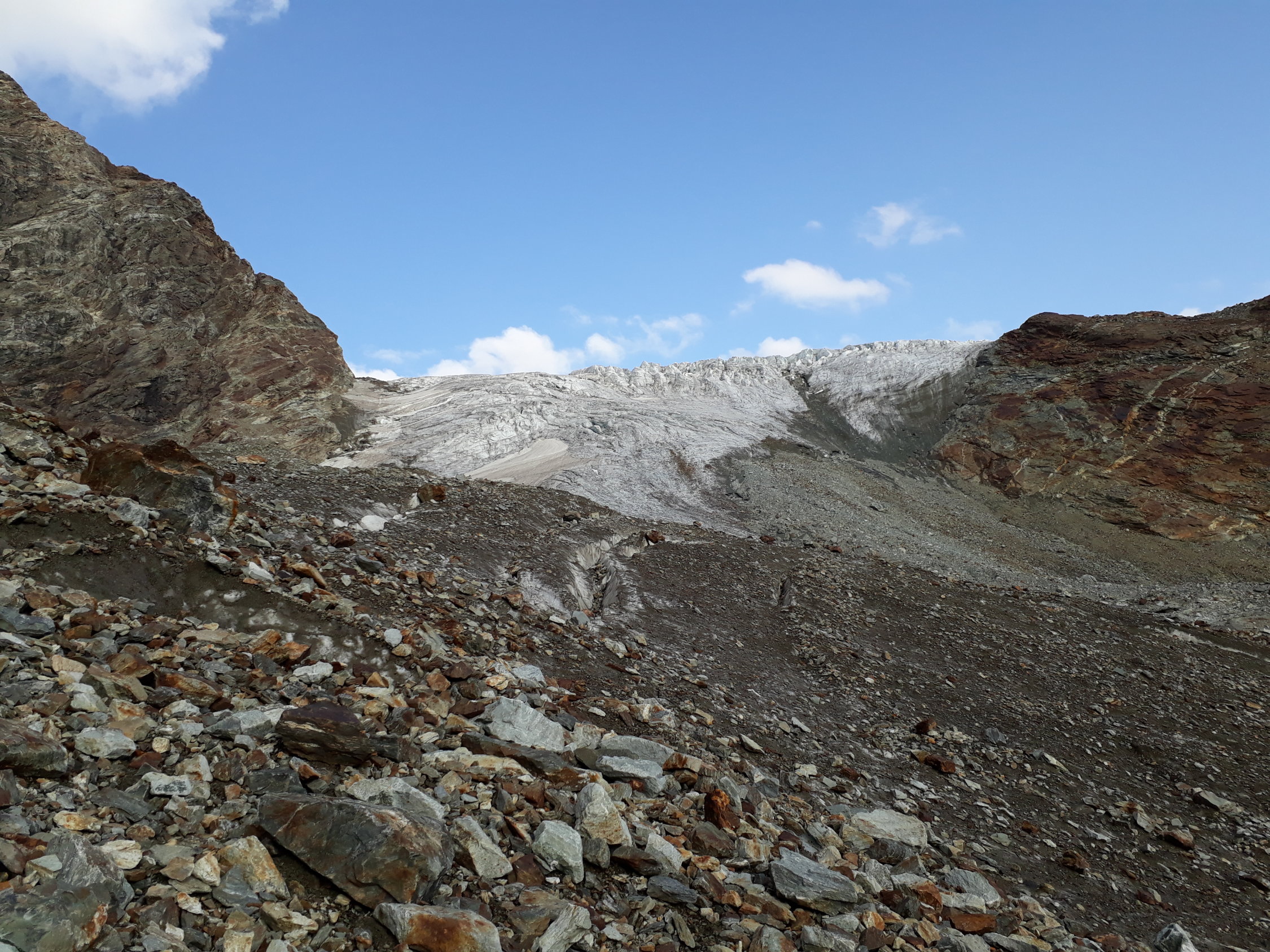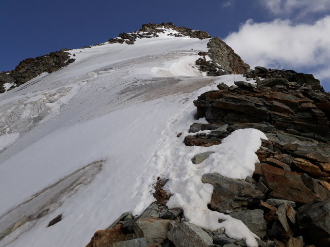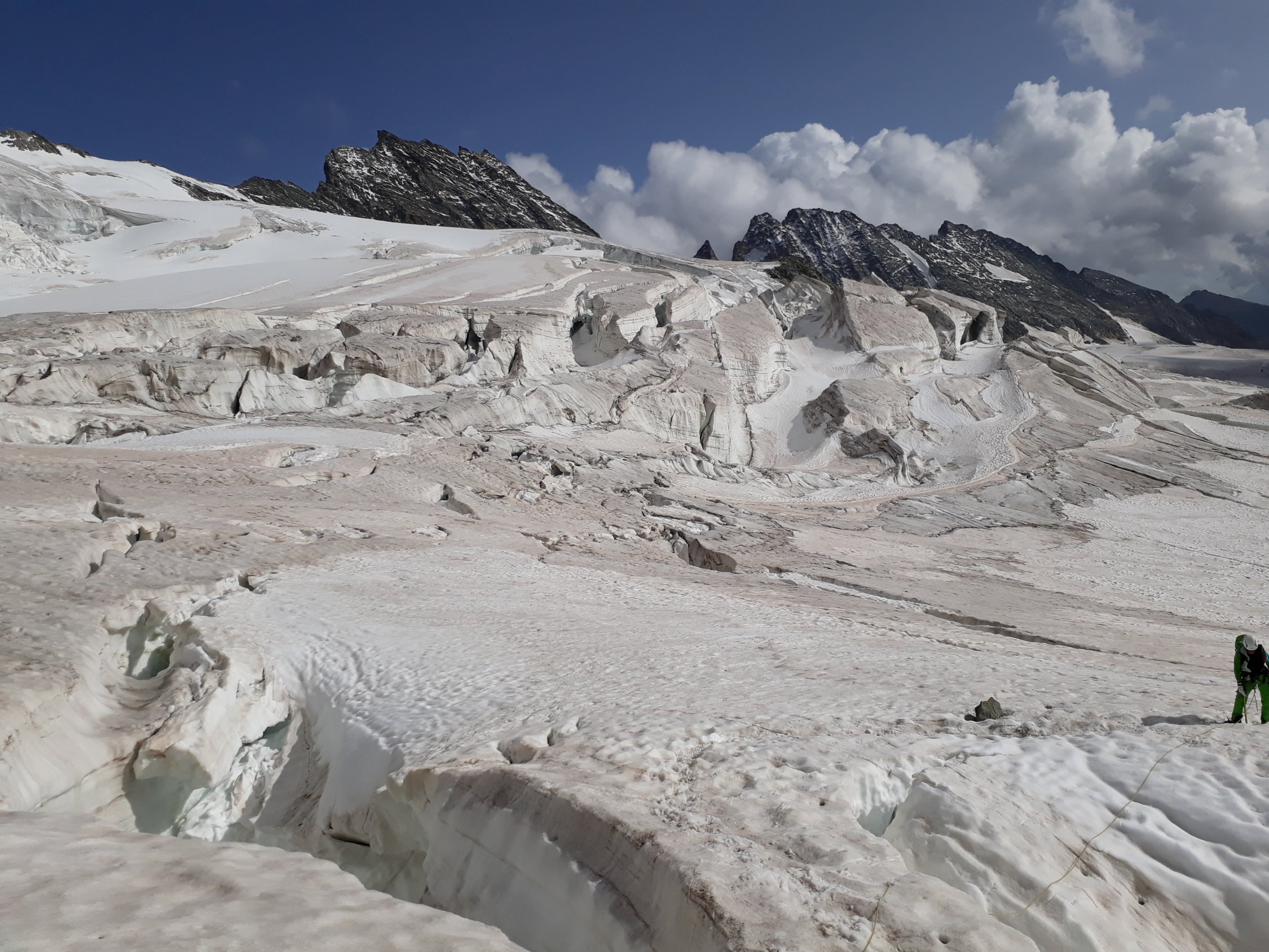 Der Grat war trocken (vor der Kaltfront vom 31.8.17) die Spaltenbrücken stabil und im ersten Gletscherbruch gab es auch zwei Möglichkeiten (li + über die Rampe) hindurchzukommen.