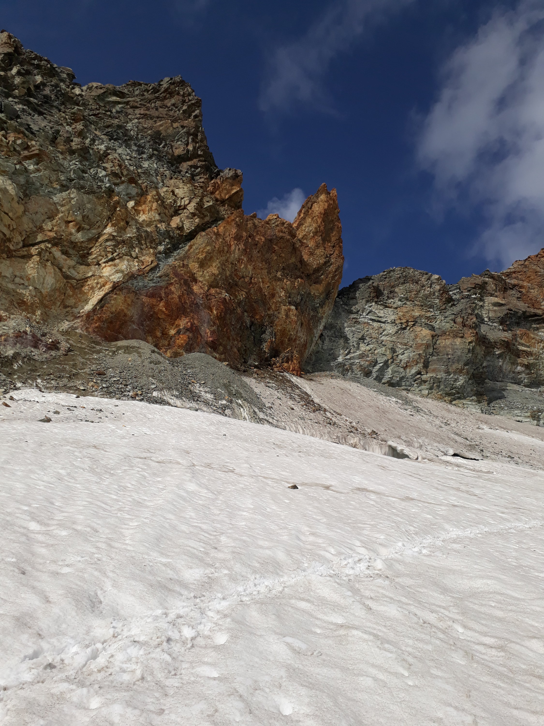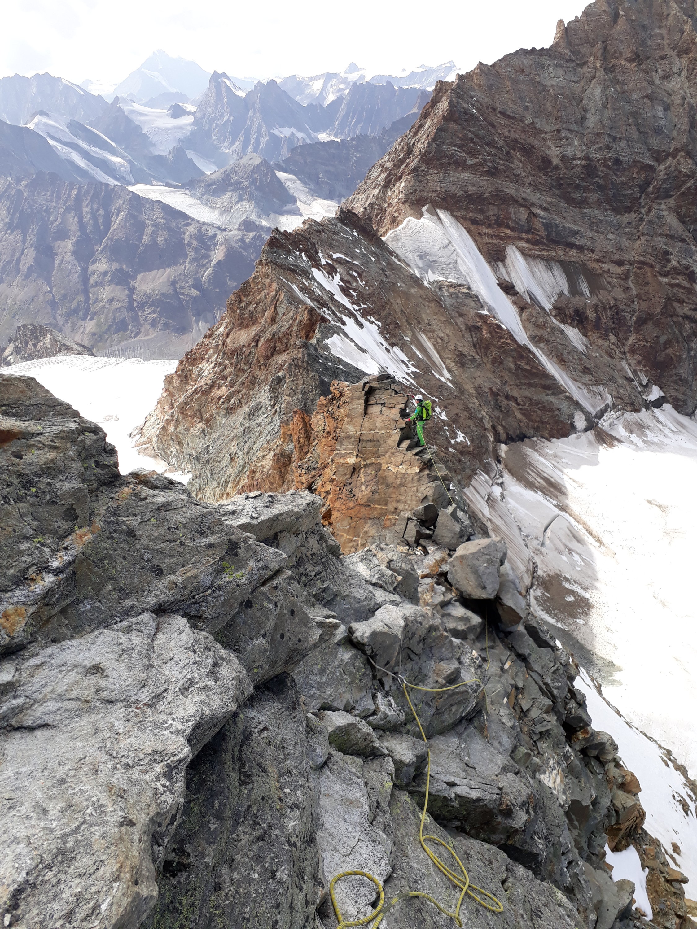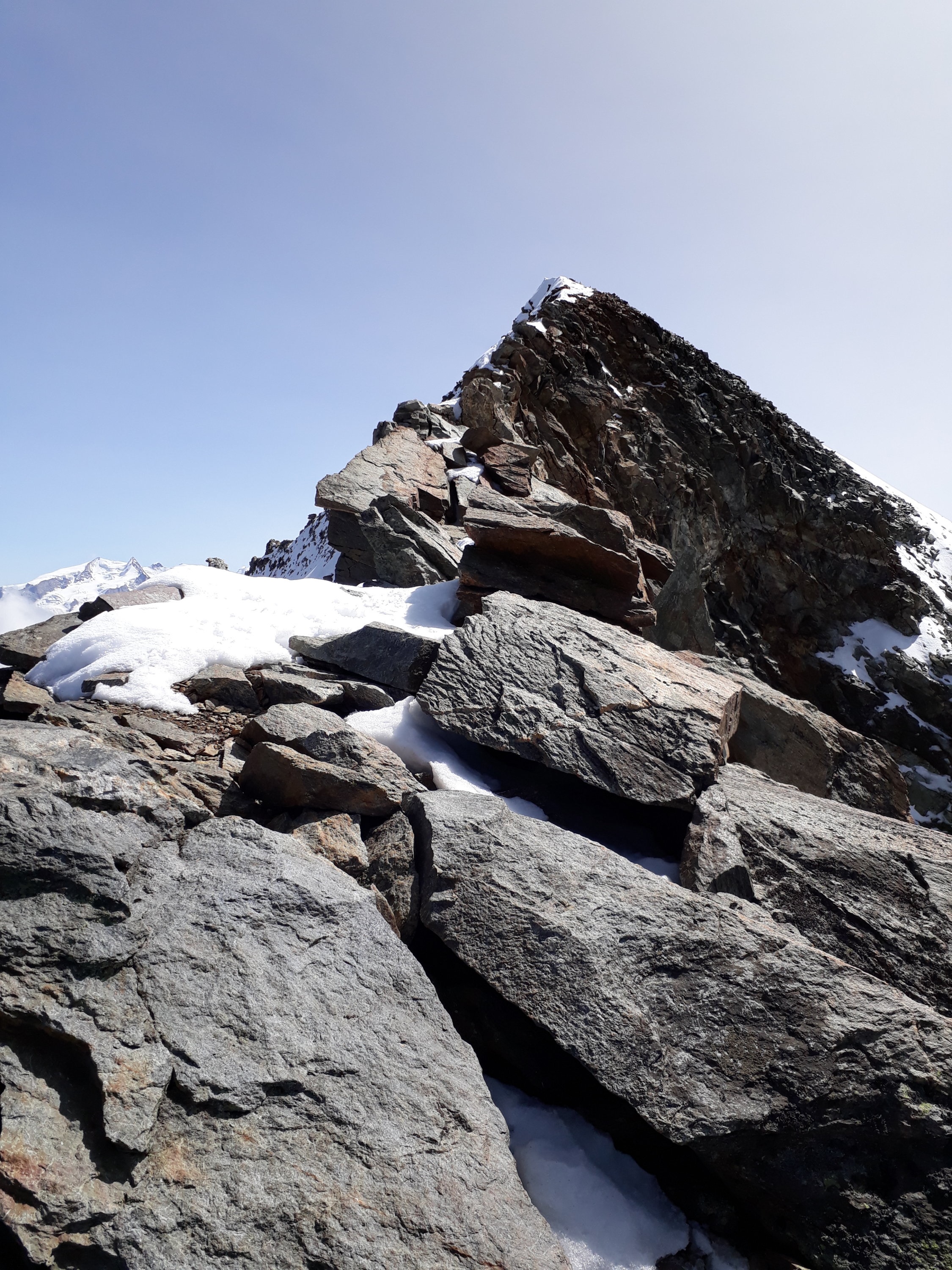 Wir sind in Sichtweite des Gipfels um 12.30 umgekehrt, da unser Zeitmanagement völlig aus dem Ruder lief. Grund: Wir sind, eigentlich wider besseren Wissens, direkt zum Tiefenmattjoch aufgestiegen und haben dann den ganzen (z.T. bröseligen) Grat gemacht. Das zieht sich ganz schön lang im IIIer Gelände hin. Eigentlich hätten wir bis zum markanten roten Turm (den wir mit den ersten roten Felsen verwechselten) und an dem die Ketten bis zum Gletscher runter reichen ! gehen müssen. Von dort turnt man die Ketten kraftvoll aufwärts und gelangt da an den Grat, wo die festen Felsen anfangen. Ab da echt schöne Kletterei in klassischem Gratgelände.