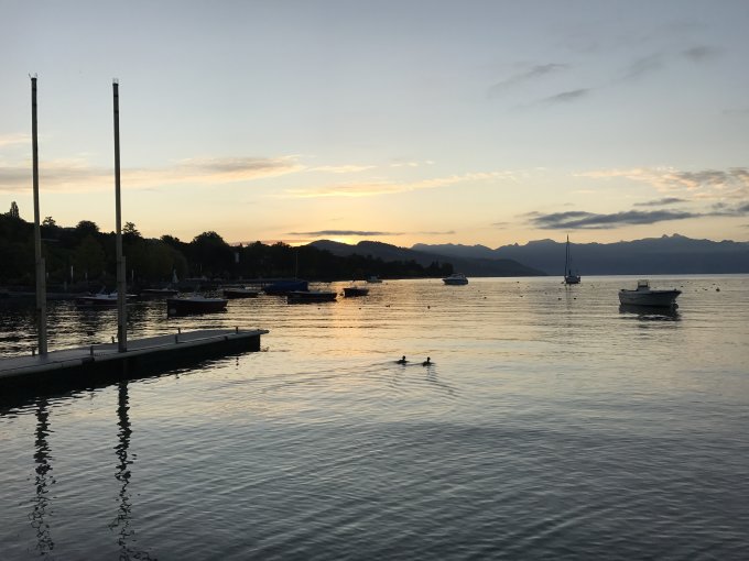 Am Vorabend mit dem Zug nach Lausanne und im Hotel du Port in Ouchy übernachtet. Bei Sonnenaufgang Fahrt mit dem ersten Schiff über den Genfersee bis Evian-les-Bains.