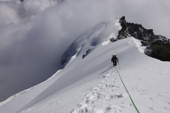 Kaum Wind und die Gletscherspalten gut zu sehen. Alle Sicherungspunkte bei der Kletterstelle sind frei vom Schnee. 30m Seil genügt. Neuschnee weniger als 10cm. Zu Teil am Grat etwas abgeblasen, aber ohne Blankeis.