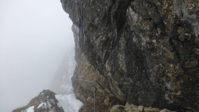 Es herrschte kaum Wind. Wolken und Nebel umwabberten jedoch stets die Gipfel und Flanken. Ein paar Regentropfen und leichtes Schneeflümmslen störten nicht. Ab Lochtem lag Trittschnee, der manchmal auch tragfähig war - auf Ausrutschen war zu achten. Da ich meine Stiegeisen mitschleppte, zog ich diese am Lisengrat an. Mit dem Schnee fand ich sowohl im Aufstieg zum Säntis, als auch auf dem Lisengrat hochtourenartige Verhältnisse vor.