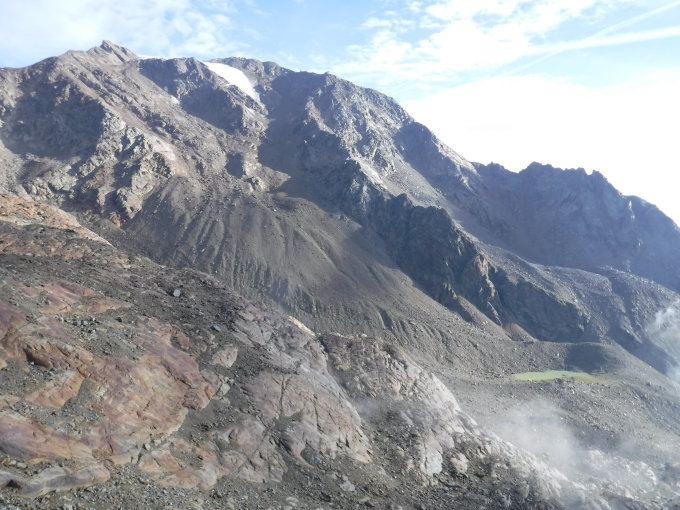 Blick zu den Gletschern Vadretta Roassa im Nordosten und Ghiaccigio dei Forni im Westen unterhalb des Gipfels. Im Süden sieht man nur noch oberen Rest der Vadretta di Vioz. Der felsige Südwestgrat zur Punta Taviela ist kaum noch verfirnt. Eine Hochtour (gelbe Striche am Fels) führt nordseitig über den Fornigletscher zum Pta. Taviela. Von dortigem Felsgipfel kann man über den Südostgrat absteigen zur Bergstation der Großkabinen-Seilbahn „Pejo 3000“. Aussichten in die Täler nach Sulden (ca. 14 km Luftlinie), oder Peio (ca. 6 km Luftlinie) hat man nicht.