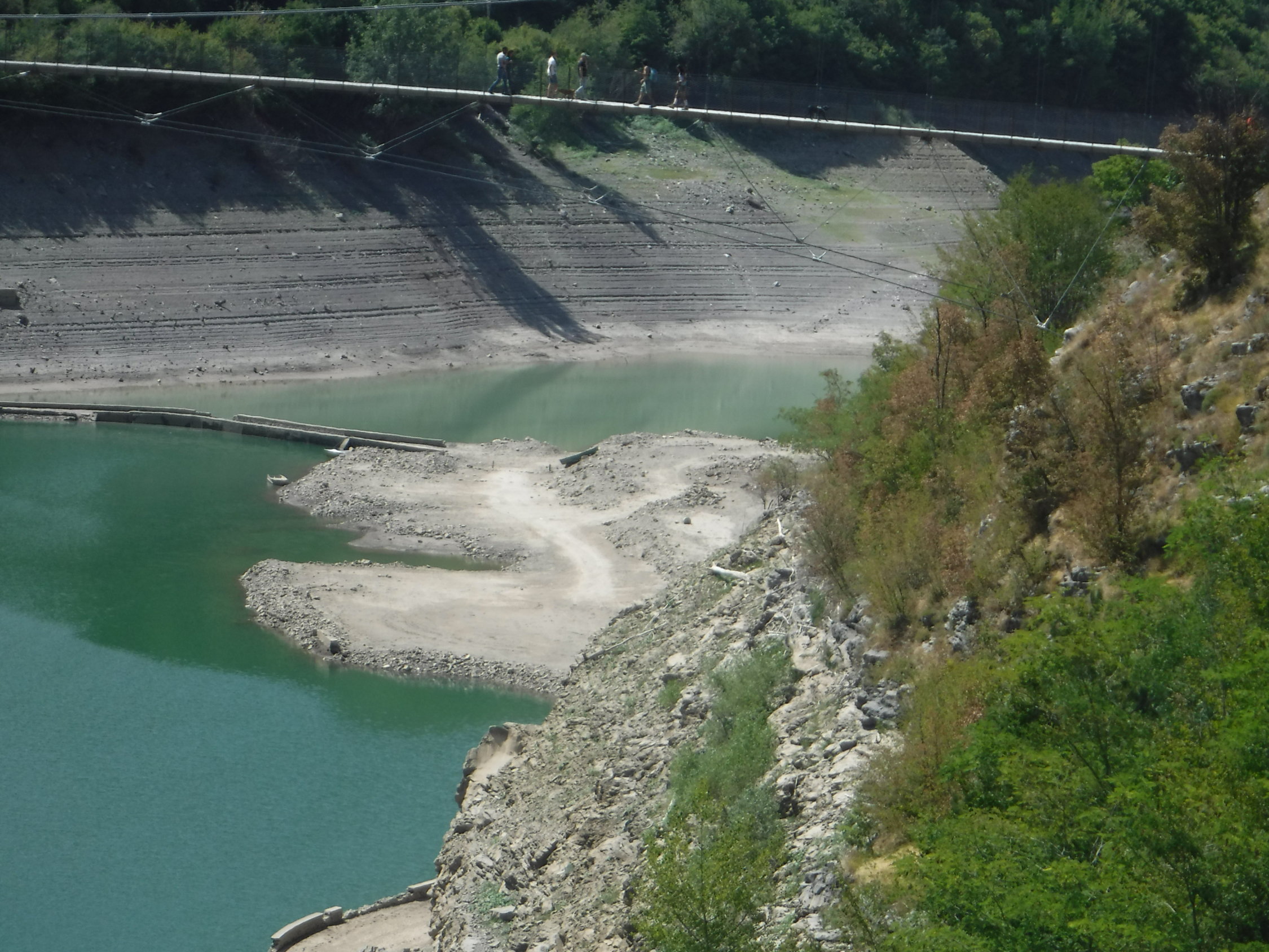 Der Stausee führte wegen anhaltender Niederschlagsarmut nur noch wenig Wasser. Sichtbar wurden die alte Zufahrtstraße durch das Tal und Pfeiler der alten Brücke, bevor damals das Tal geflutet wurde.